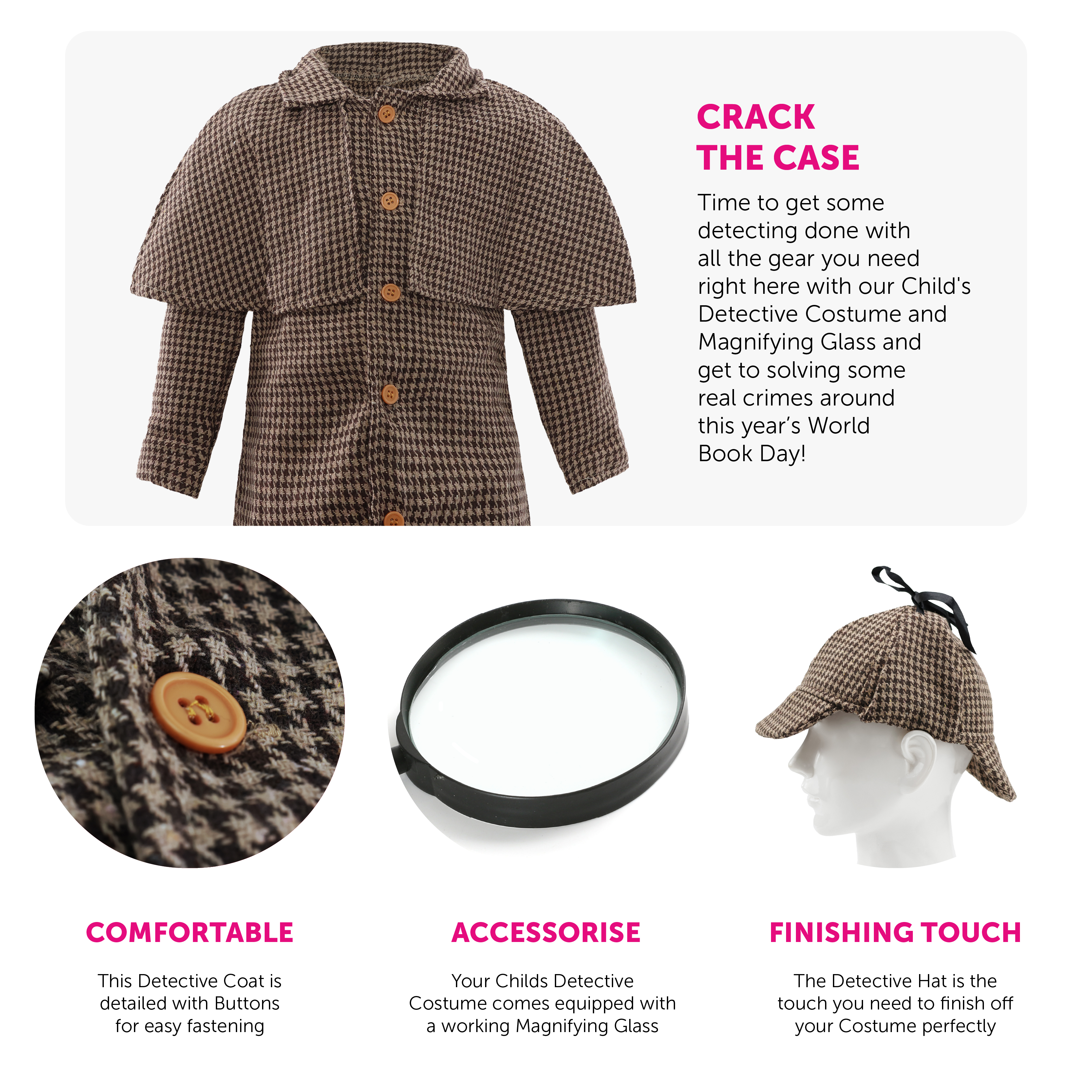 CHILD'S DETECTIVE COSTUME & MAGNIFYING GLASS: Time to get some detecting done with all the gear you need right here with our Child's Detective Costume and Magnifying Glass and get to solving some real crimes around this year’s World Book Day!