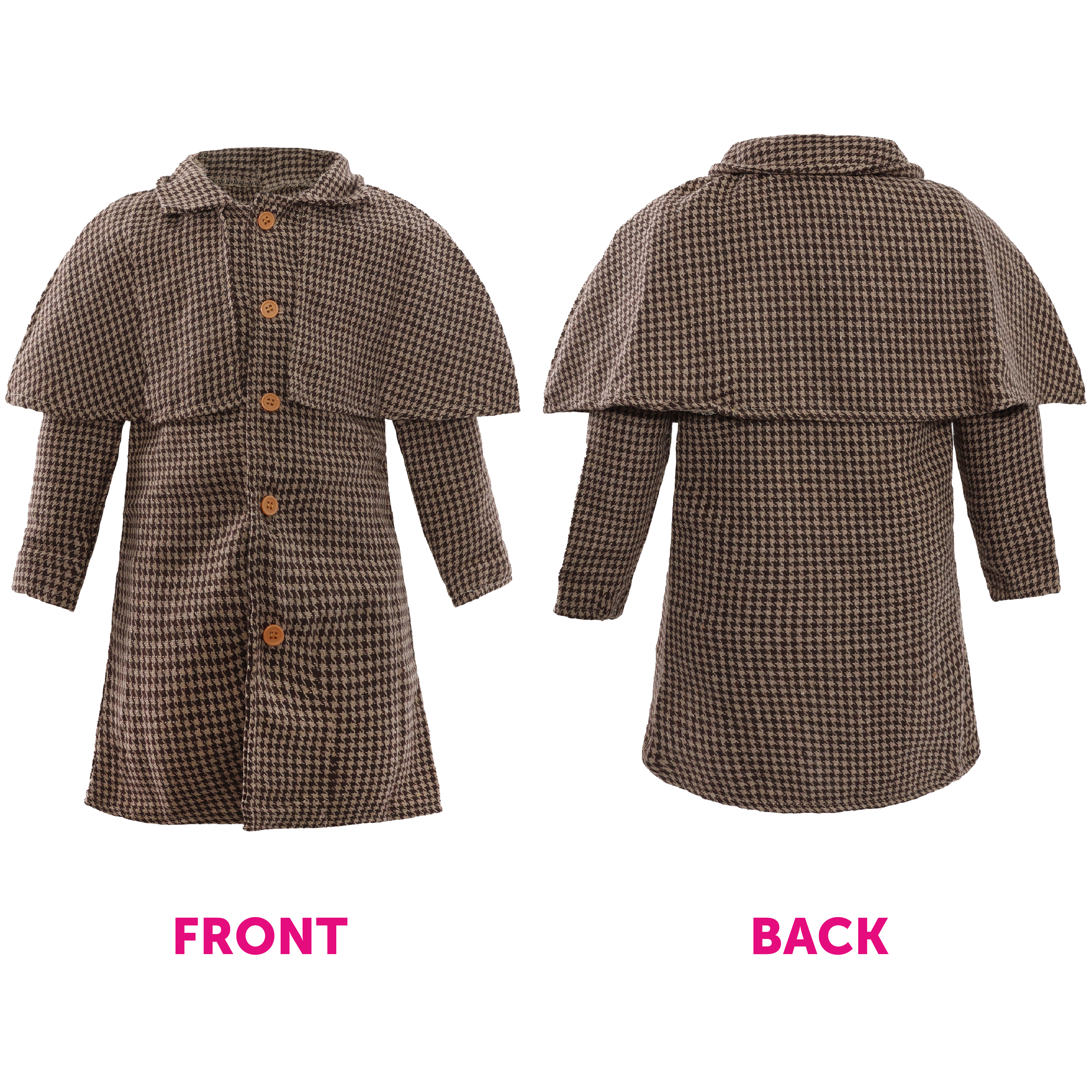 COSTUME INCLUDES: This Child's Detective Costume includes a traditional style, Brown Deerstalker Hat with a matching Victorian Coat, detailed with a Shoulder Cape and Buttons, and a working Magnifying Glass, a great outfit to accompany a brilliant investigator such as yourself to solve only the finest and puzzling of crimes!