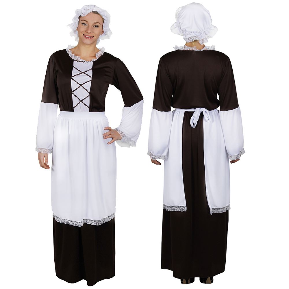 COSTUME INCLUDES: Your Ladies Tudor Maid Costume includes a White Bonnet Hat, a Dark Brown Dress with a Lace Neckline, White Sleeves detailed with delicate Lace edging and a matching detailed White Apron, the perfect Costume for any event!