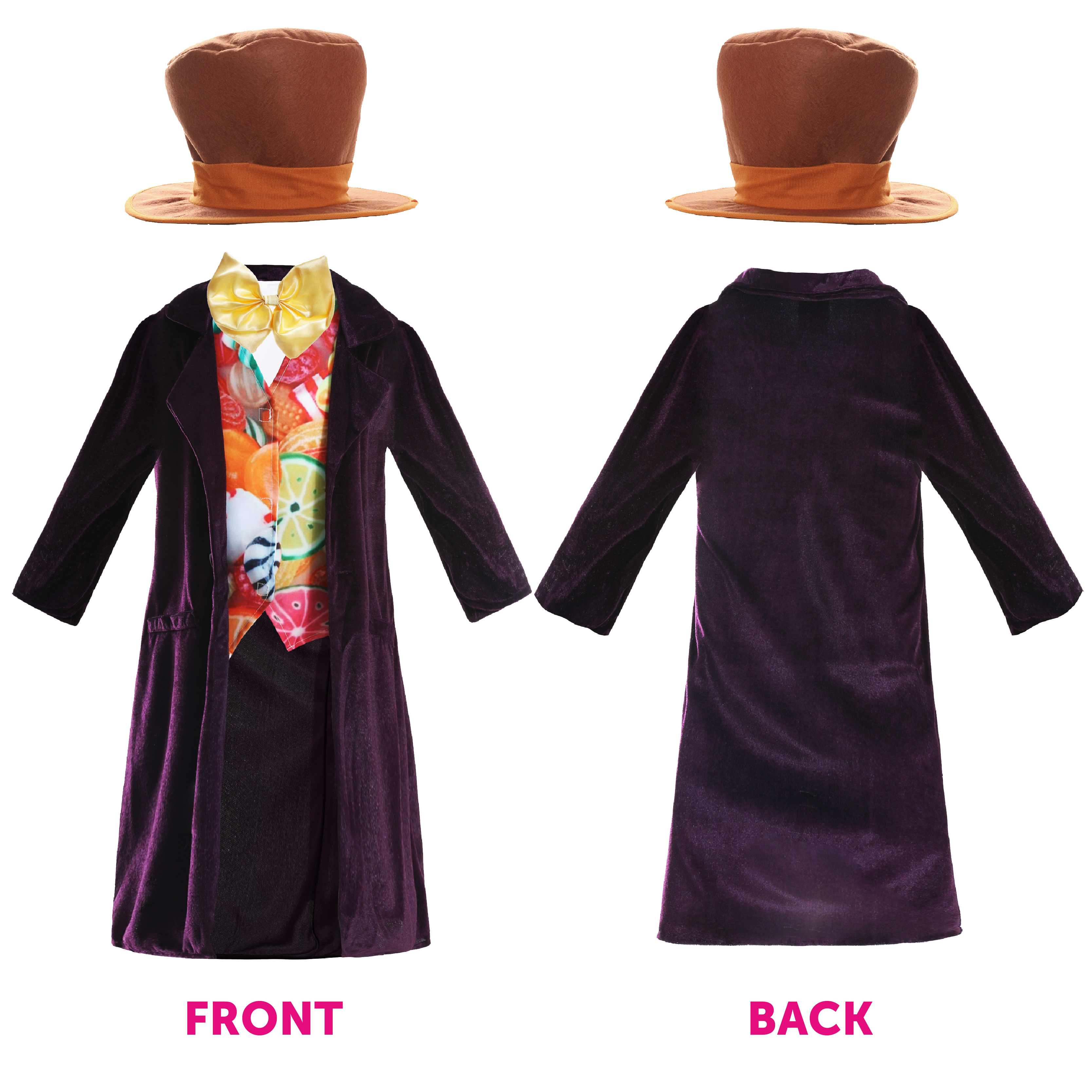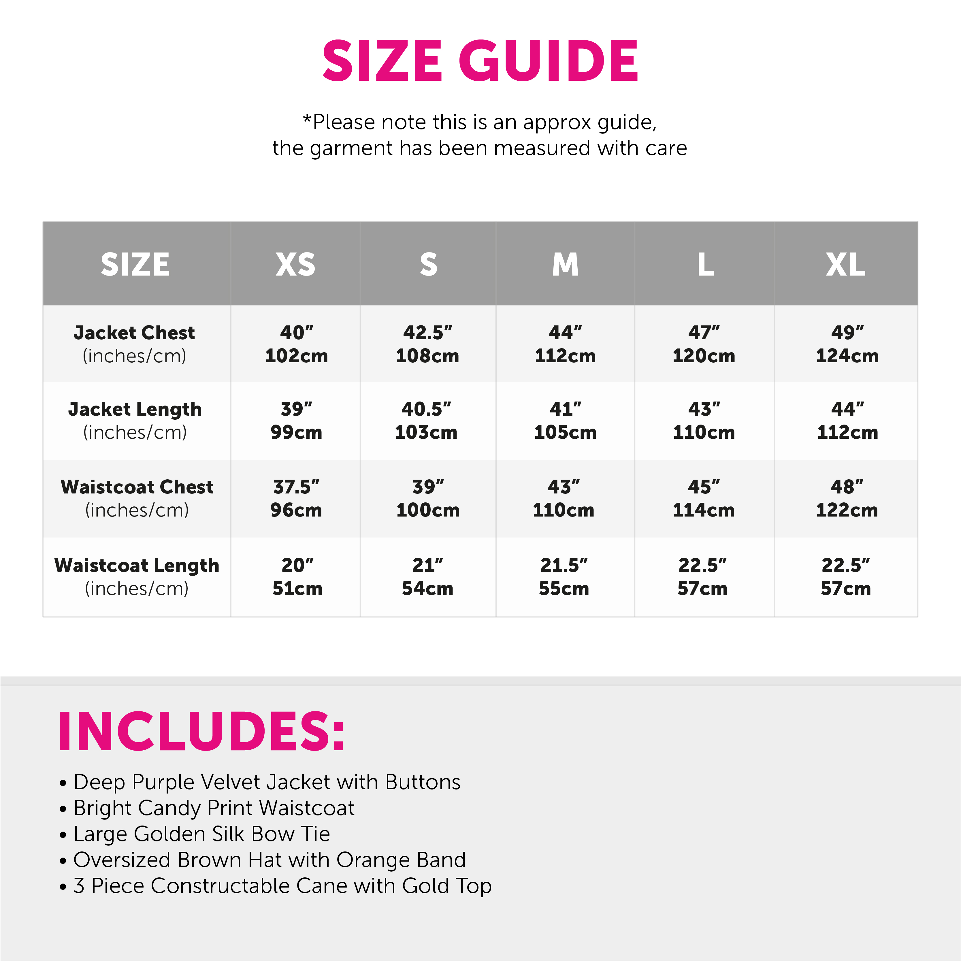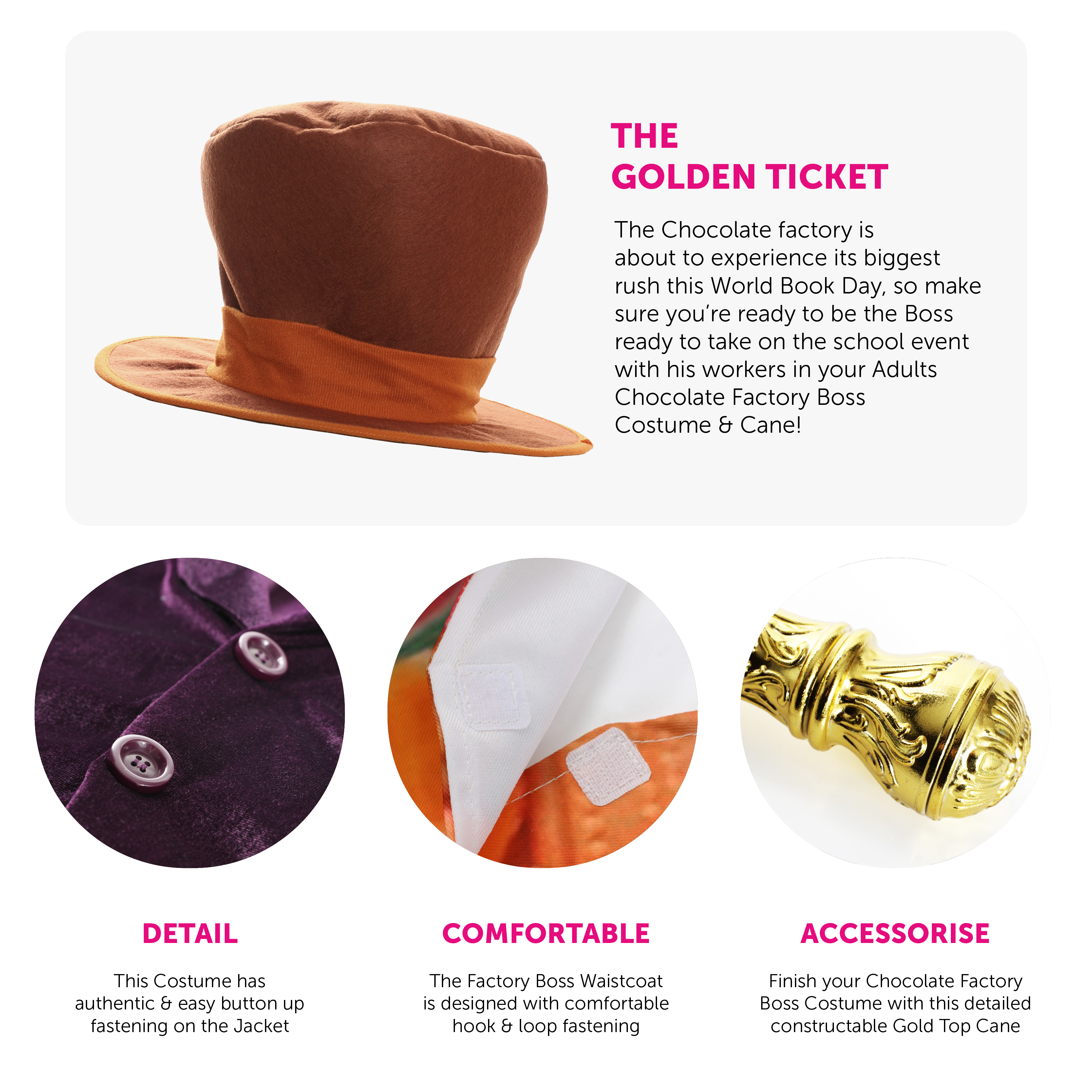 COSTUME INCLUDES: Your Adults Chocolate Factory Boss Costume includes a Deep Purple Velvet Coat, a Bright Candy Print Waistcoat with Buttons, a Large Silk Golden Bow Tie, an Oversized Brown Hat with Orange Band, and a 3 piece constructable Cane with a detailed Gold Top, the perfect look for World Book Day!