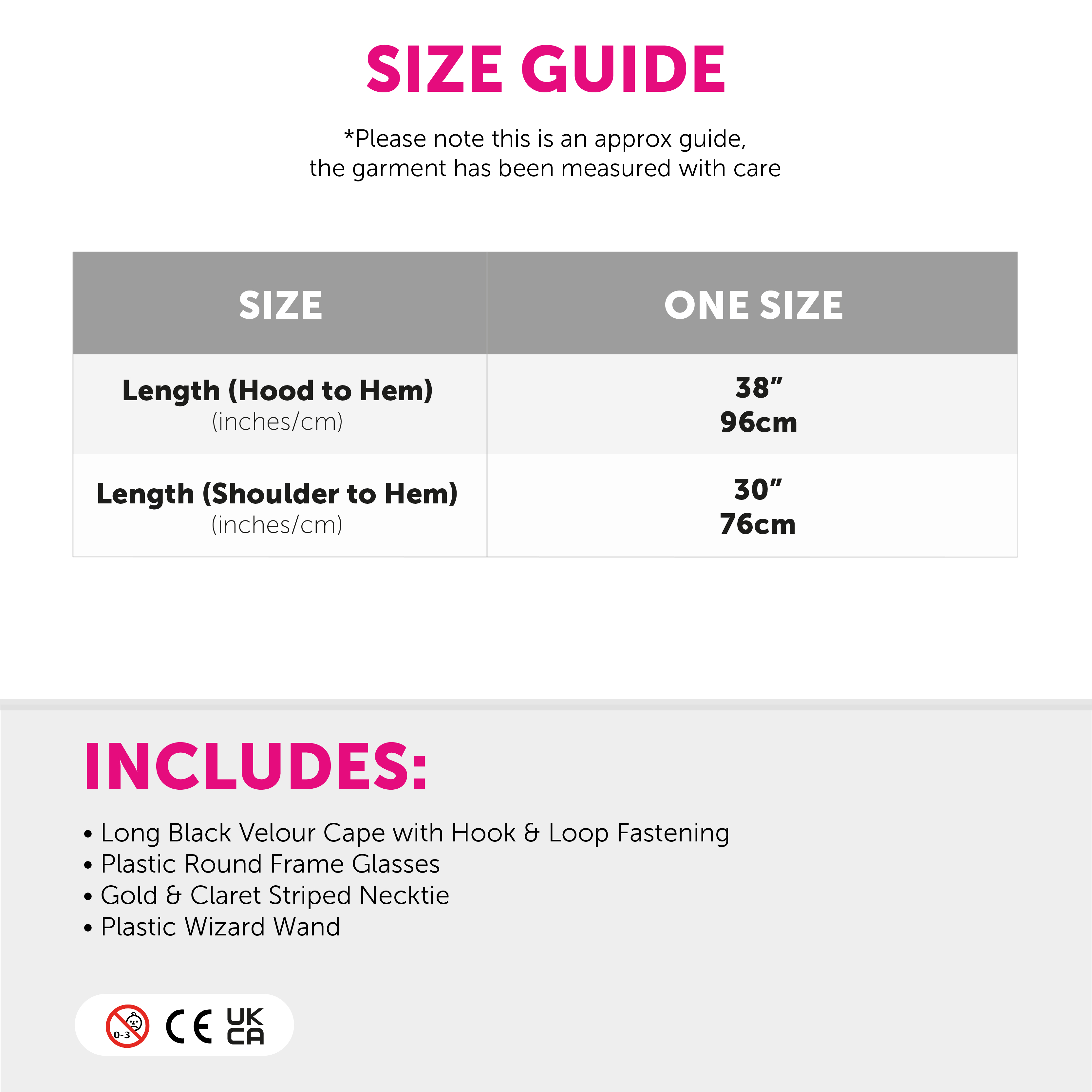 AVAILABLE IN ONE SIZE: The Child's Wizard Costume is available in one size, with the hood up the Black Velour Cape measures a full length of 38" (96cm) and without the hood measures a length of 30" (76cm)