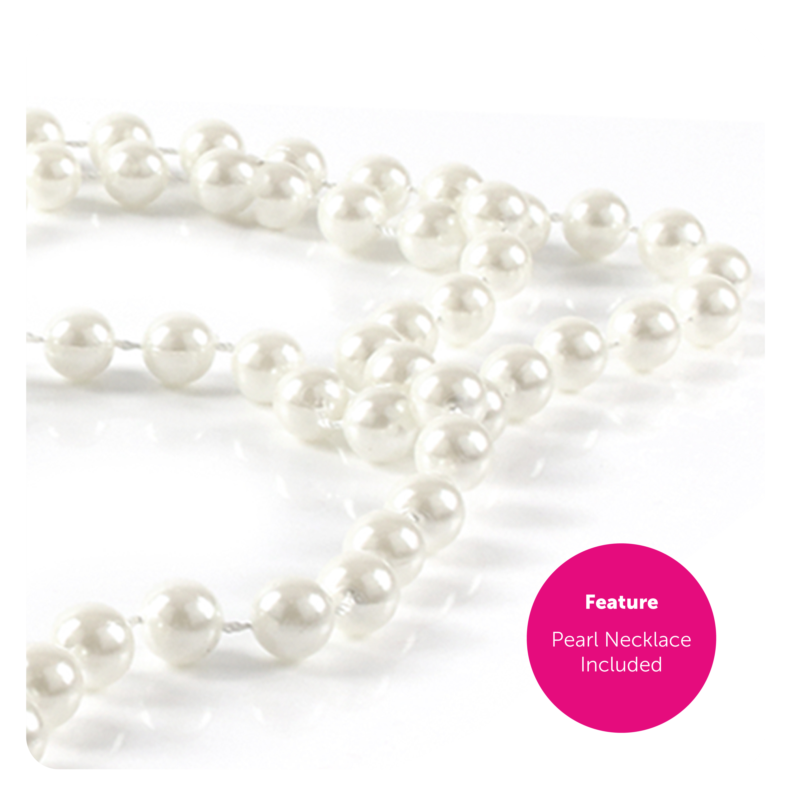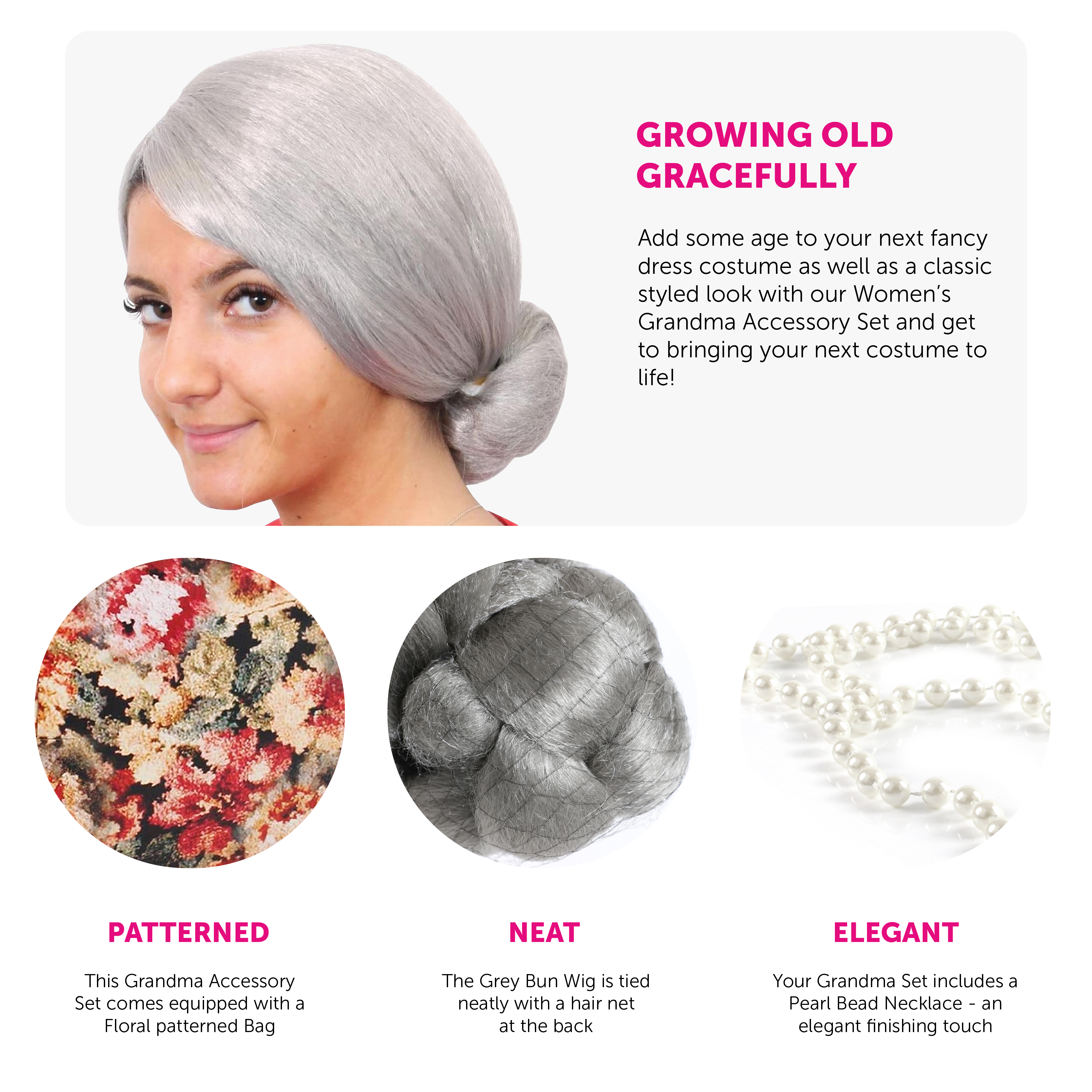 ACCESSORY SET INCLUDES: Your Ladies Grandma Accessory Set includes a Grey Wig tied into a neat Bun, a Long Pearl Bead Necklace and a Cardboard Floral Carpet Bag with a Brown Handle to complete your costume!