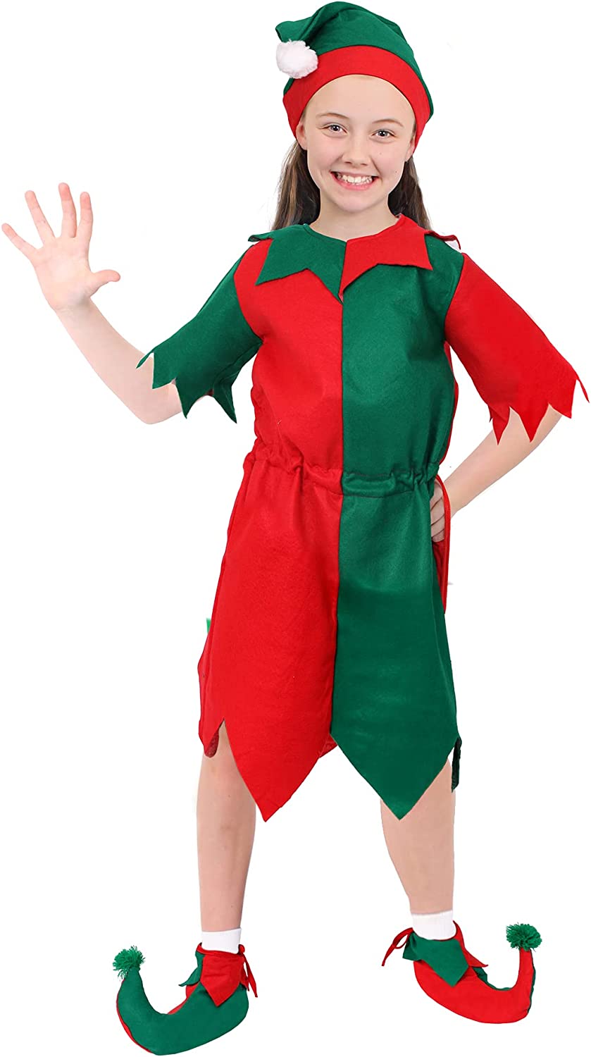 - GIRLS ELF COSTUME: Traditional red and green elf costume with drawstring for a perfect fit for all shapes and sizes.