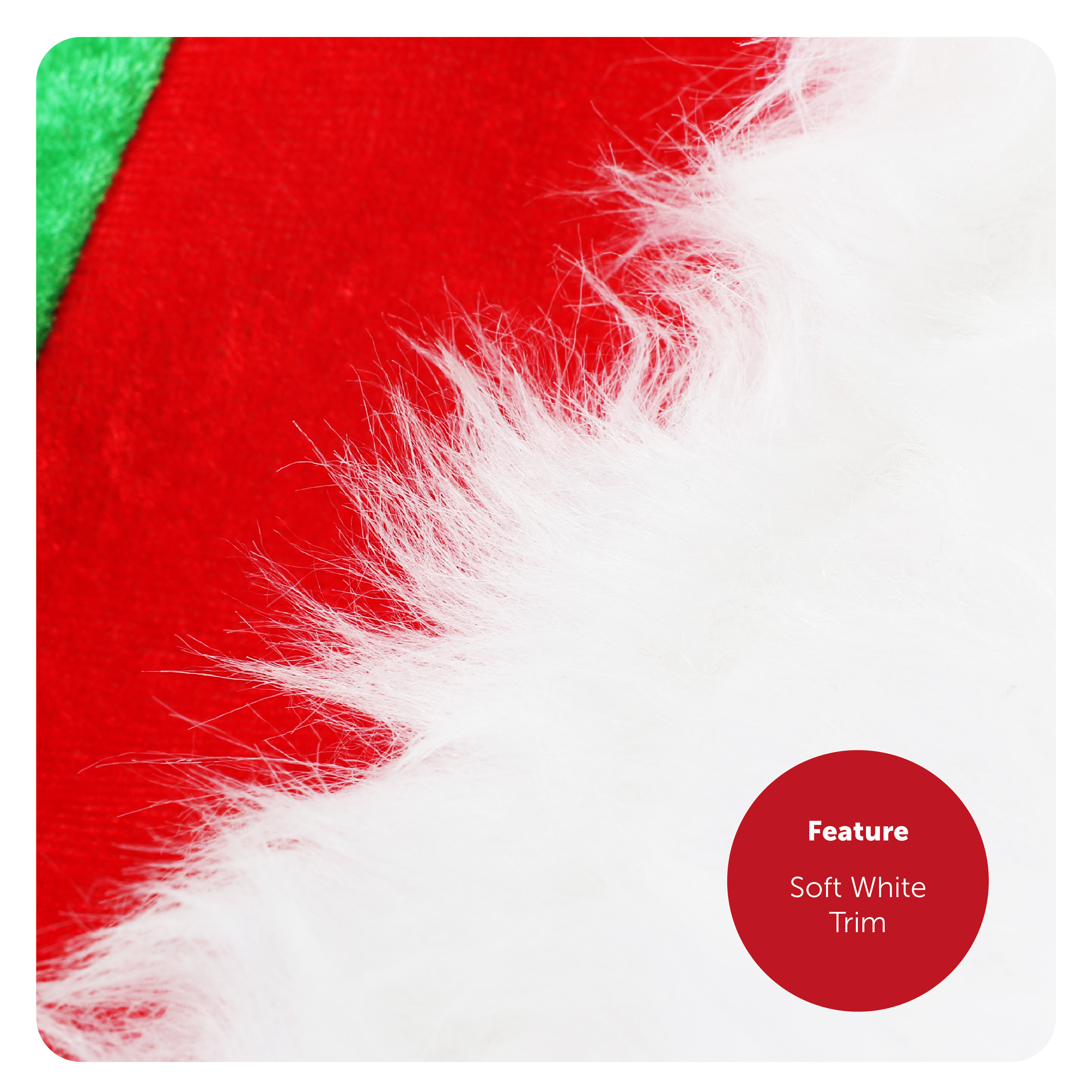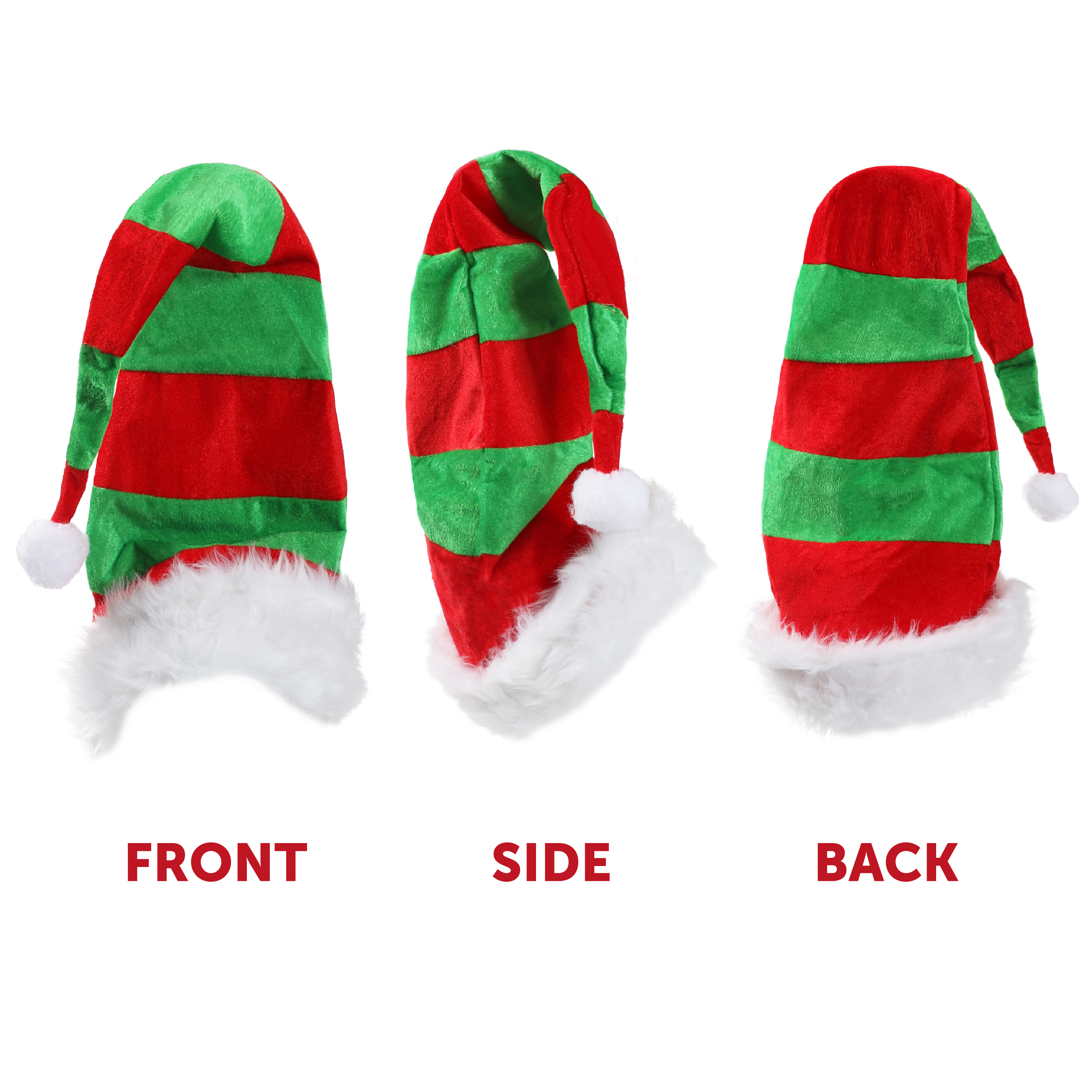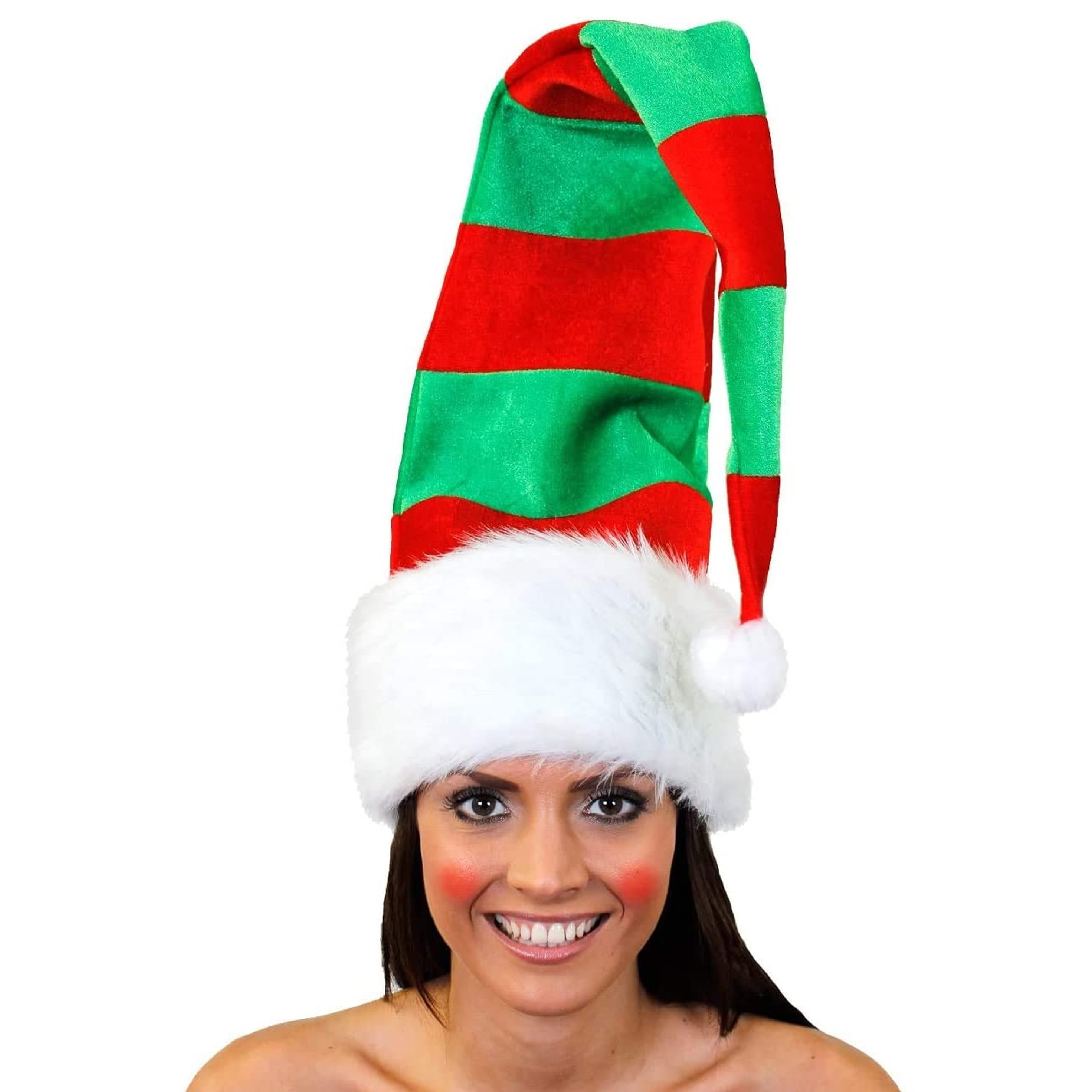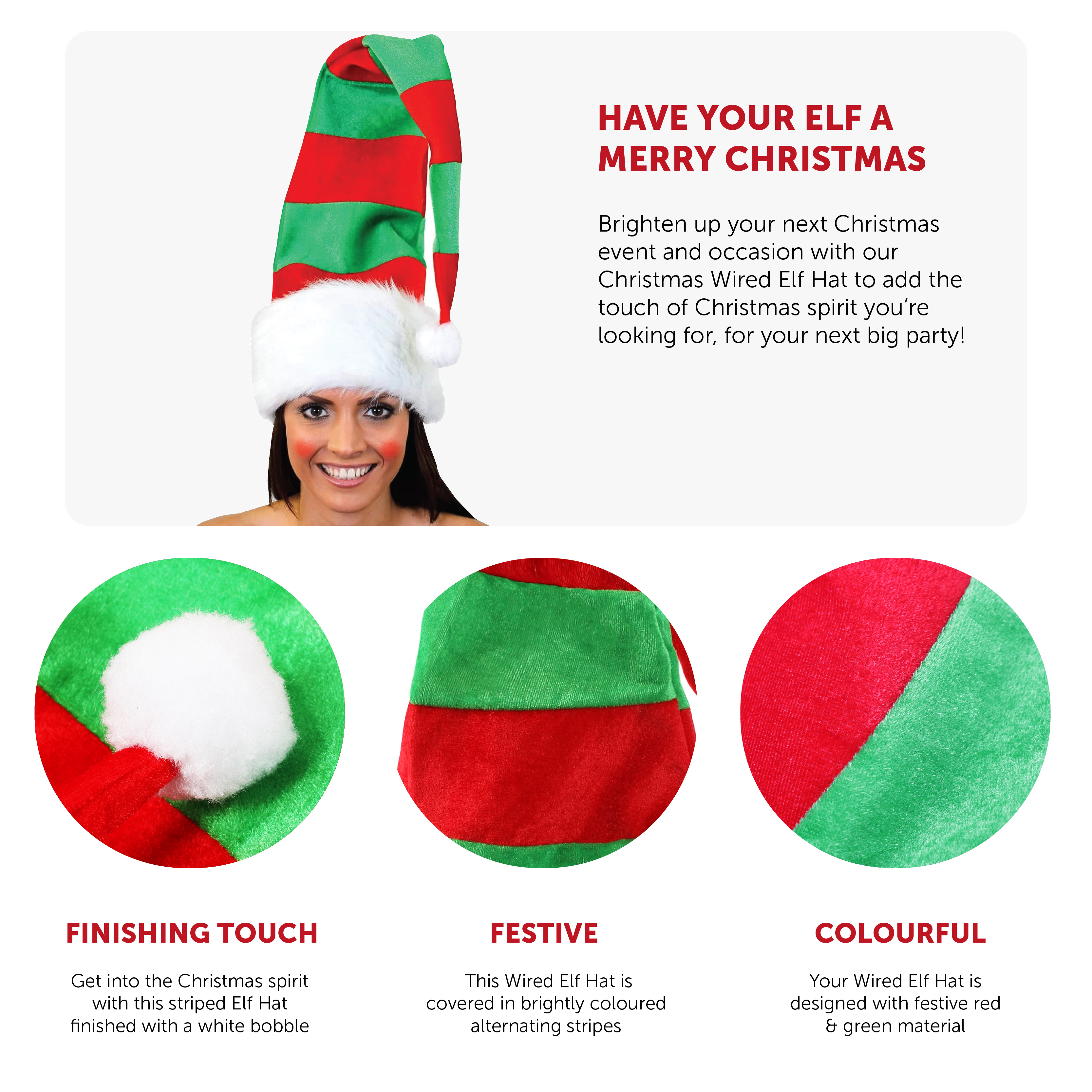 WIRED ELF HAT DETAILS: Your Wired Striped Elf Hat is a comfortable Christmas hat, featuring a classic Elf colour scheme and design, made from soft plush material, fur brim and pom-pom, and a wire to make your hat stand up comedically tall!