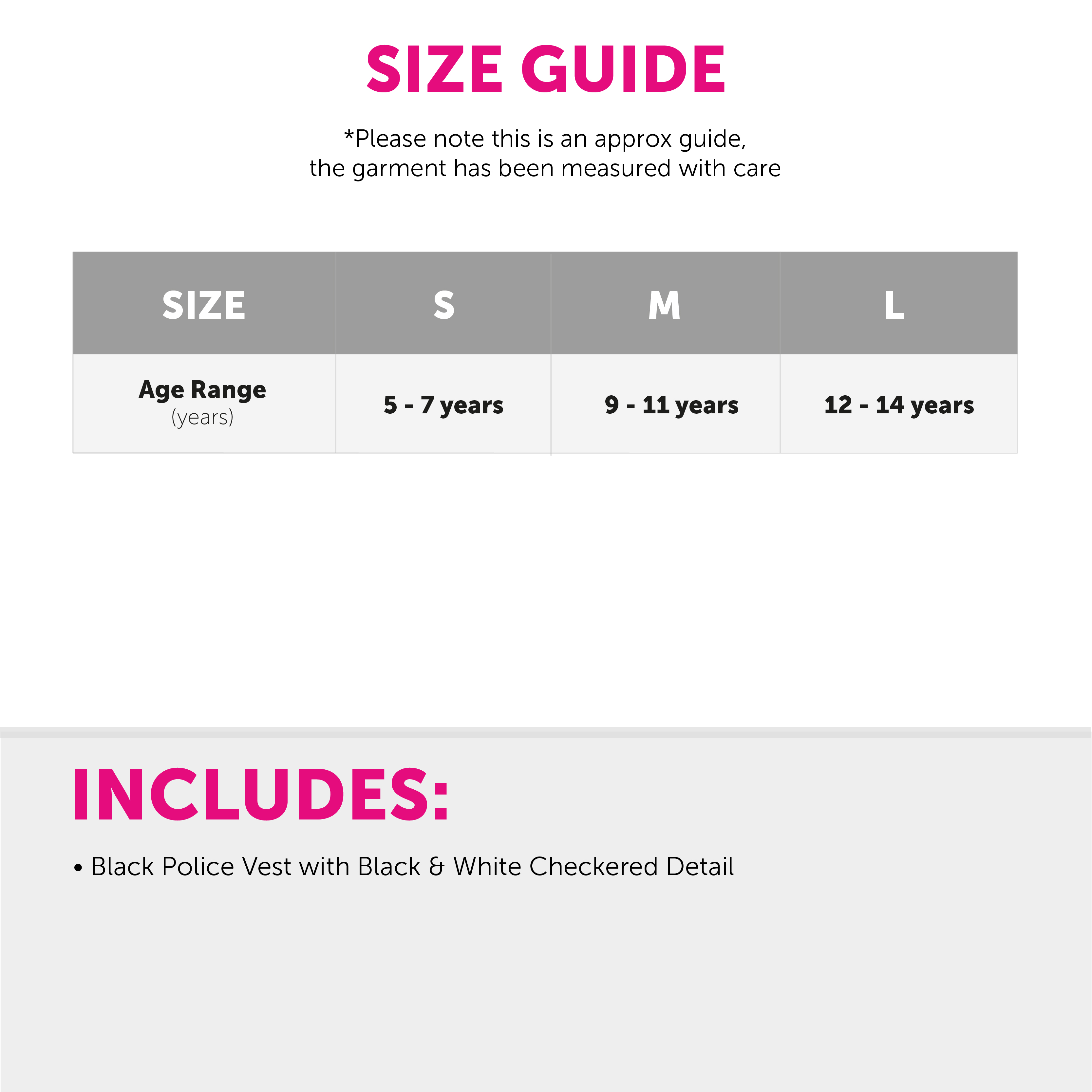 VEST DETAILS: Your Child's Police Officer Vest Costume is a Black Police Vest with Checkered Black and White details across the chest and shoulders, the perfect look for anyone to wear at any fancy dress occasion!