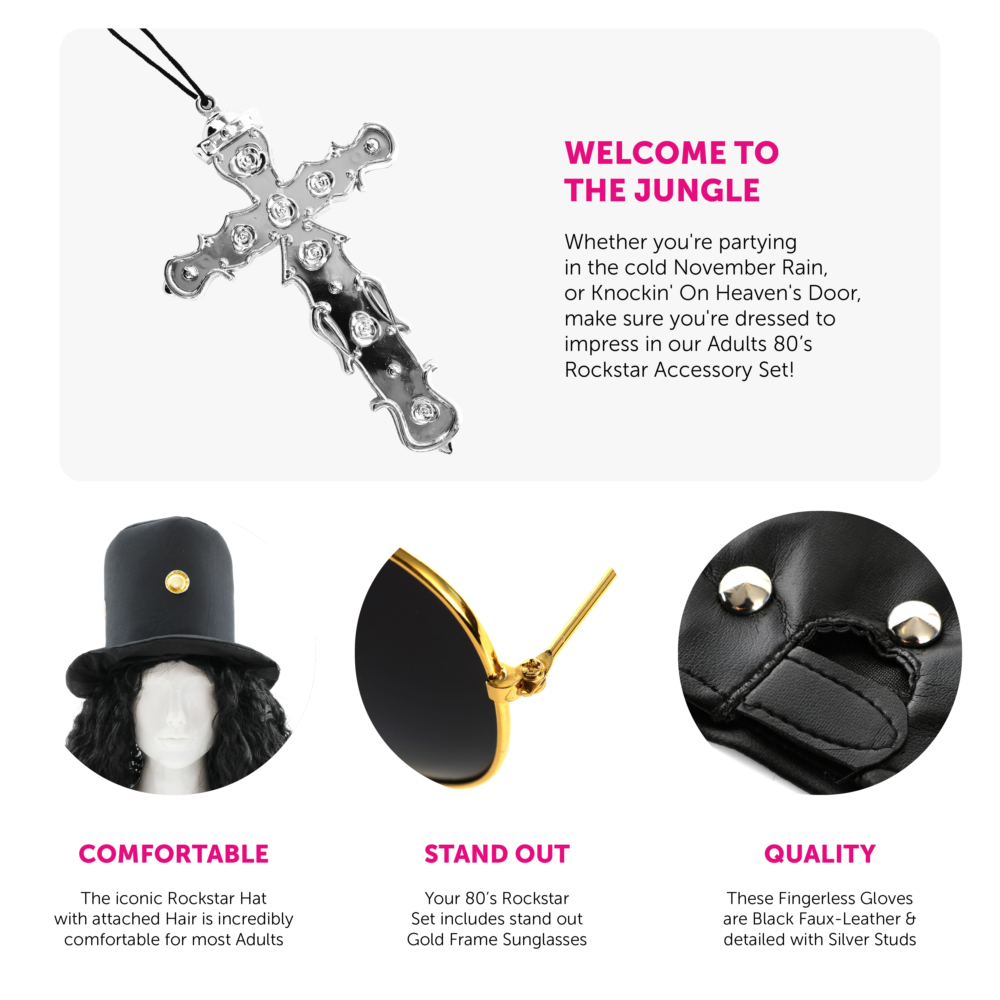 ONE SIZE FITS MOST: Your 80's Rockstar Accessory Set fits most Adults comfortably with the Top Hat, Black Wig, Cross Necklace, Sunglasses and Studded Gloves all being a suitable one size - you'll look great and feel comfortable!
