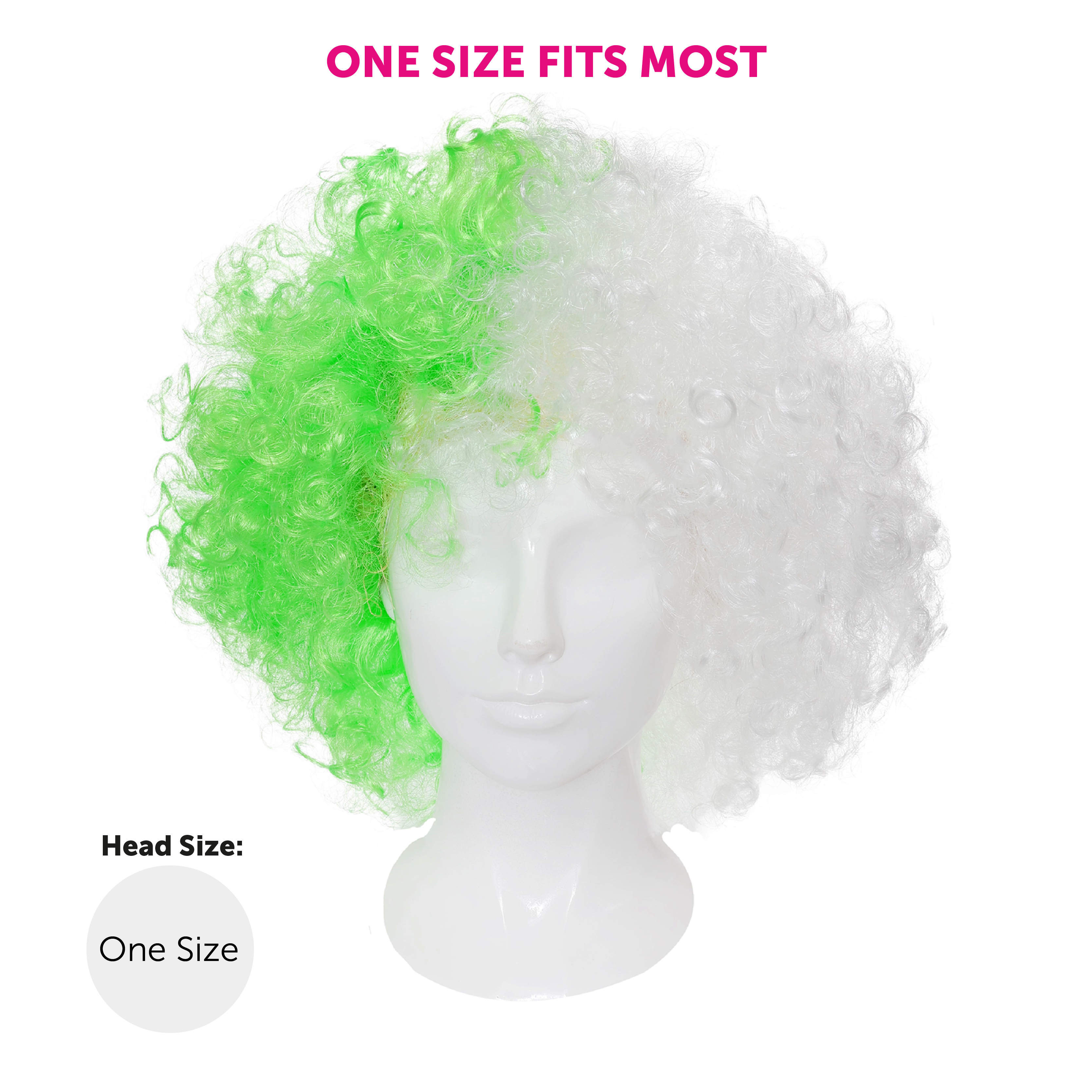 GREEN AND WHITE AFRO WIG: Nothing spells an enjoyable night than having a new look for the occasion, so why not make it stand out with our Green and White Afro Wig, a fantastic wig for you to transform yourself for a long night filled with new memories to make!