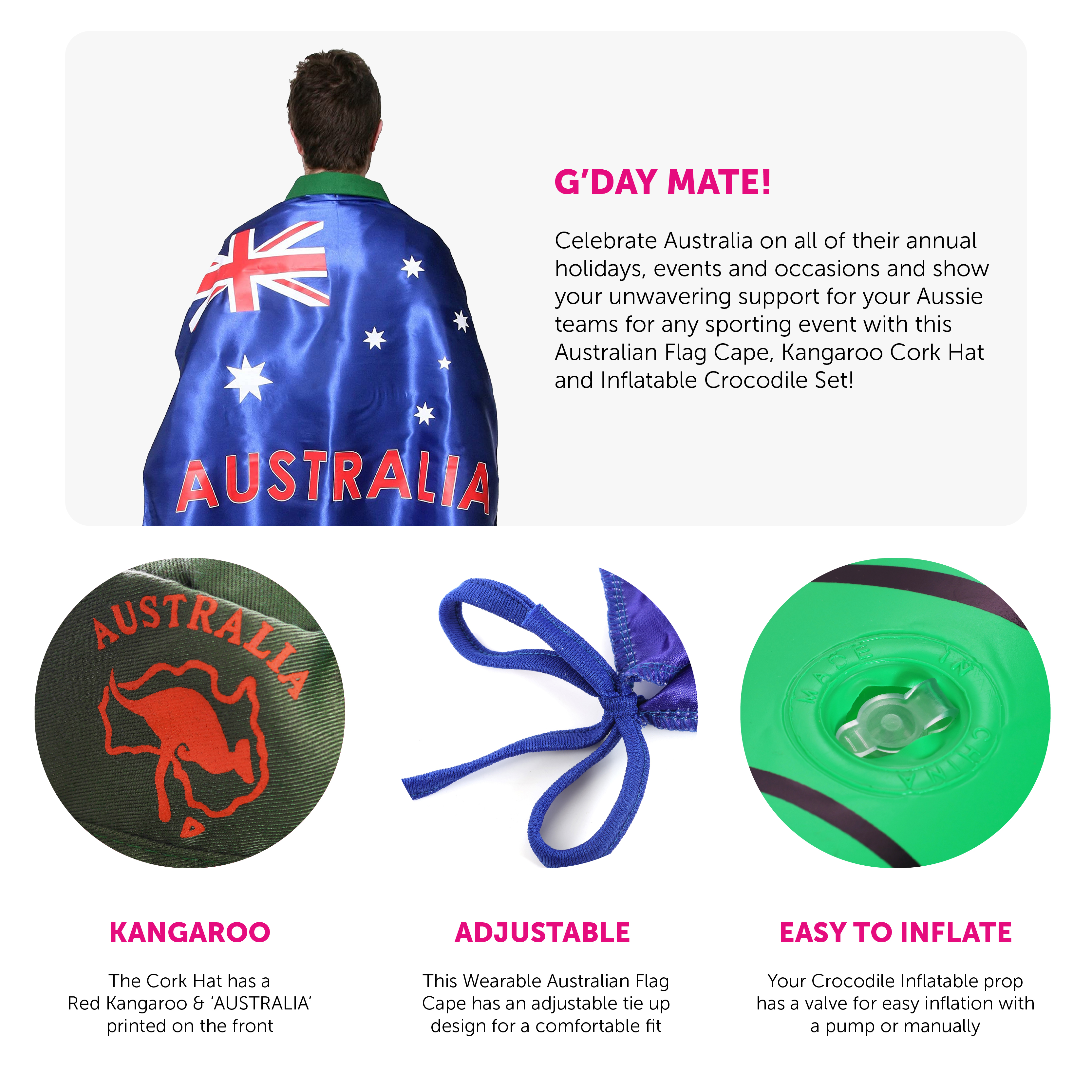 SET INCLUDES: Your Australian Set includes a Blue, Satin-Feel Australian Flag Cape, with 'AUSTRALIA' printed in Red Letters, and easy to tie up fastening, a large Green Inflatable Crocodile with an easy to inflate design, and a quality Green Hat with a red Kangaroo Print and 'AUSTRALIA' on the front and corks hanging by string attached all around the brim, the perfect look for all Australian events!