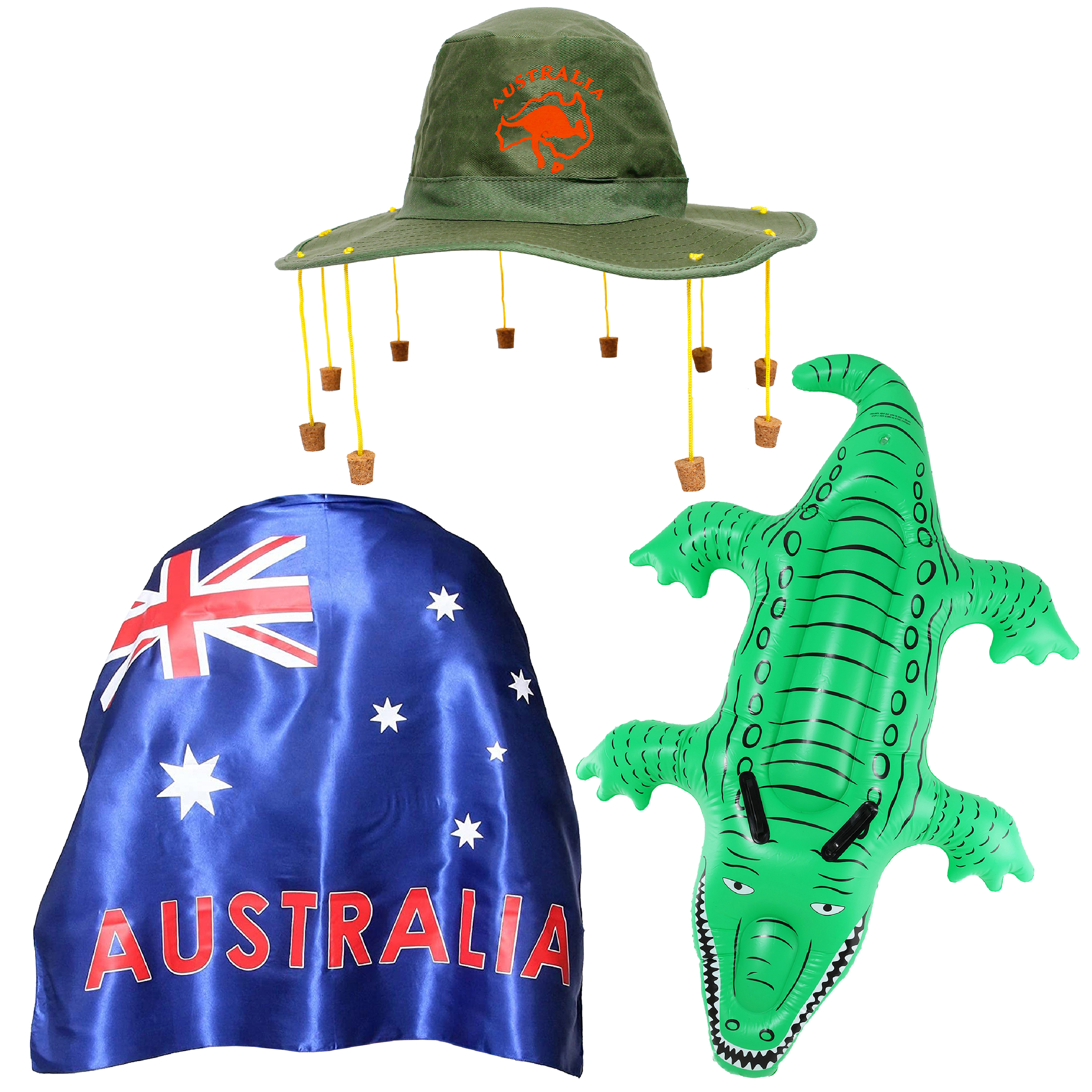 Aussie Day Set - Flag Cape, Kangaroo Cork Hat & Inflatable Crocodile