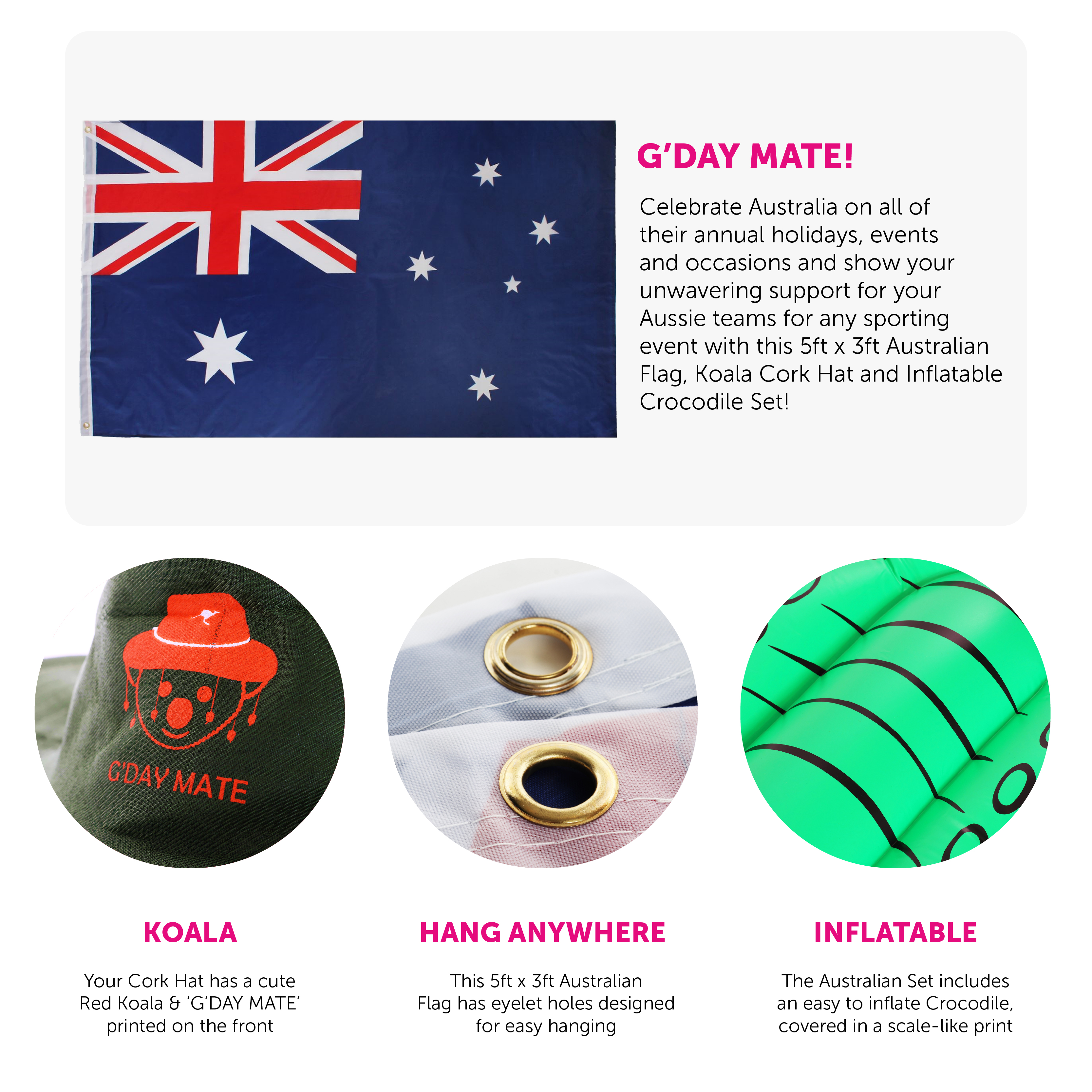 SET INCLUDES: Your Australian Set includes a 5ft x 3ft Australian Flag with eyelet holes for easy hanging, a large Green Inflatable Crocodile detailed with a skin-like pattern on its back, and a quality Green Hat with a Red Koala Print on the front reading 'G'DAY MATE', and corks hanging by string attached all around the brim, the perfect look for all Australian events!
