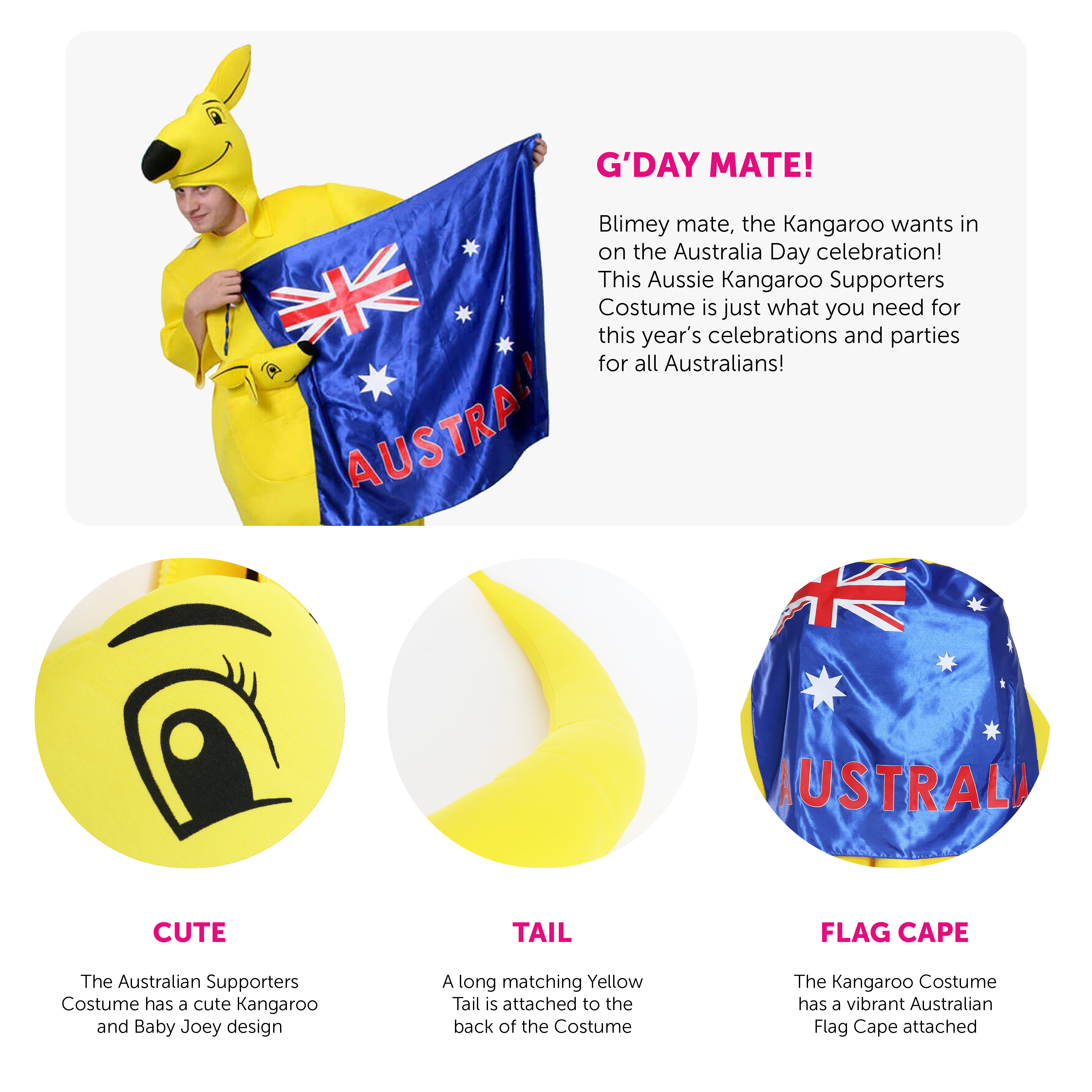 AUSTRALIAN KANGAROO COSTUME: Blimey mate, the Kangaroo wants in on the Australia Day celebration! This Aussie Kangaroo Supporters Costume is just what you need for this year’s celebrations and parties for all Australians!