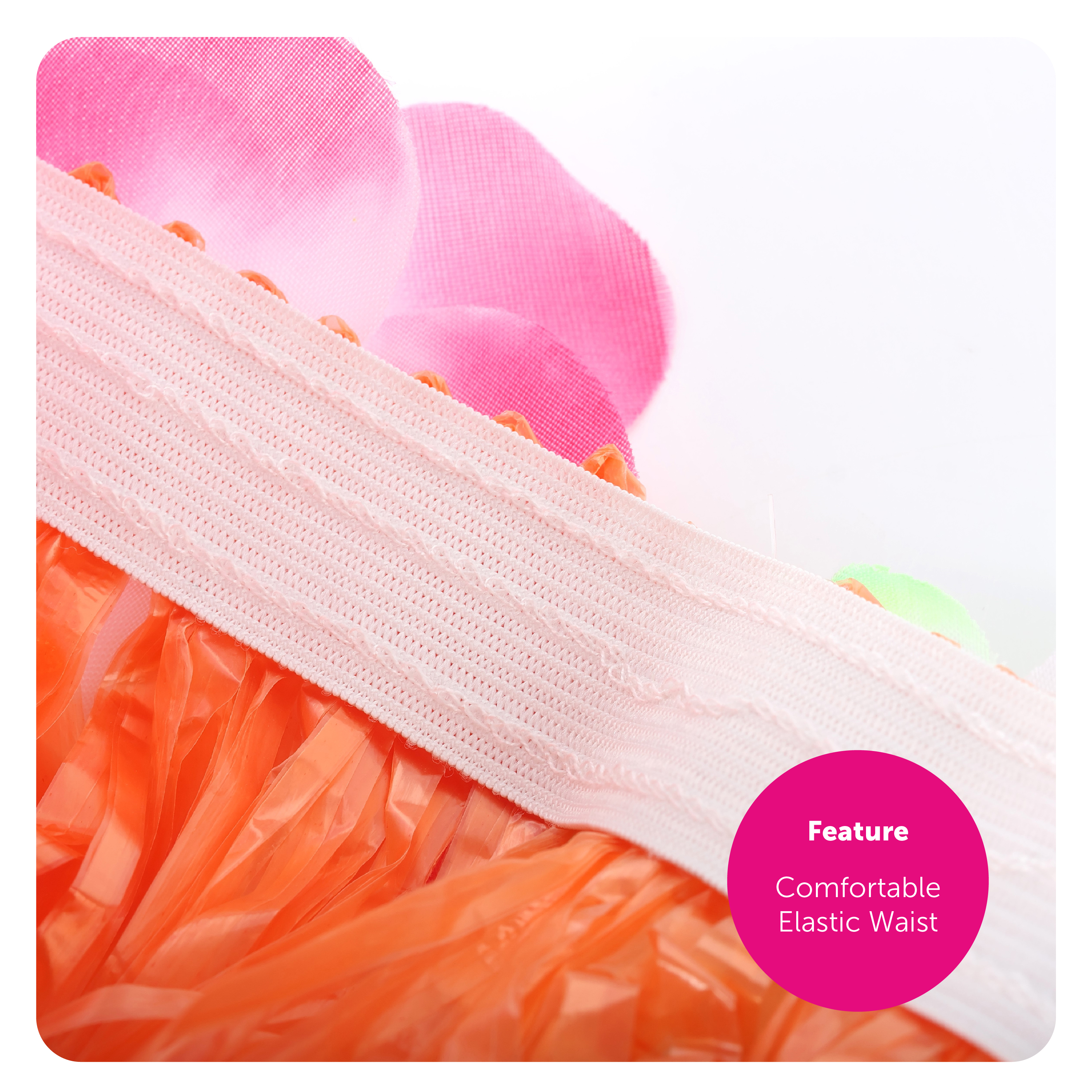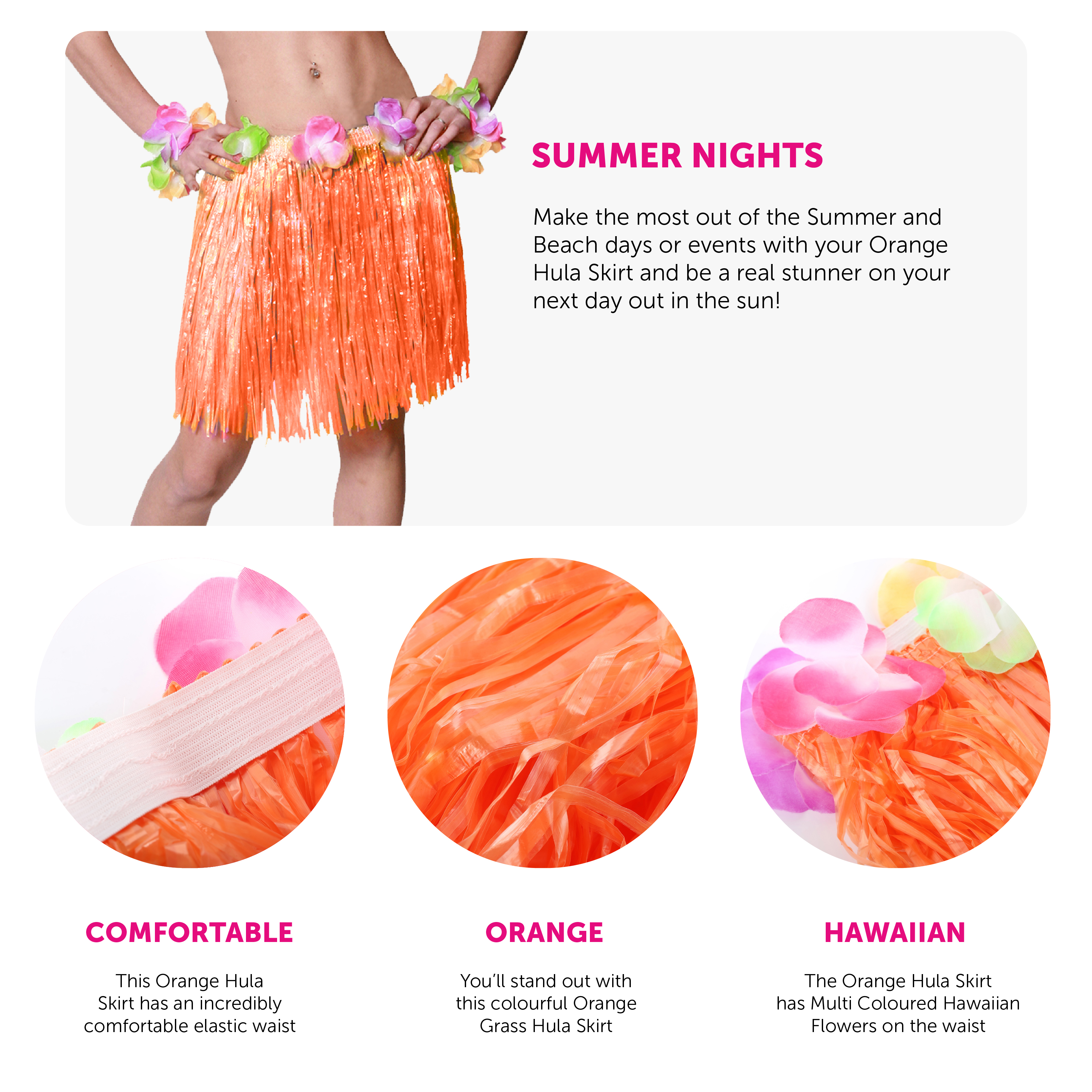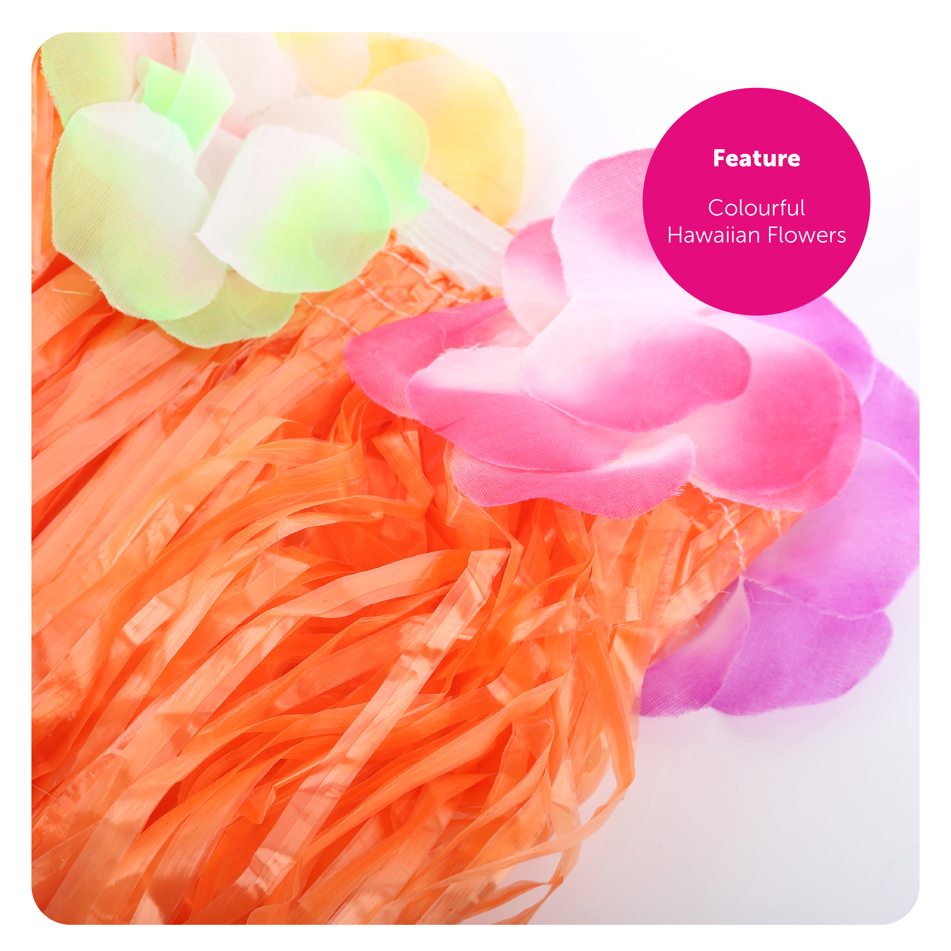 HULA SKIRT DETAILS: Your Hula Skirt is an Orange, grass-like Skirt with an elasticated waistband and multi coloured decorative Hawaiian Lei Flowers, all tropical and ready for the beach!