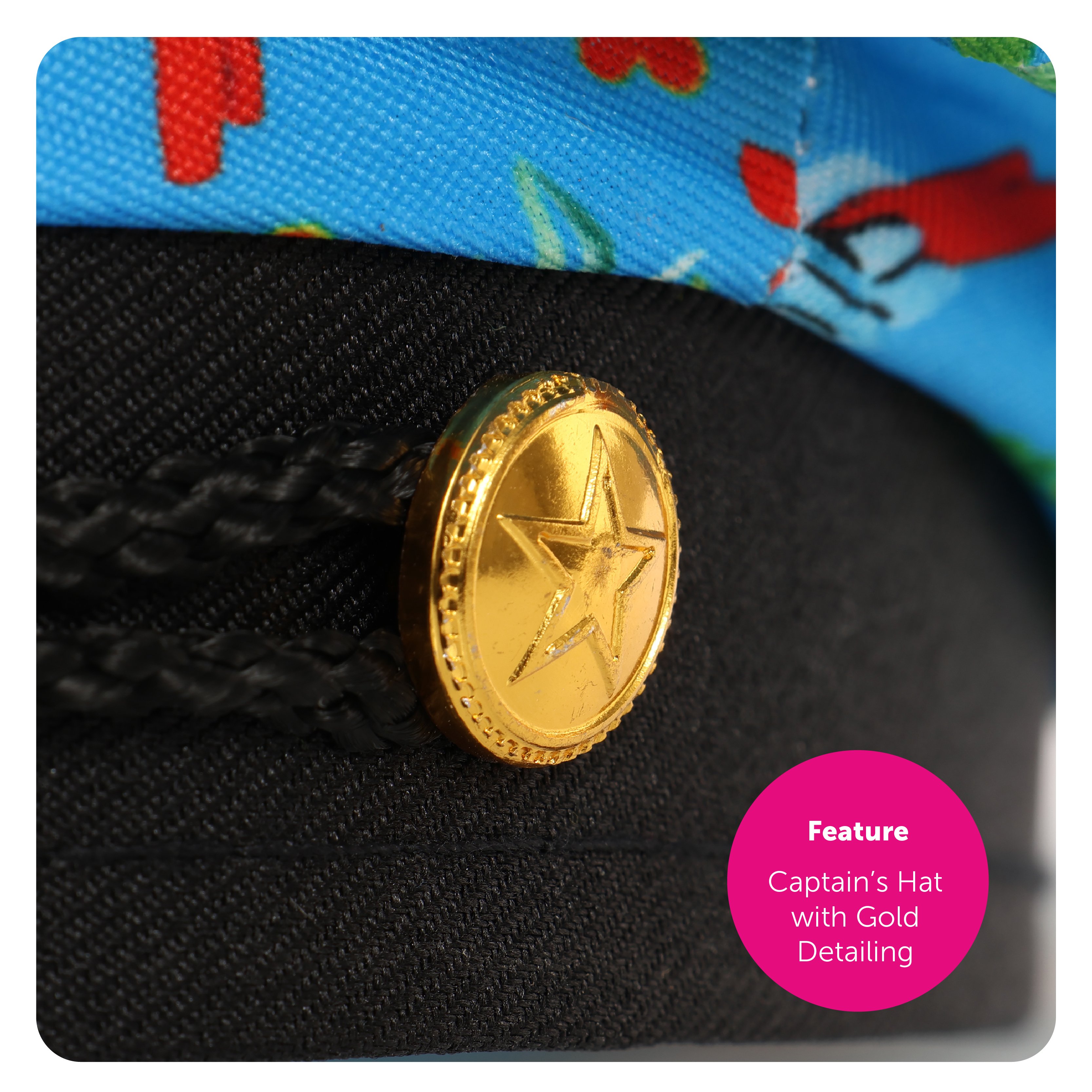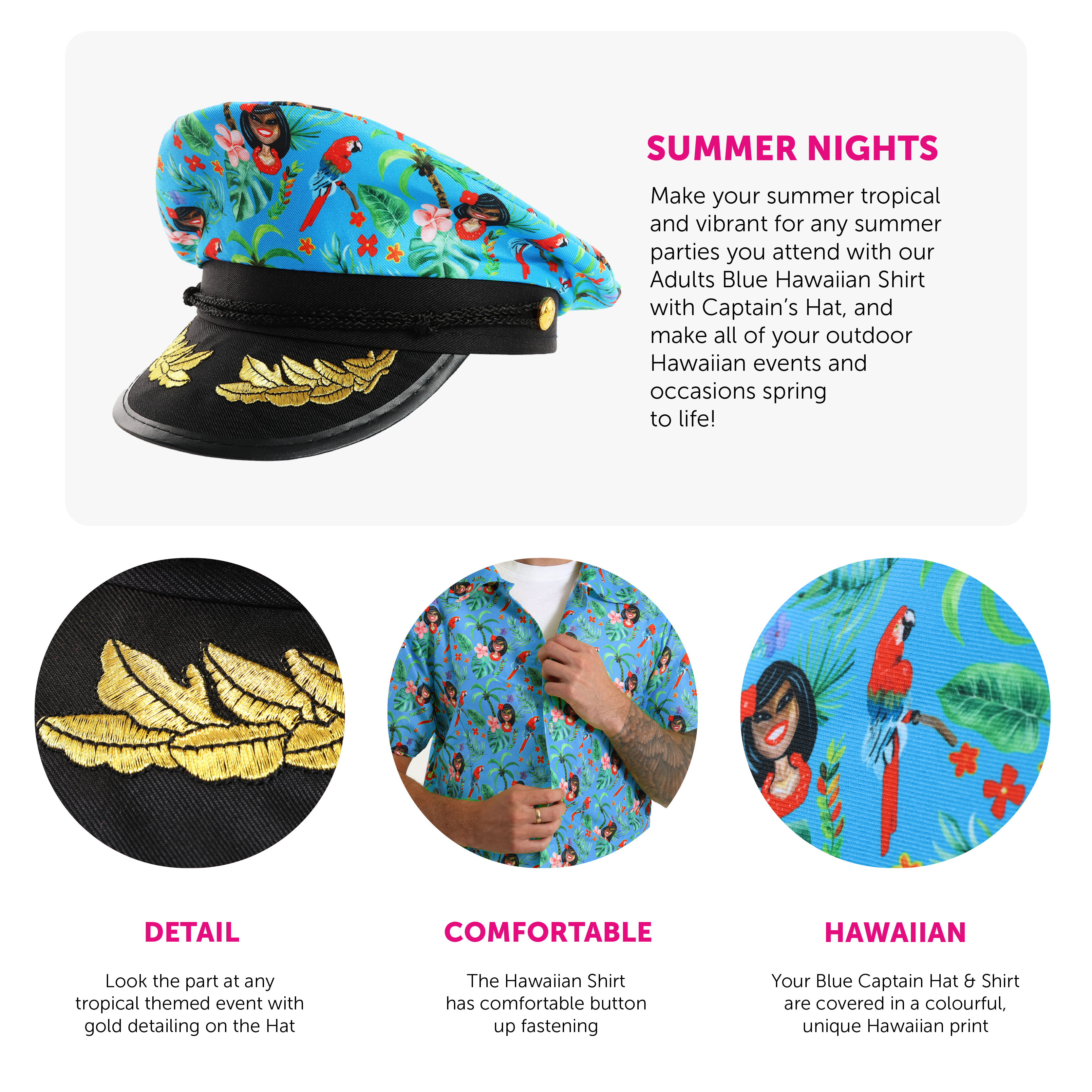 HAWAIIAN COSTUME INCLUDES: This Adults Hawaiian Costume includes a Blue, short sleeved, collared Shirt covered in a unique Hawaiian Print and a matching Blue Captain's Hat with a Black brim, detailed with Gold leaf embroidery!