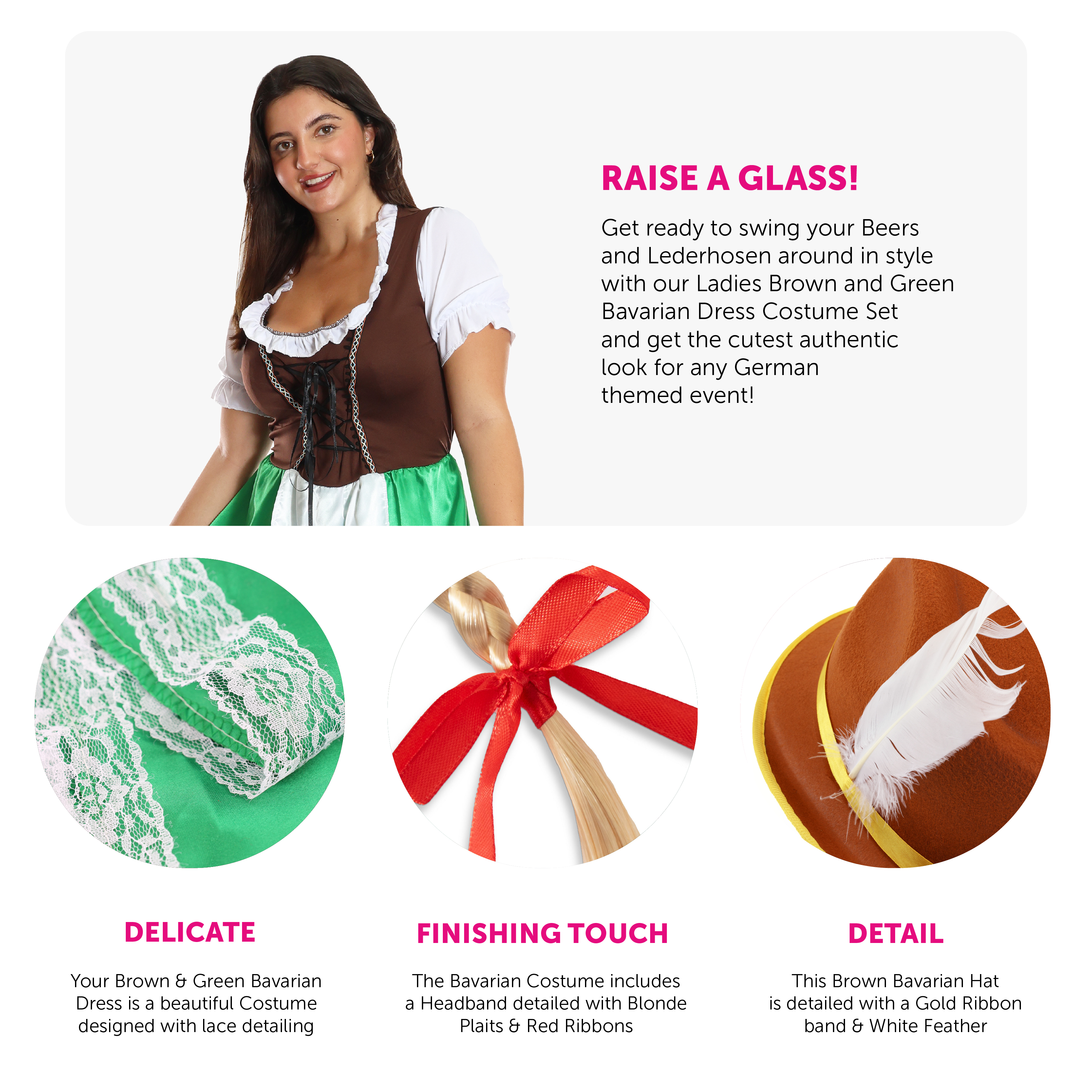 LADIES BROWN & GREEN BAVARIAN DRESS COSTUME SET: Get ready to swing your Beers and Lederhosen around in style with our Ladies Brown and Green Bavarian Dress Costume Set and get the cutest authentic look for any German themed event!