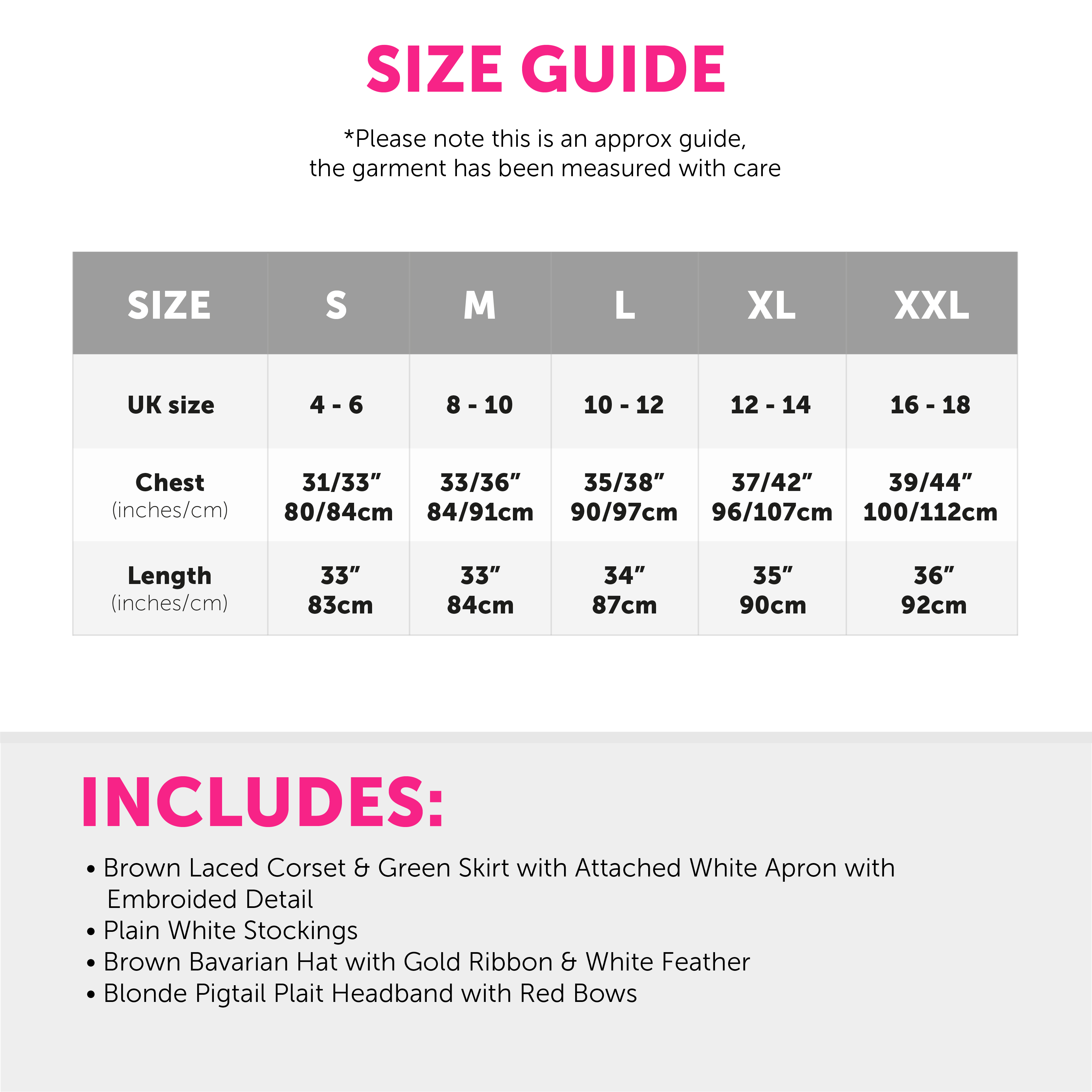AVAILABLE IN MULTIPLE SIZES: Your Ladies Bavarian Dress Costume is available in multiple sizes from Small to XX-Large: Small (UK 4 - 6) Chest: 31/33” (80/84cm), Length: 33” (83cm) | Medium (UK 8 - 10) Chest: 33/36” (84/91cm), Length: 33” (84cm) | Large (UK 10 - 12) Chest: 35/38” (90/97cm), Length: 34” (87cm) | X-Large (UK 12 - 14) Chest: 37/42” (96/107cm), Length: 35” (90cm) | XX-Large (UK 16 - 18) Chest: 39/44” (100/112cm), Length: 36” (92cm)