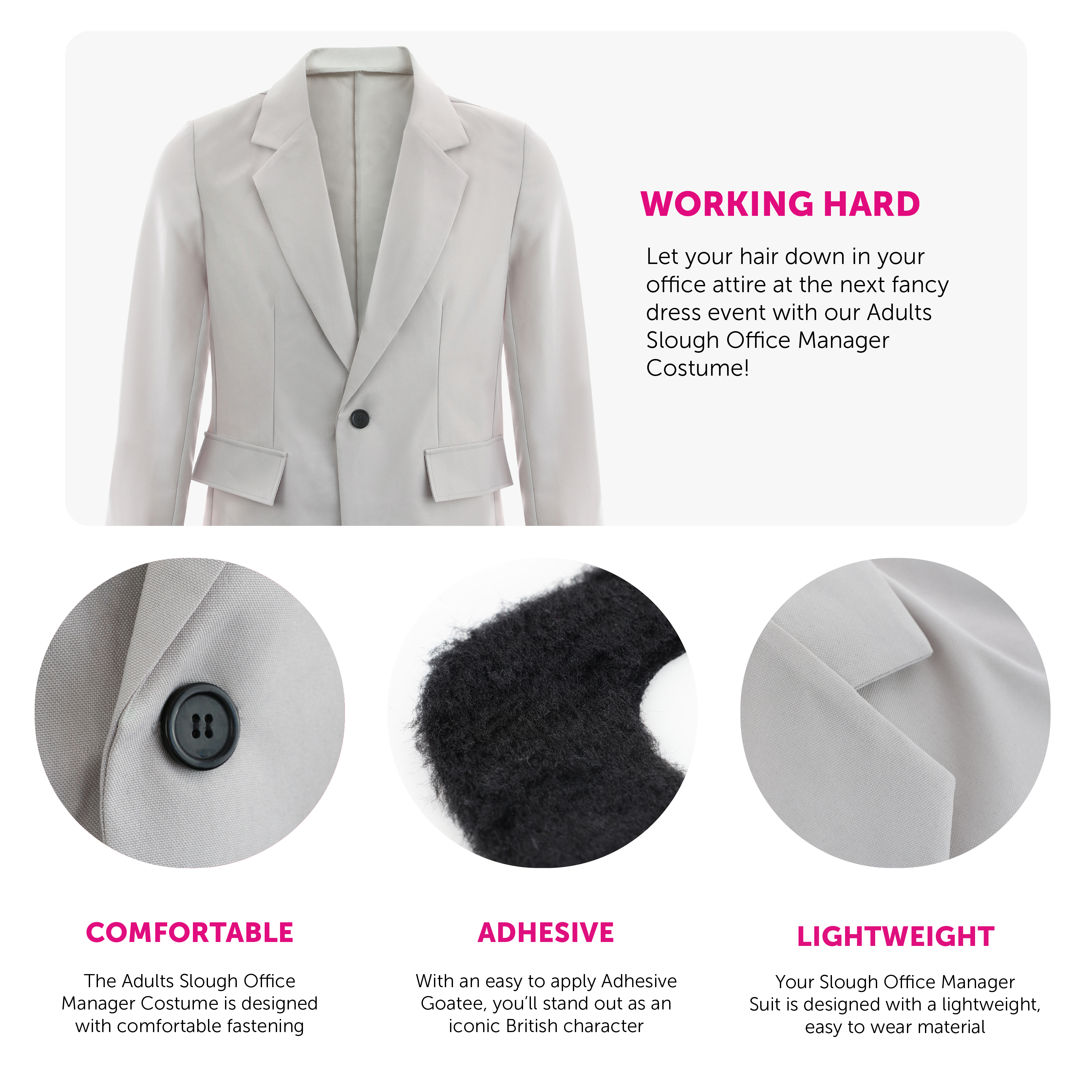 COSTUME DETAILS: Your Slough Office Manager Costume includes a Grey Suit Jacket and matching Suit Trousers, and an Adhesive Black Goatee Beard, the perfect Costume set for any fancy dress event!