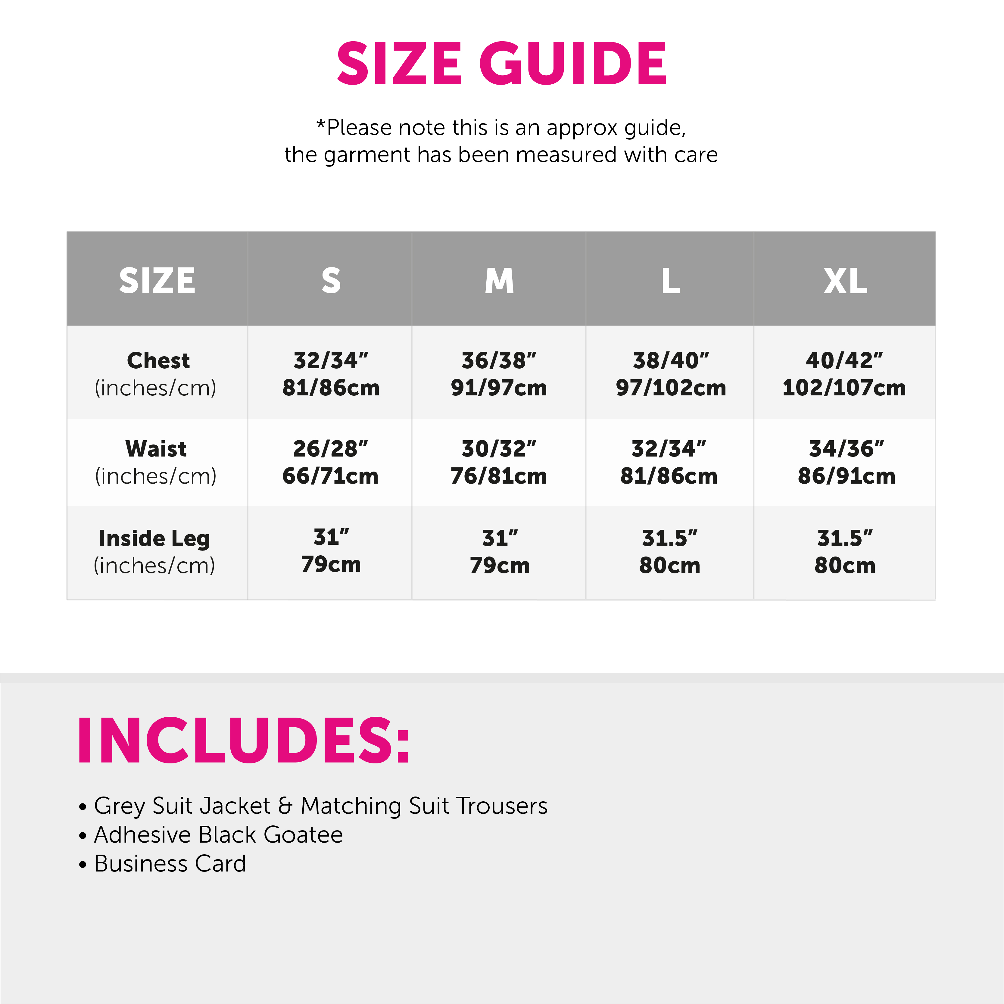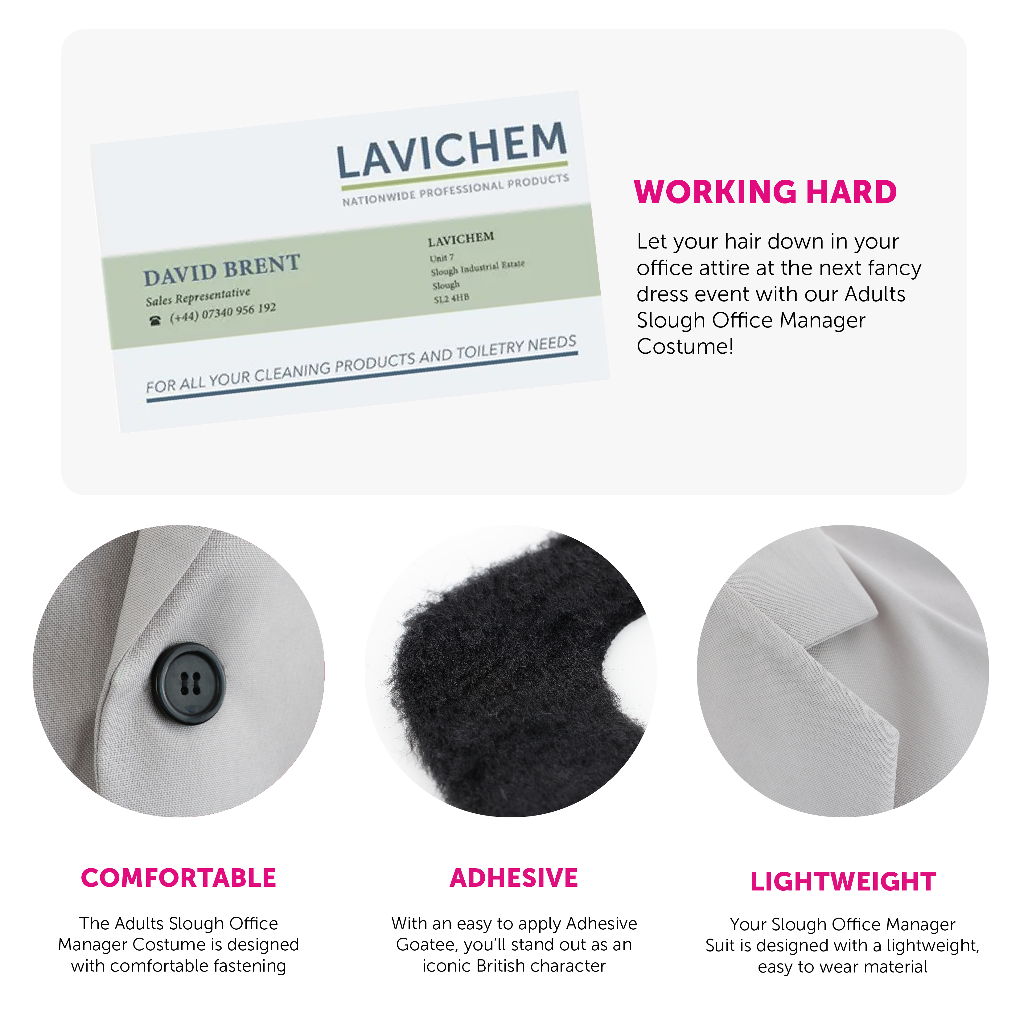 COSTUME DETAILS: Your Slough Office Manager Costume includes a Grey Suit Jacket and matching Suit Trousers, an Adhesive Black Goatee Beard, and a Business Card, the perfect Costume set for any fancy dress event!