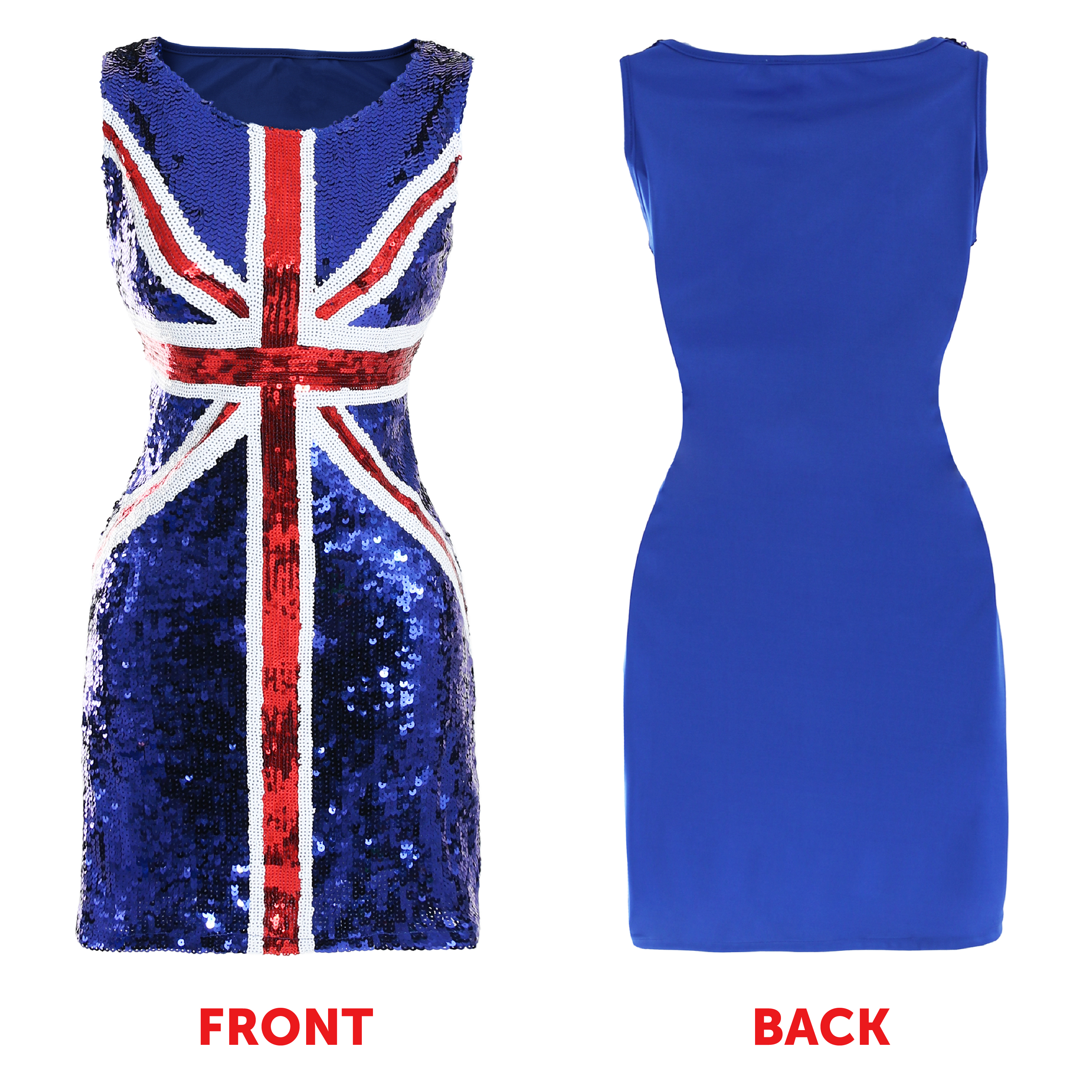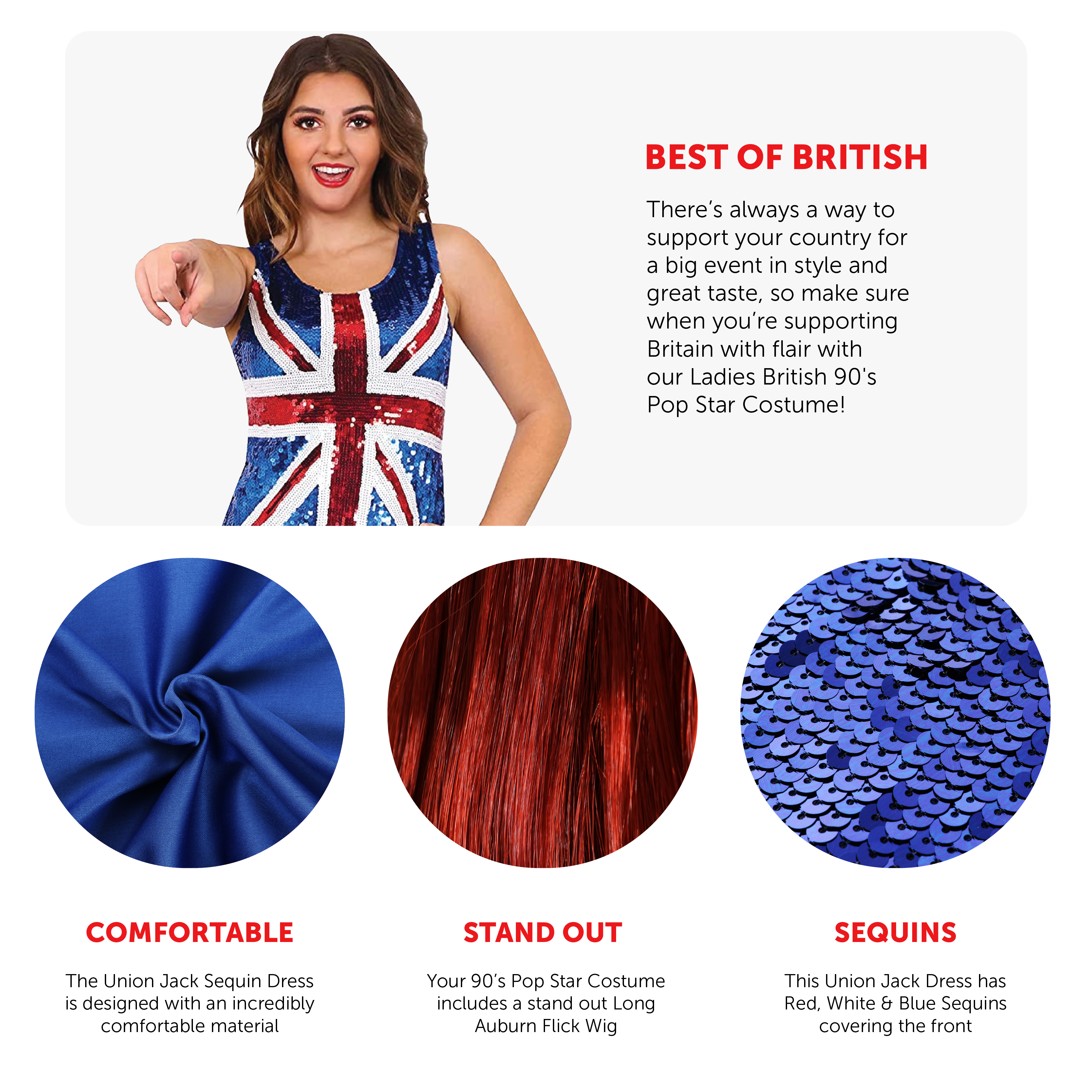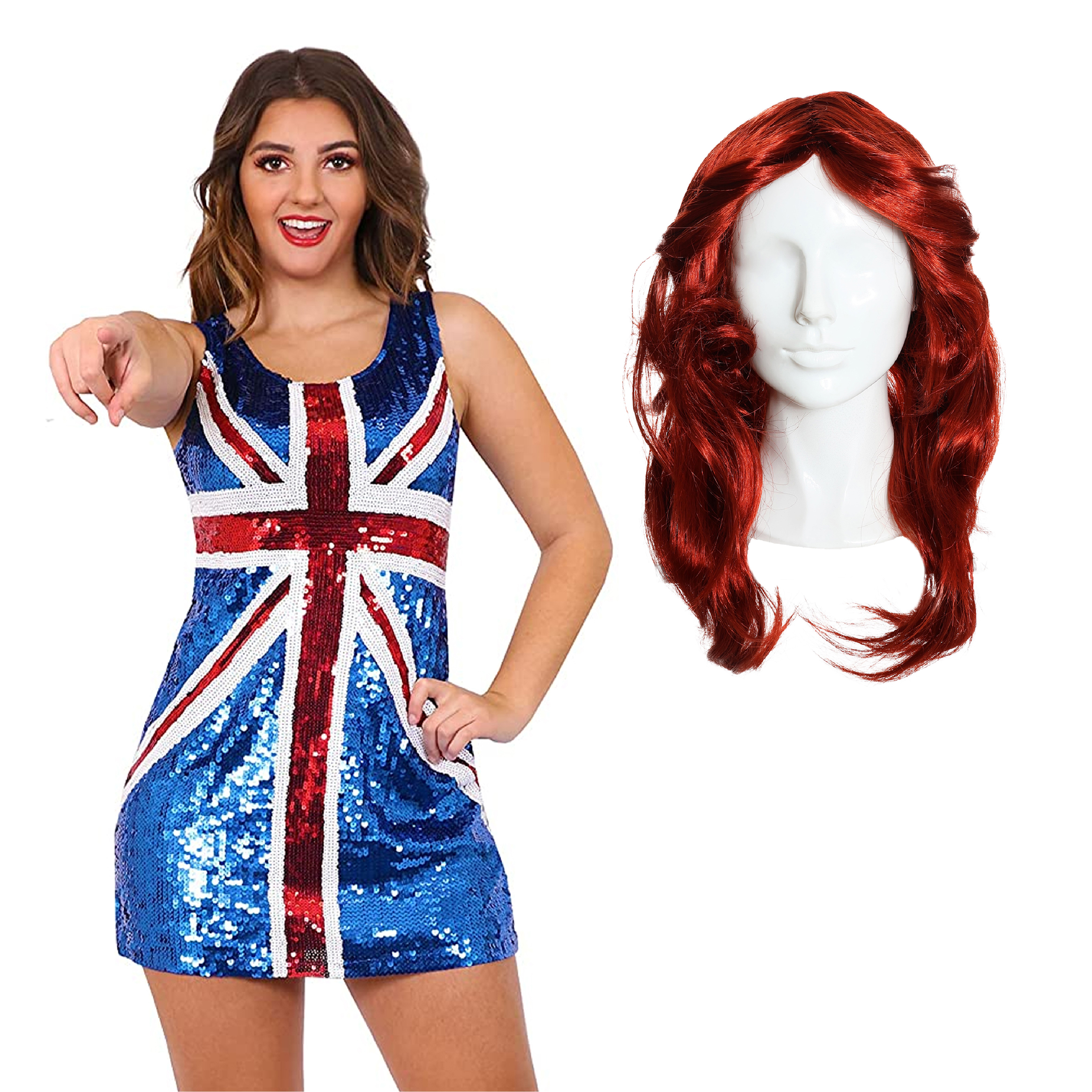 COSTUME INCLUDES: Your Ladies British 90's Pop Star Costume includes a Red, White, Blue Sequin Union Jack mini dress covered in Sequins, and a Long Ginger/Auburn Flick Wig, a perfect look with everything you need to look as fashionable as you need!