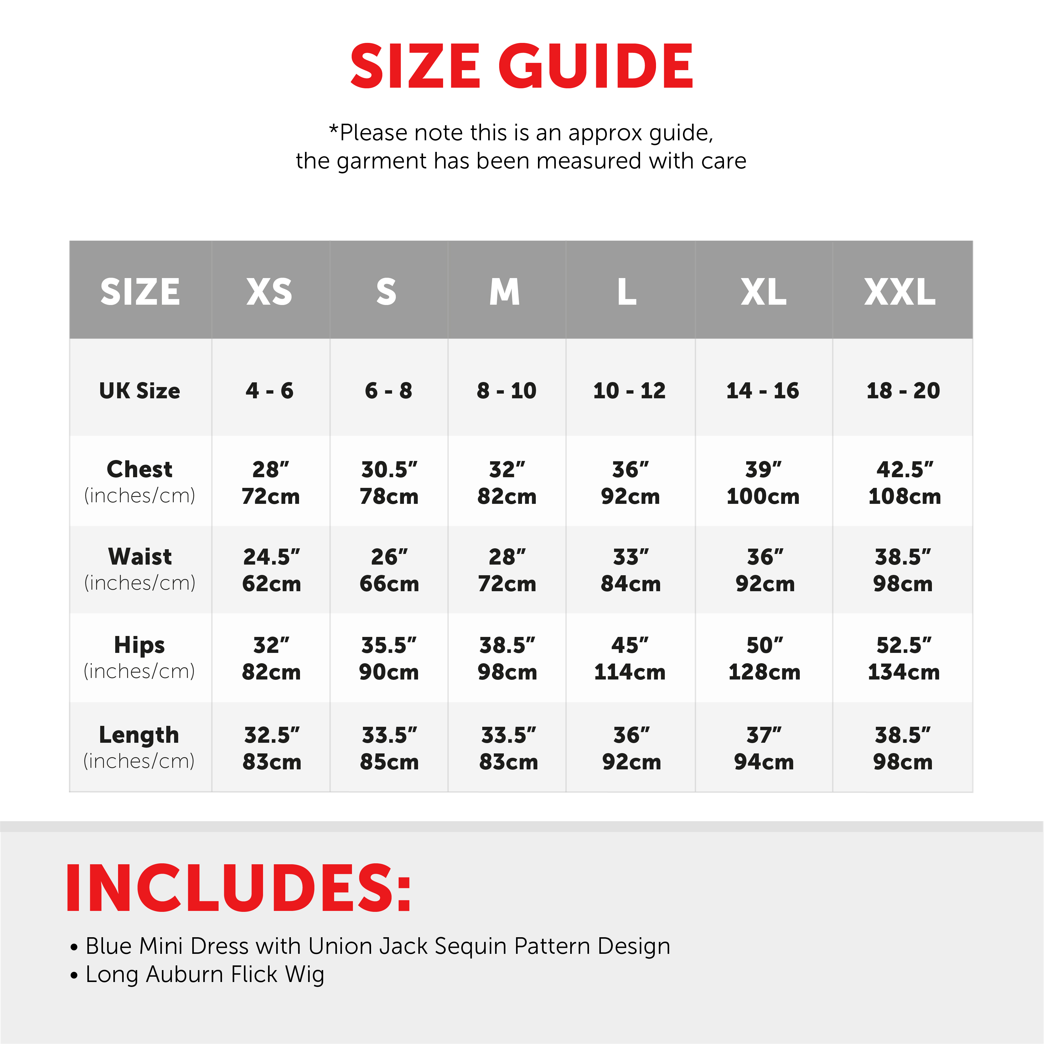 AVAILABLE IN MULTIPLE SIZES: Our Ladies British 90's Pop Star Costume is available in multiple sizes from X-Small to XX-Large: X-Small (UK 4 - 6) Chest 28” (72cm), Waist 24.5” (62cm), Hips 32" (82cm), Length 32.5” (83cm) | Small (UK 6 - 8) Chest 30.5” (78cm), Waist 26" (66cm), Hips 35.5" (90cm), Length 33.5” (85cm) | Medium (UK 8 - 10) Chest 32" (82cm), Waist 28” (72cm), Hips 38.5" (98cm), Length 33.5” (85cm) | Large (UK 10 - 12) Chest 36" (92cm), Waist 33” (84cm), Hips 45" (114cm), Length 36” (92cm) | X-Large (UK 14 - 16) Chest 39” (100cm), Waist 36” (92cm), Hips 50" (128cm), Length 37” (94cm ) | XX-Large (UK 18 - 20) Chest 42.5" (108cm), Waist 38.5” (98cm), Hips 52.5" (134cm), Length 38.5” (98cm)