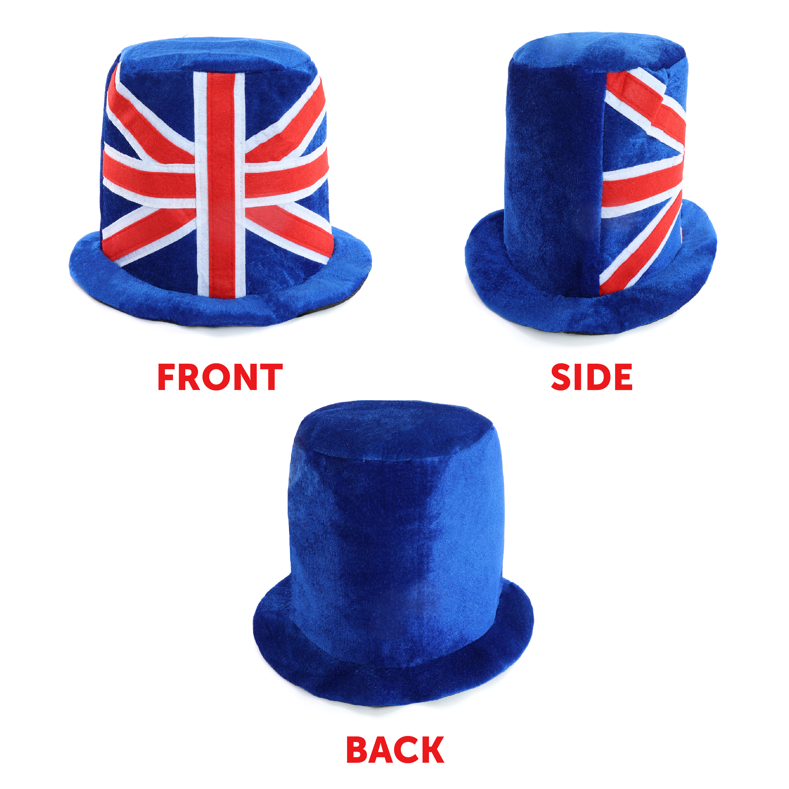 UNION JACK HAT DETAILS: This Union Jack Hat is a soft, velour, Royal Blue Top Hat with red and white material strips forming a Union Jack on across the front, perfect for any British occasion!