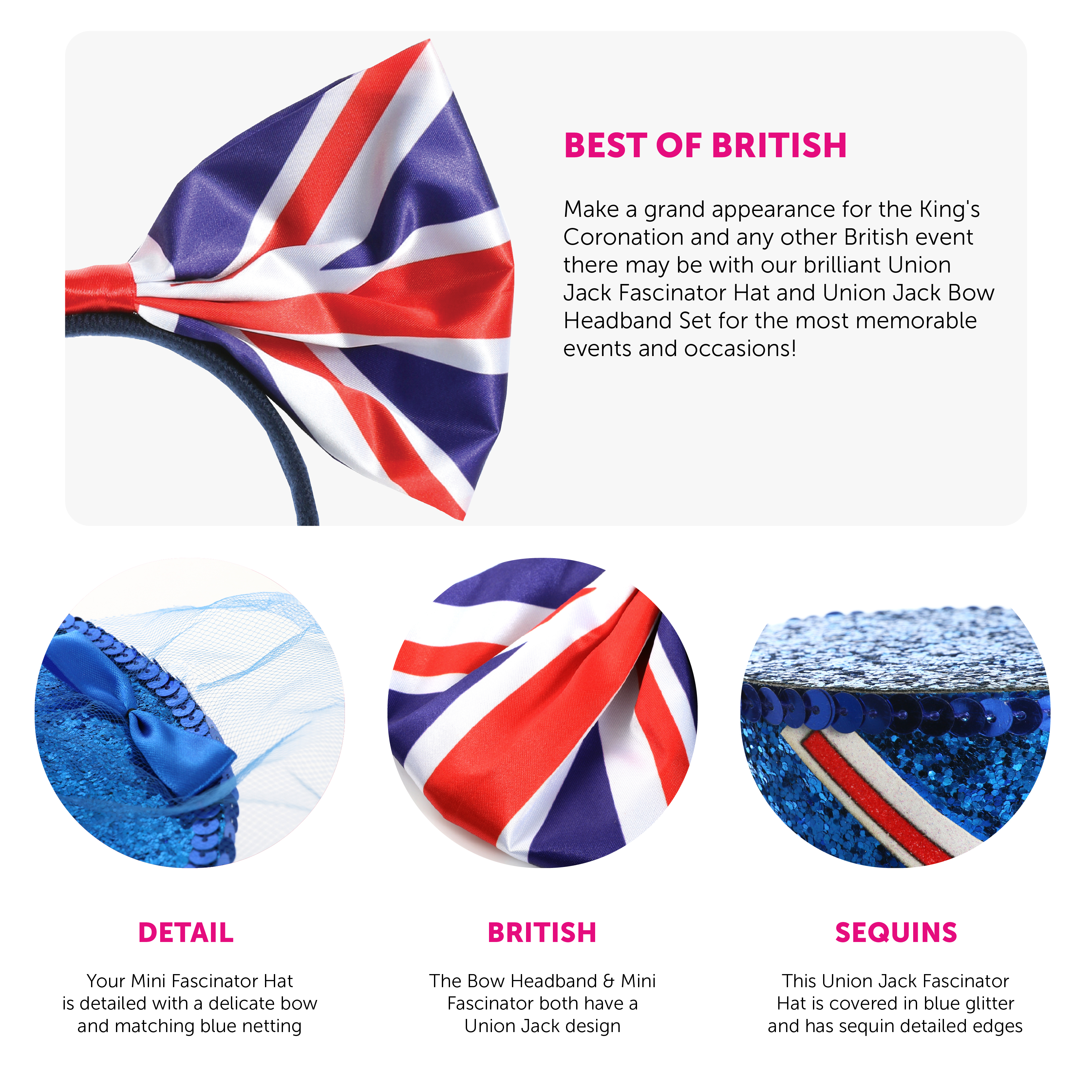 MINI UNION JACK TOP HAT AND UNION JACK BOW HEADBAND SET: Make a grand appearance for the King's Coronation and any other British event there may be with our brilliant Union Jack Fascinator Hat and Union Jack Bow Headband Set for the most memorable events and occasions!