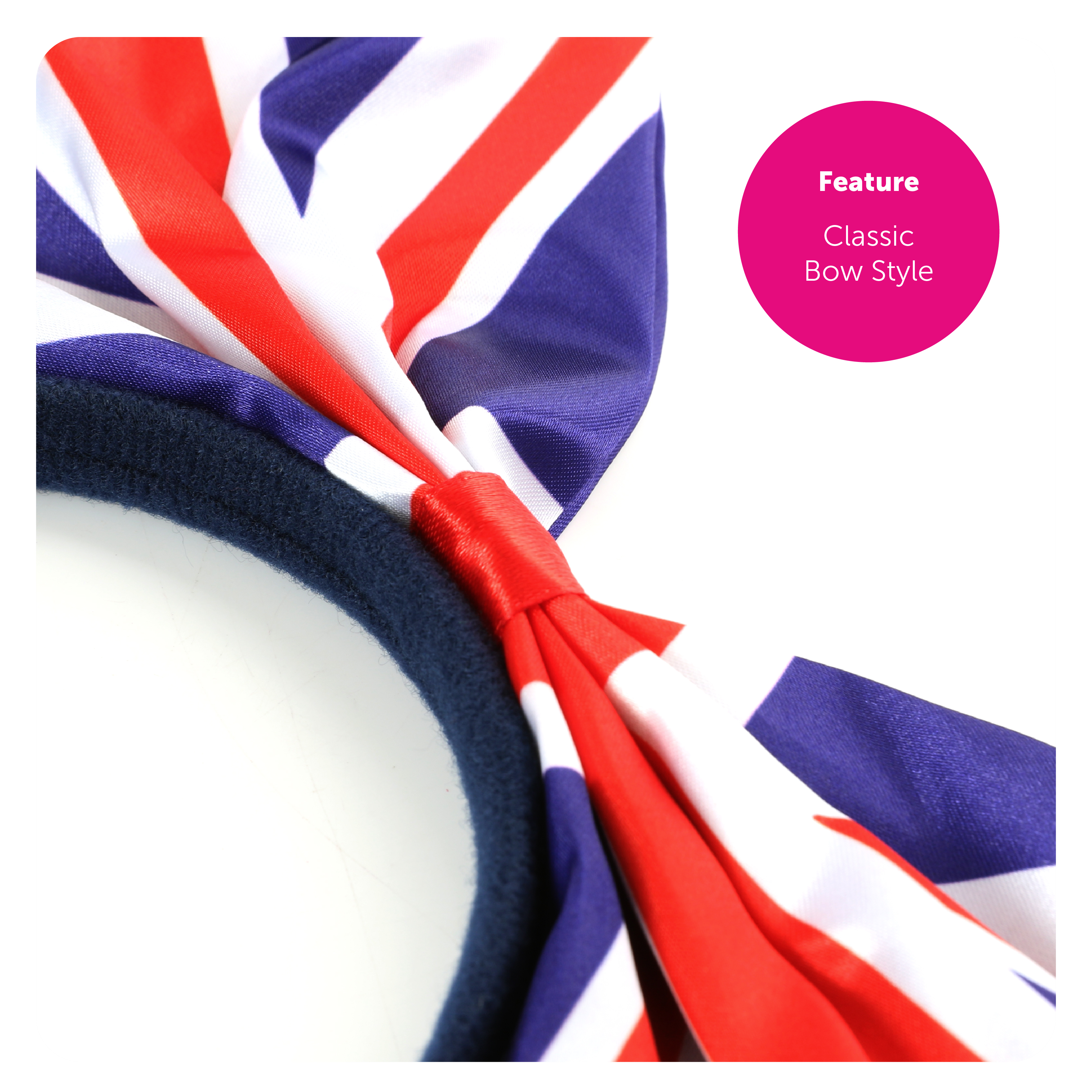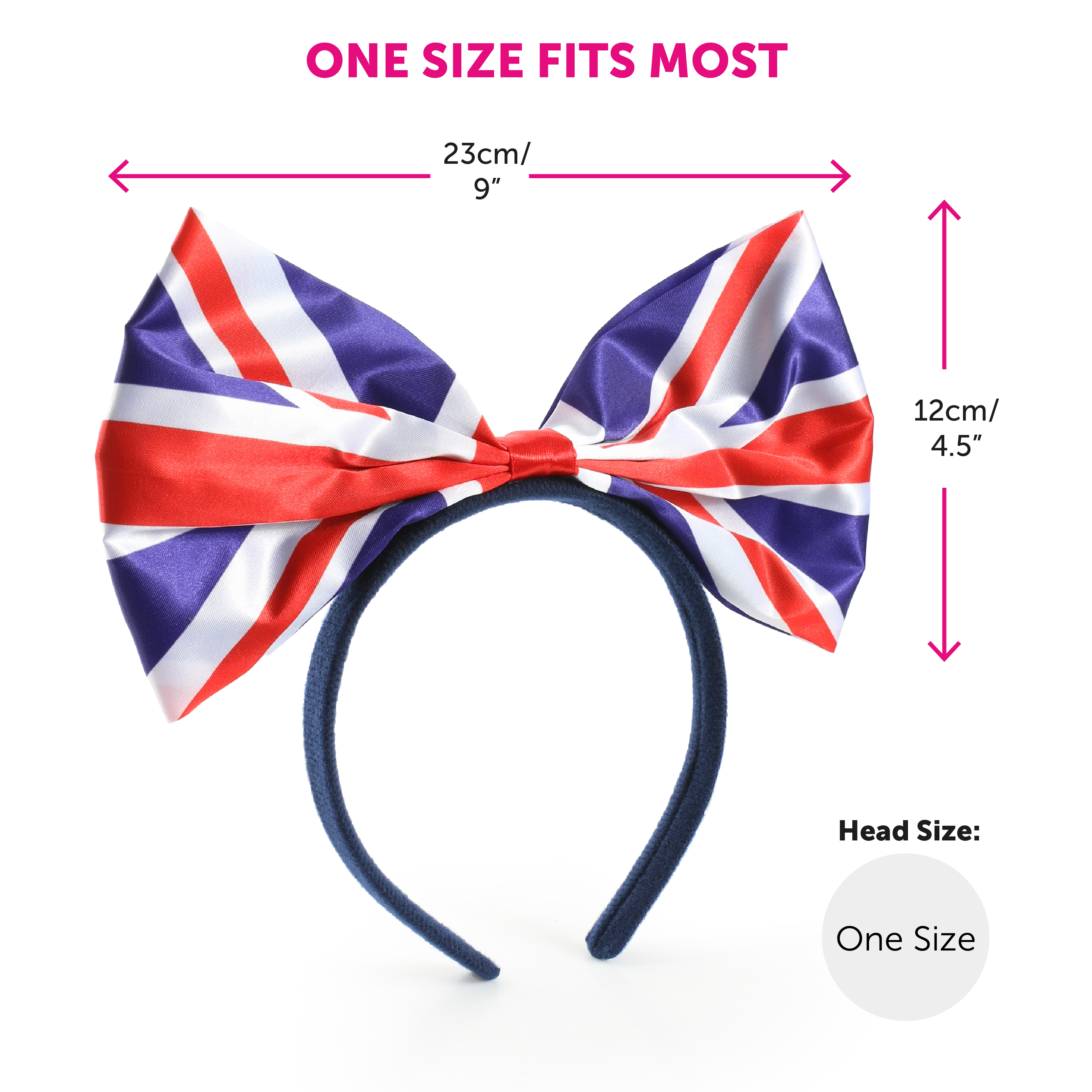 UNION JACK BOW HEADBAND DIMENSIONS: Whilst our Headband fits all sizes of any adult or child, the Bow itself measures 23cm x 12cm (9" x 4.5"), a perfectly sized and statured bow to be proudly displayed above your head for all British Events!