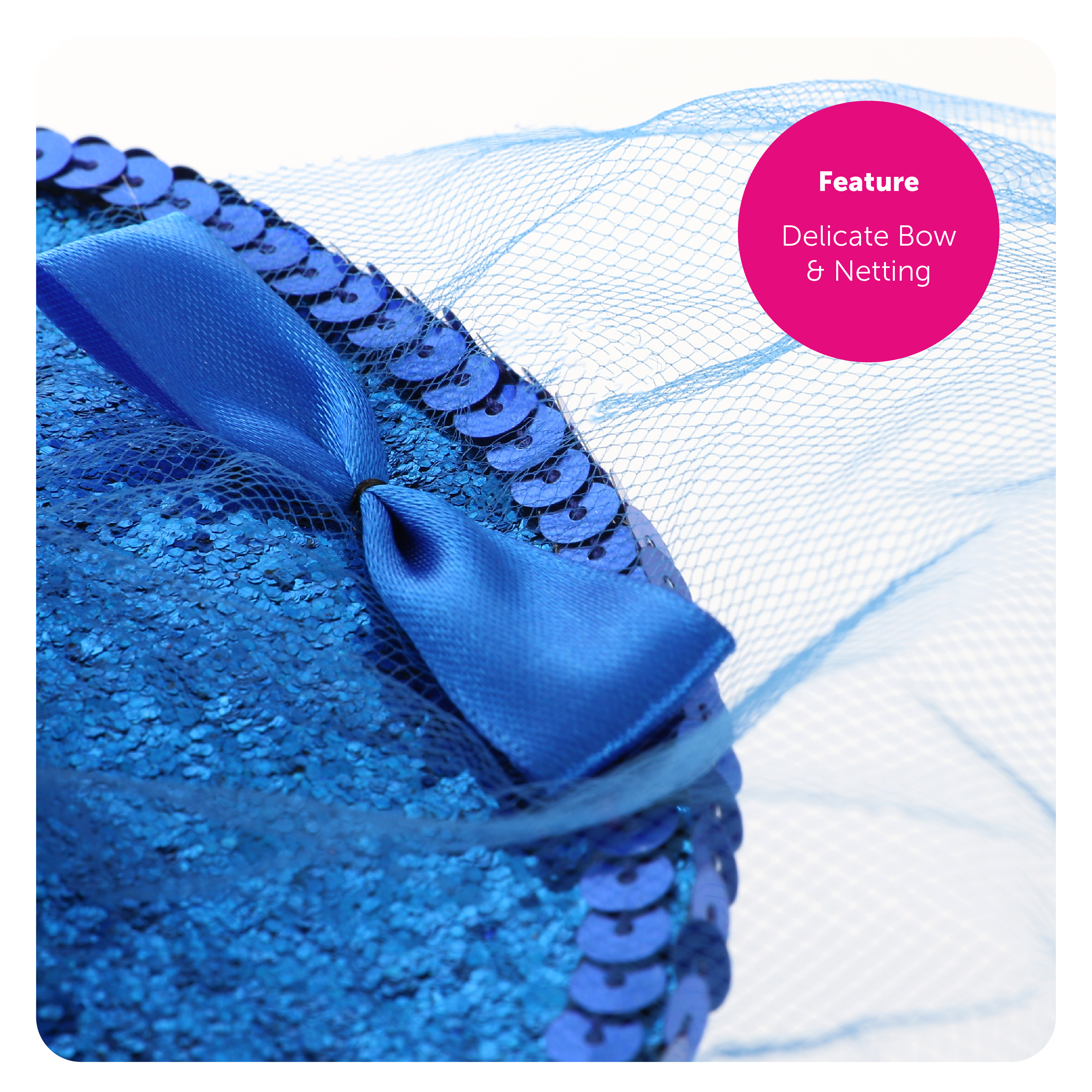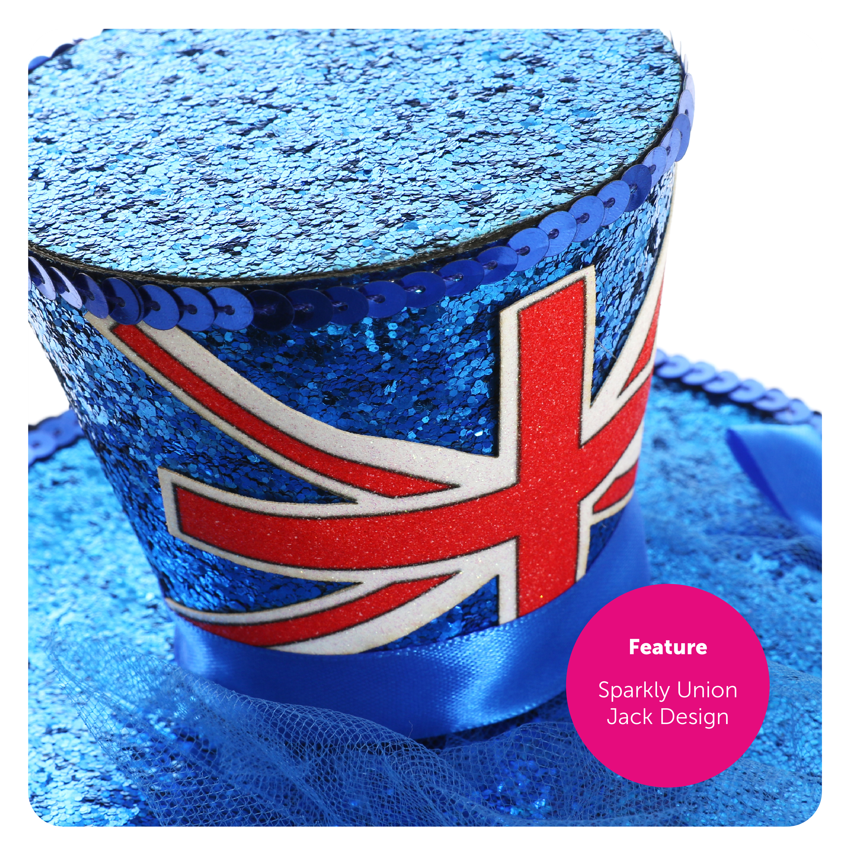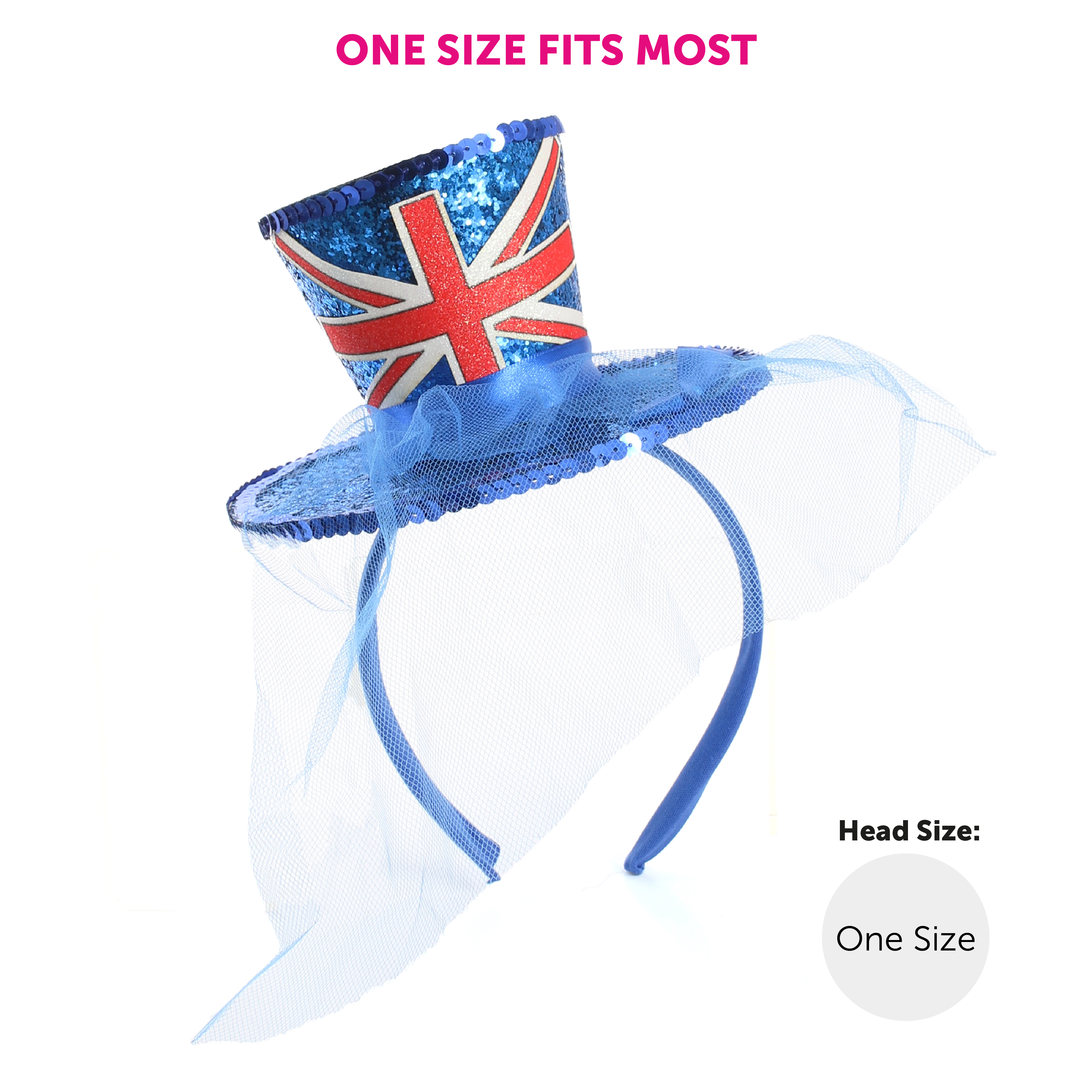 HAT SET INCLUDES: This Mini Top Hat and Bow Headband Set includes 6 x Blue Glitter Mini Top Hat with attached Fascinator and 6 x Union Jack Bows on Black Headbands, the perfect way to celebrate any British event with family and friends!