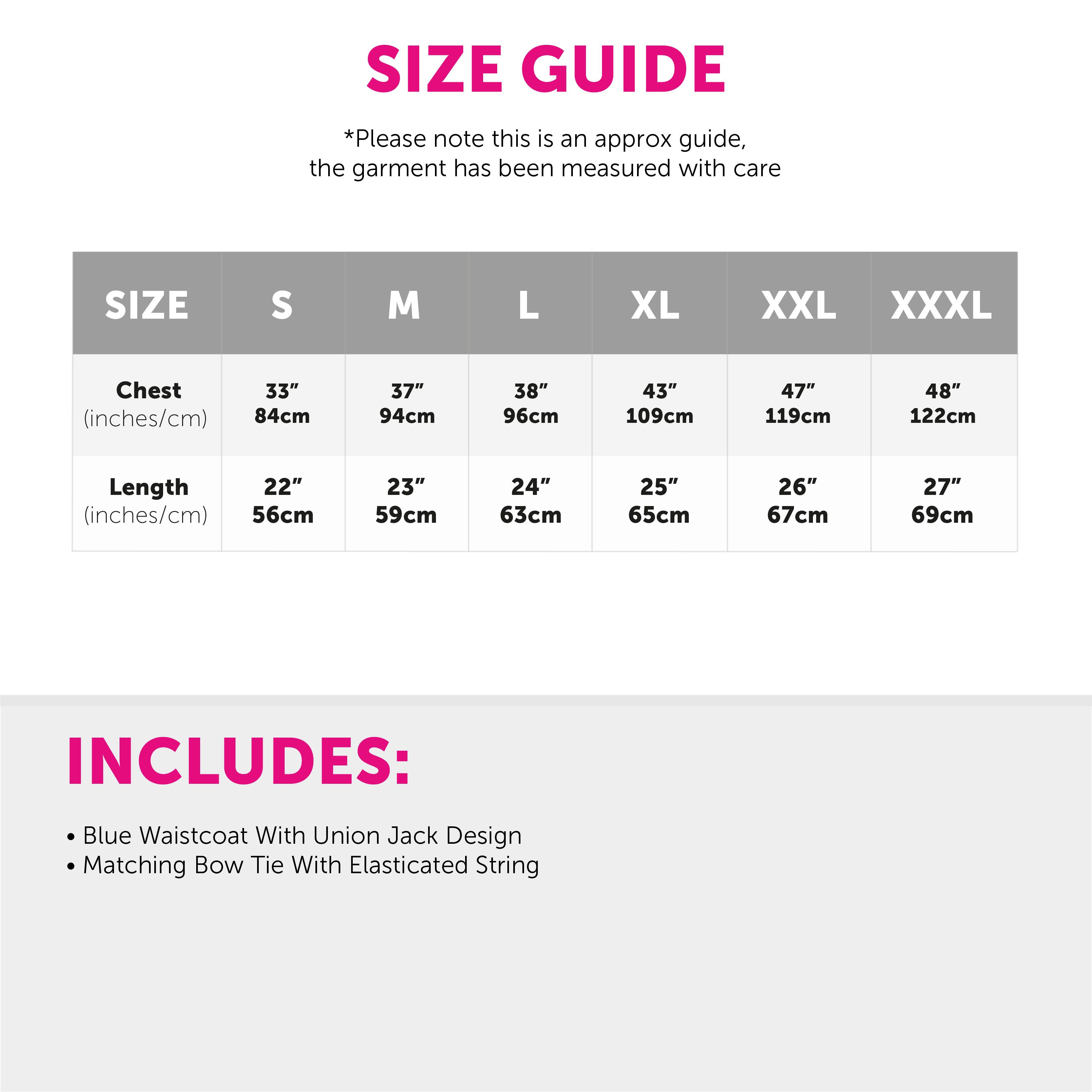 AVAILABLE IN MULTIPLE SIZES: These Adults Union Jack Waistcoats are available in multiple sizes: