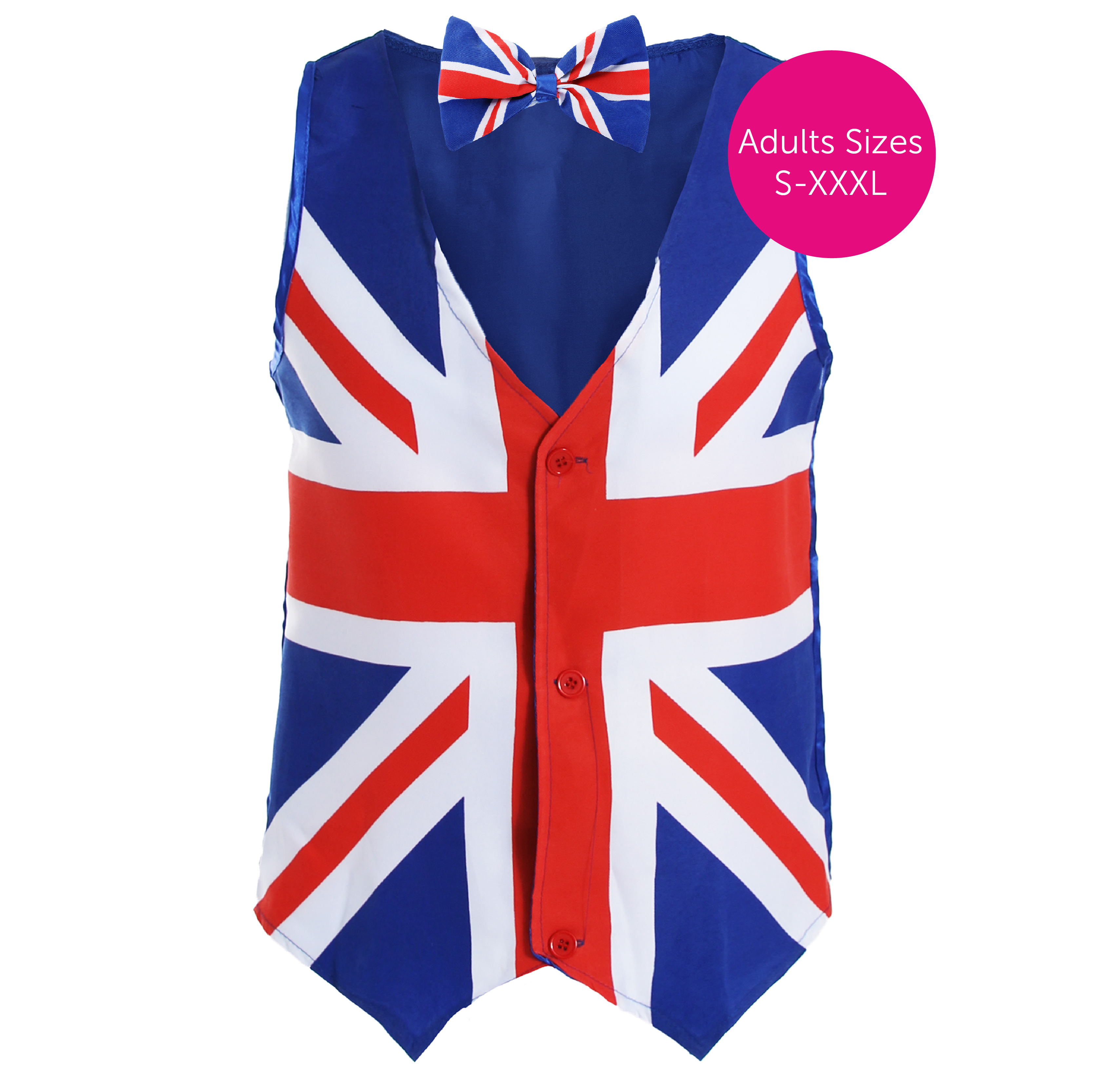 COSTUME INCLUDES: Your Adults Union Jack Waistcoat set will include a stylish Union Jack Waistcoat with button detail, as well as a matching Union Jack Bow Tie for any British event!
