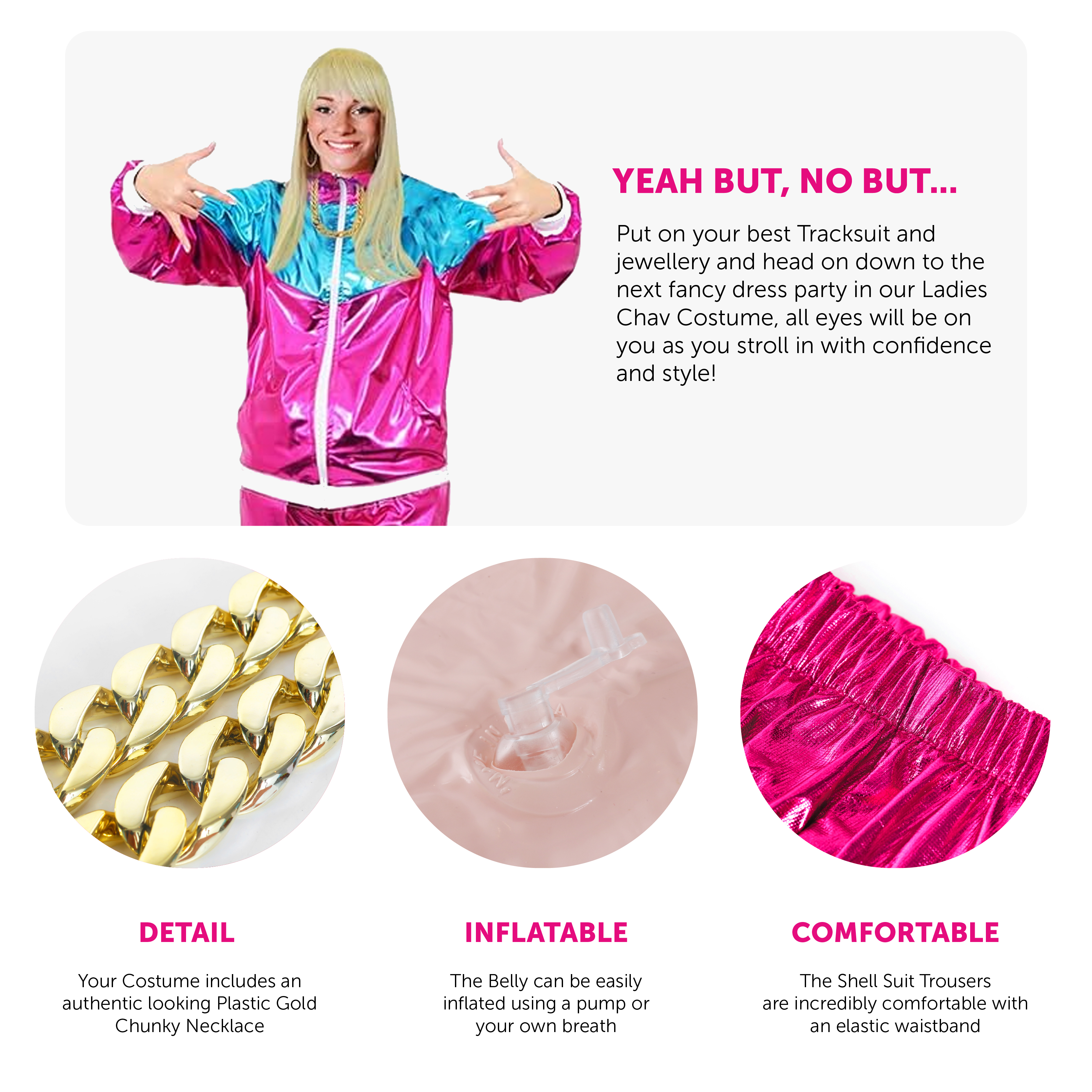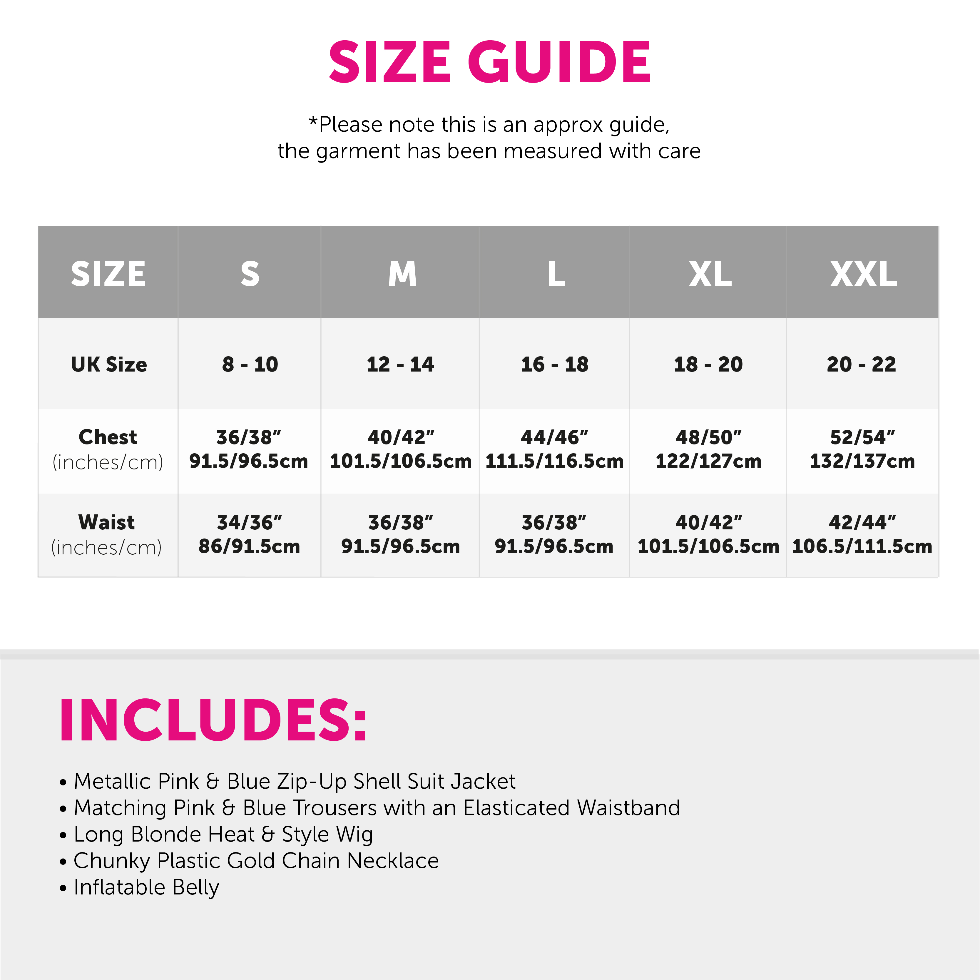 COSTUME DETAILS: Your Chav Costume includes a shiny Pink and Blue Tracksuit Jacket with Zip up fastening, a matching pair of Trousers with an elasticated waistband, a Chunky Plastic Gold Chain, a Long Blonde Heat and Style Wig, and an Inflatable Belly, the perfect Costume set for any fancy dress event!