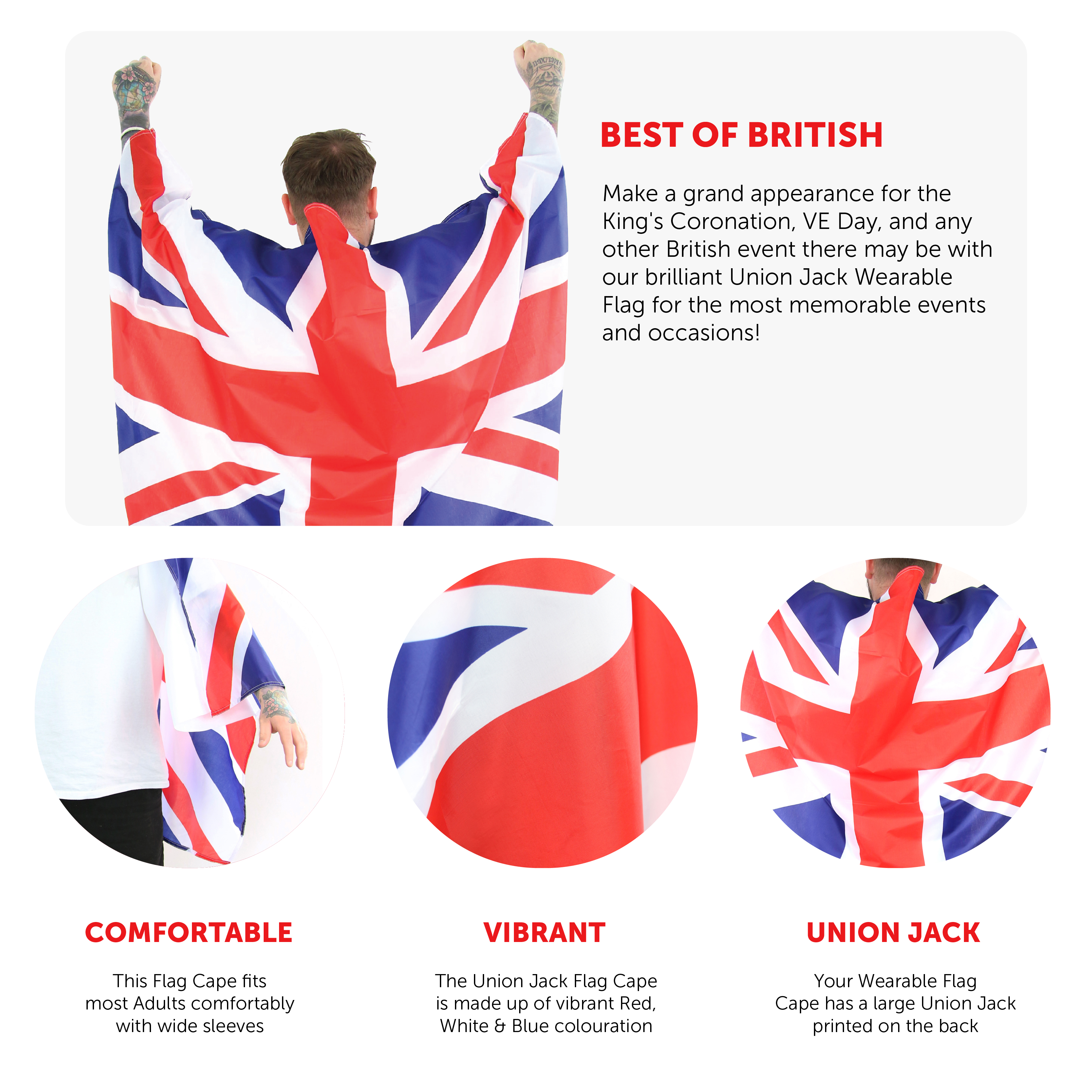 UNION JACK WEARABLE FLAG: Make a grand appearance for the King's Coronation, VE Day, and any other British event there may be with our brilliant Union Jack Wearable Flag for the most memorable events and occasions!
