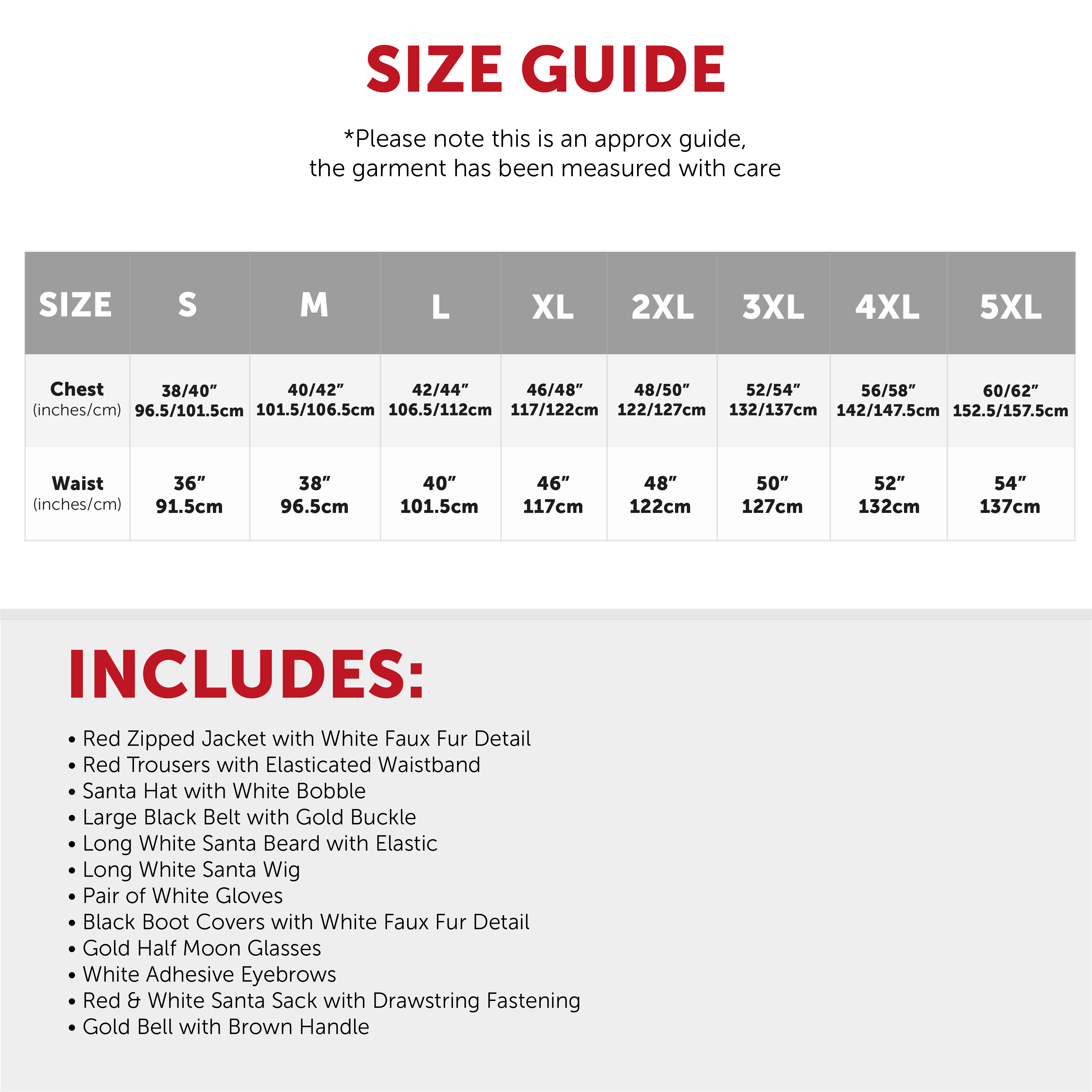 AVAILABLE IN MULTIPLE SIZES: Your Santa Costume is available in multiple sizes from Small to XXXXX-Large: Small: Chest: 38/40" (96.5/101.5cm), Waist: 36" (91.5cm) | Medium: Chest: 40/42" (101.5/106.5cm), Waist: 38" (96.5cm) | Large: Chest: 42/44" (106.5/112cm), Waist: 40"(101.5cm) | X Large: Chest: 46/48" (117/122cm), Waist: 46" (117cm) | XX Large: Chest: 48/50" (122/127cm), Waist: 48" (122cm) | XXX Large: Chest: 52/54" (132/137cm), Waist: 50" (127cm) | XXXX Large: Chest: 56/58" (142/147.5cm), Waist: 52" (132cm) | XXXXX Large: Chest: 60/62" (152.5/157.5cm), Waist: 54" (137cm)