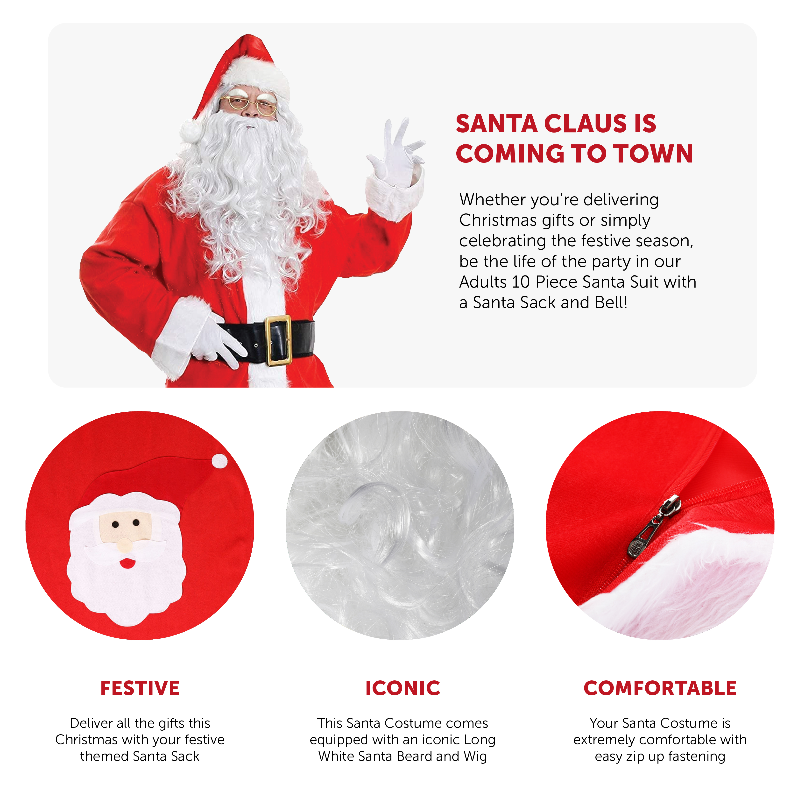 COSTUME INCLUDES: This Santa Costume includes a Red Zipped Jacket with Faux Fur Detail, Red Trousers with an Elasticated Waistband, Santa Hat with White Bobble, Large Black Belt with Gold Buckle, Long White Santa Beard with Elastic, Long White Santa Wig, Pair of White Gloves, Black Boot Covers with White Faux Fur Detail, Gold Half Moon Glasses, White Stick-on Eyebrows, a Gold Bell with Brown Handle, and a Red Felt Santa Sack with a Santa Design on the front and Drawstring fastening, the perfect festive look!