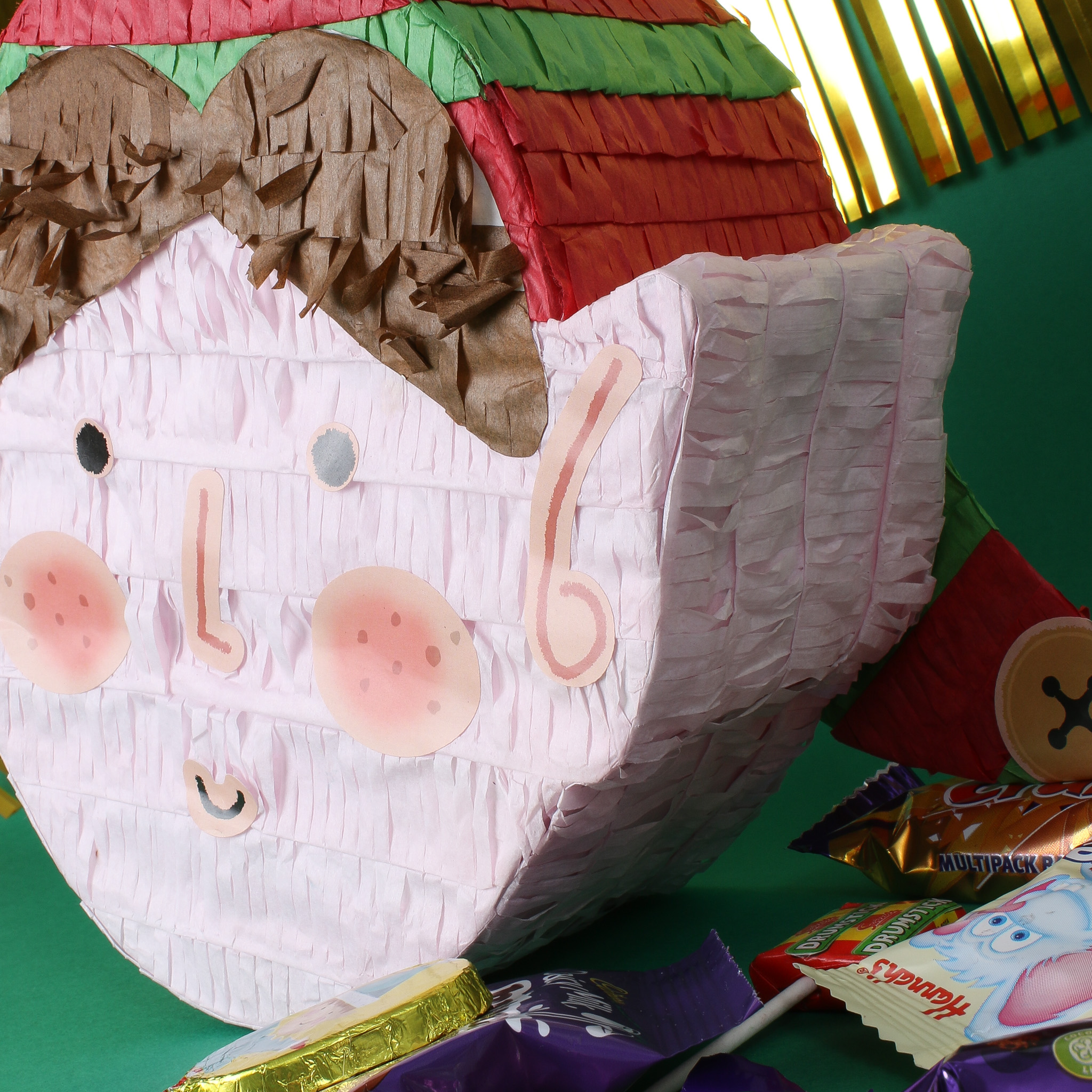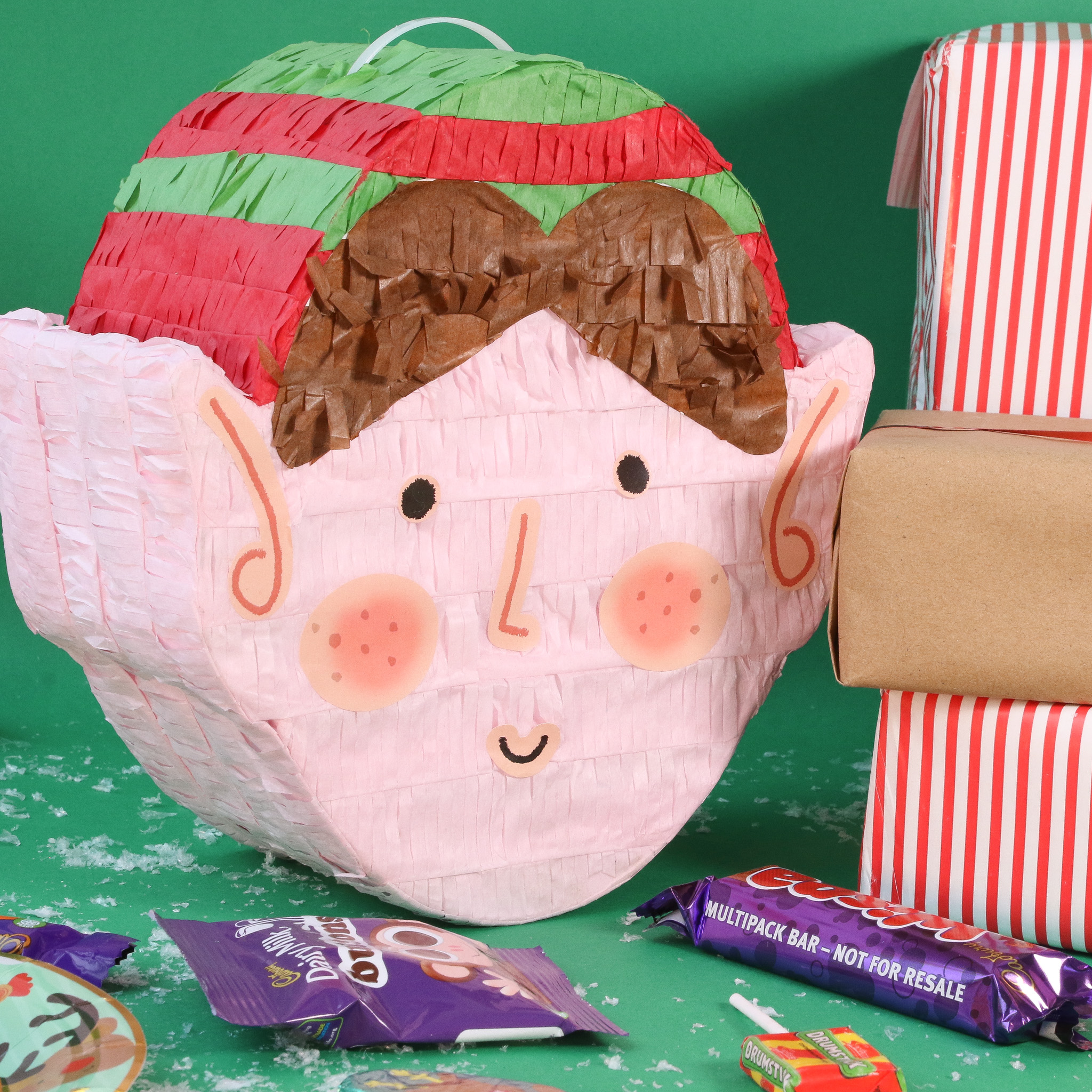 - PINATA - A plain face pinata in the shape of an Elf face and hat that comes with a pack of stickers to create the face.....will there be a smile on the face of the pinata after the event?