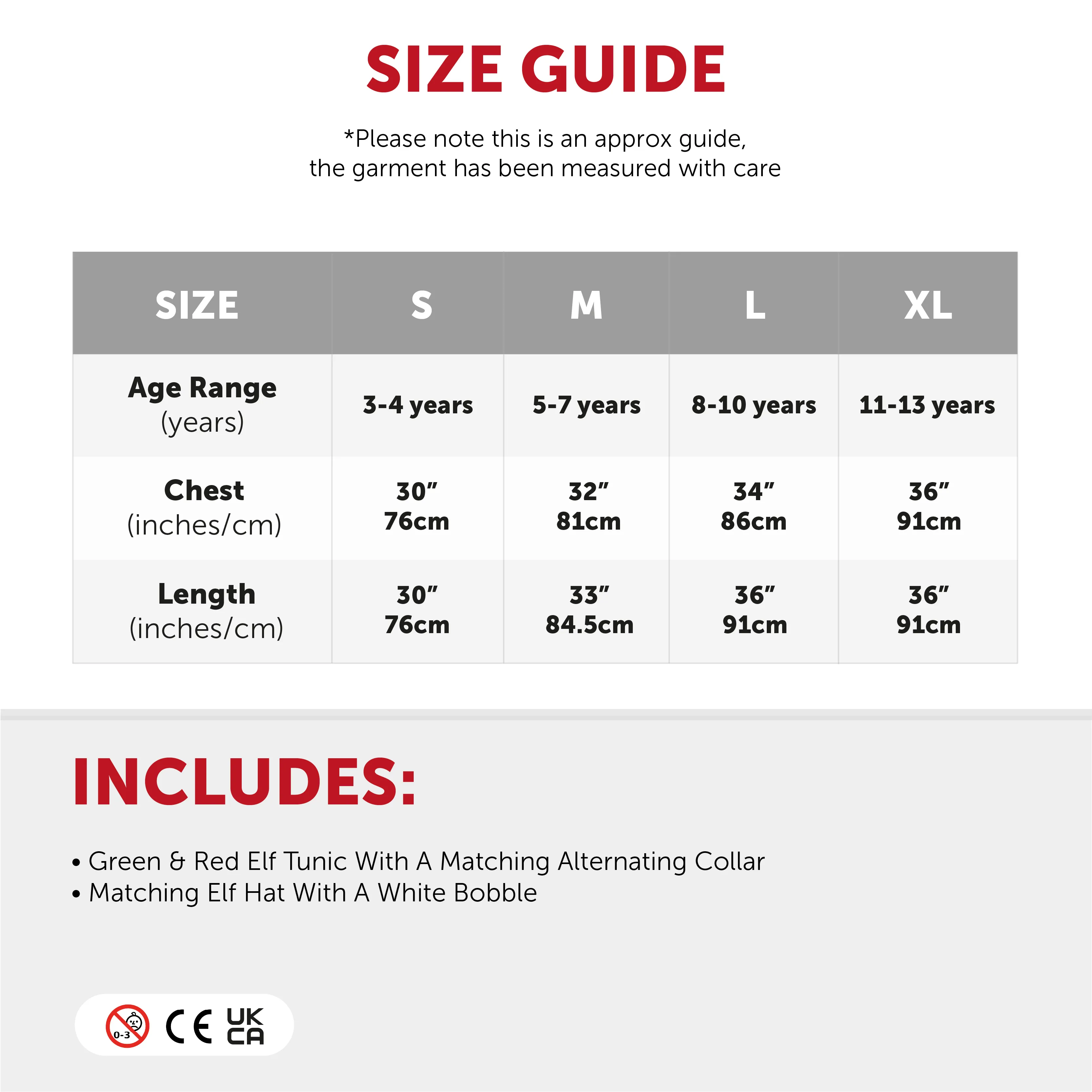AVAILABLE IN MULTIPLE SIZES: Your Child’s Elf Tunic Unisex Costume is available in multiple sizes from Small to X-Large: Small - (3 - 4 Years) Chest: 30" (76cm), Length: 30" (76cm) | Medium - (5 - 7 Years) Chest: 32" (81cm), Large: 33" (84.5cm) | Large - (8 - 10 Years) Chest: 34" (86cm), Length: 36" (91cm) | X-Large - (11 - 13 Years) Chest: 36" (91cm), Length: 36" (91cm)