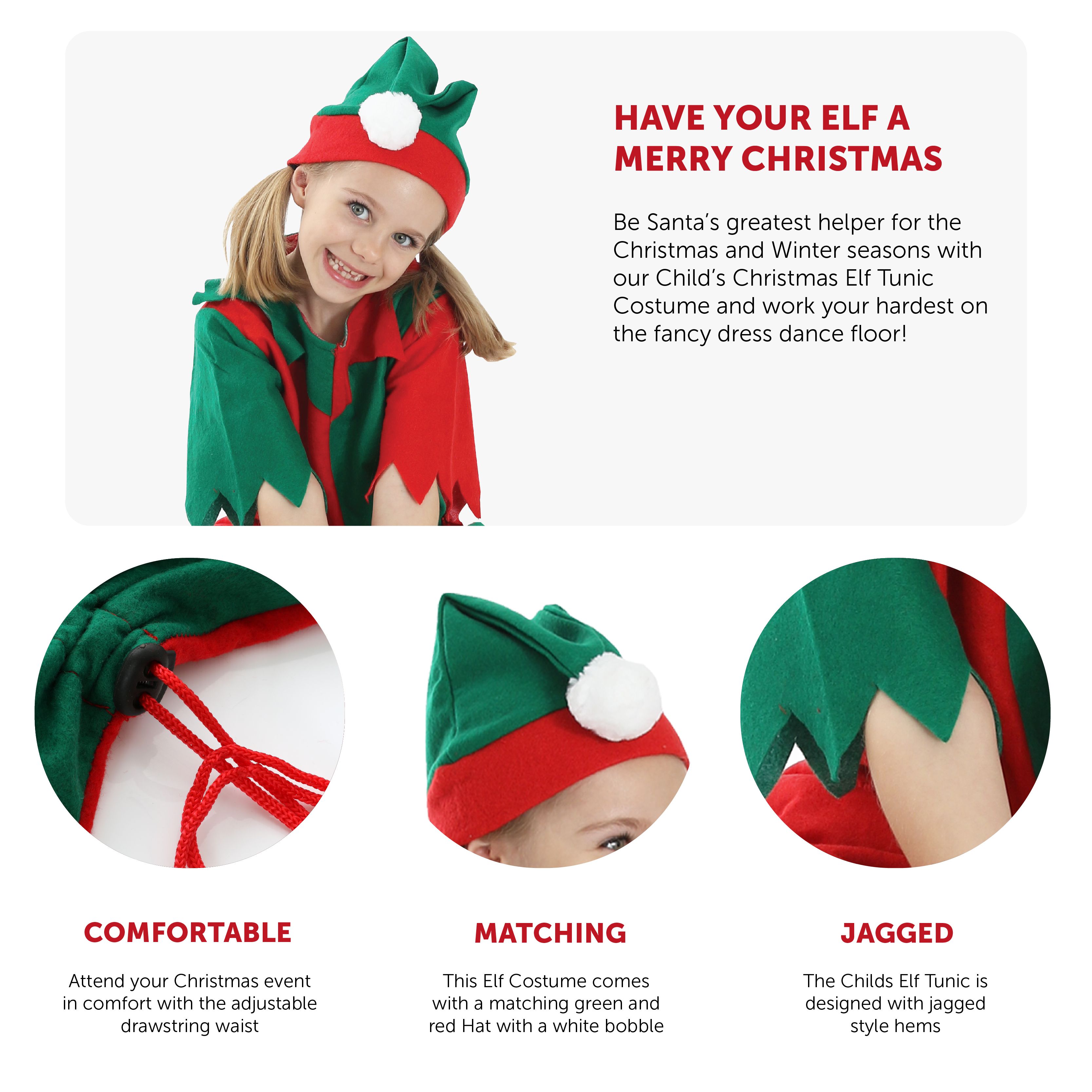 CHILD’S CHRISTMAS ELF TUNIC COSTUME: Be Santa’s greatest helper for the Christmas and Winter seasons with our Child’s Christmas Elf Tunic Costume and work your hardest on the fancy dress dance floor!