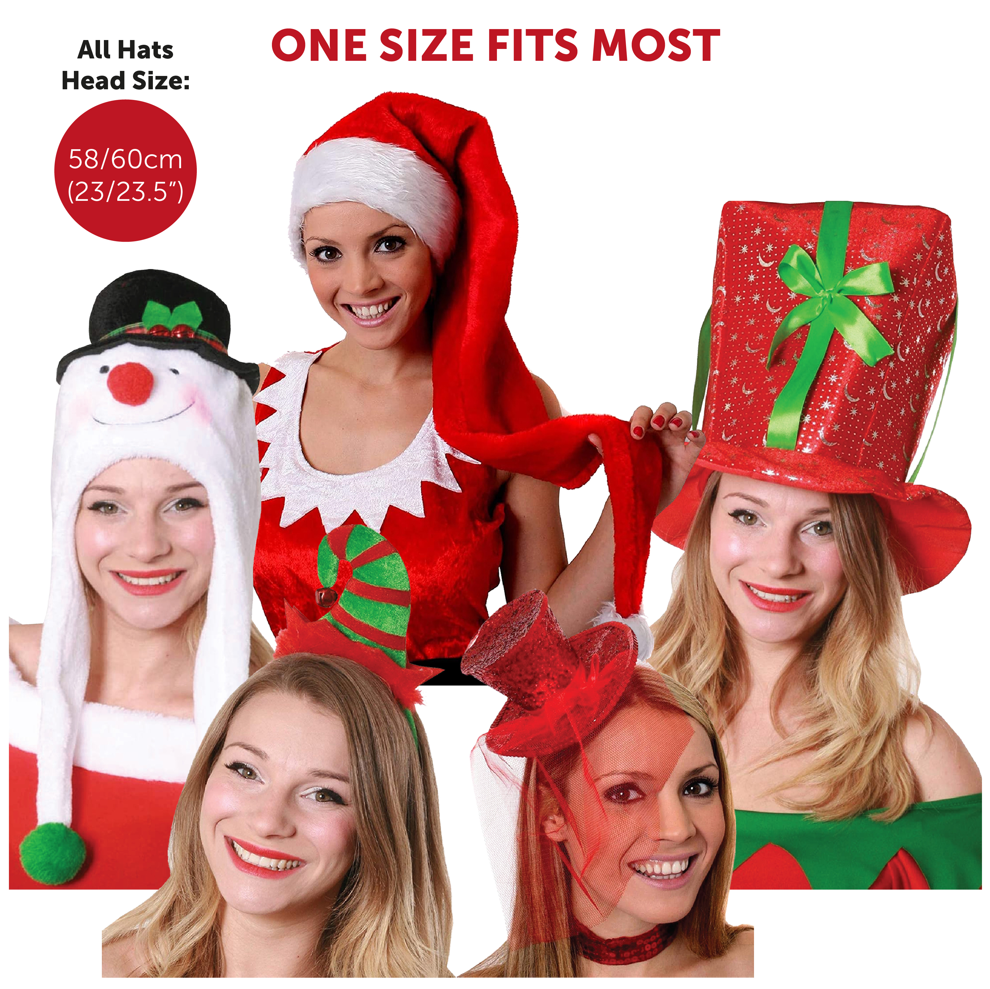 HAT SET INCLUDES: Your Christmas Hat Set includes 5x different Novelty Hats including, 1x Classic Long Red Santa Hat with White trim detail, 1x Soft White Snowman Head Hat, detailed with a Red Nose, a Black Top Hat with Holly and warm Ear Covers on either side with Green Pom-Poms, 1x Mini Green and Red Striped Elf Hat Headband with a Jingle Bell detail, 1x Plush, Red Christmas Present Hat covered in a festive Silver pattern and wrapped in a Green Ribbon Bow, and 1x Mini Red Glitter Top Hat Headband with Sequin and Netted details!