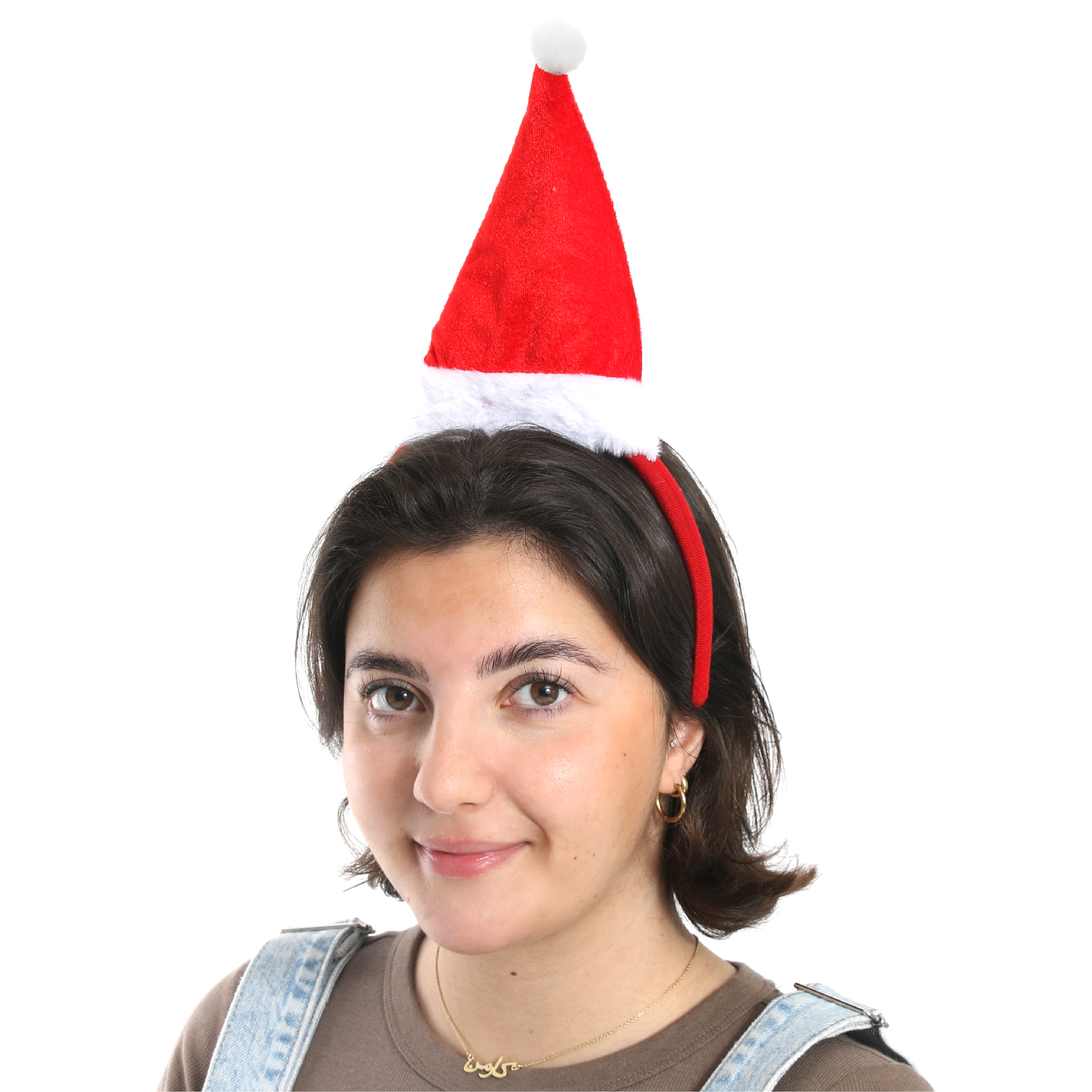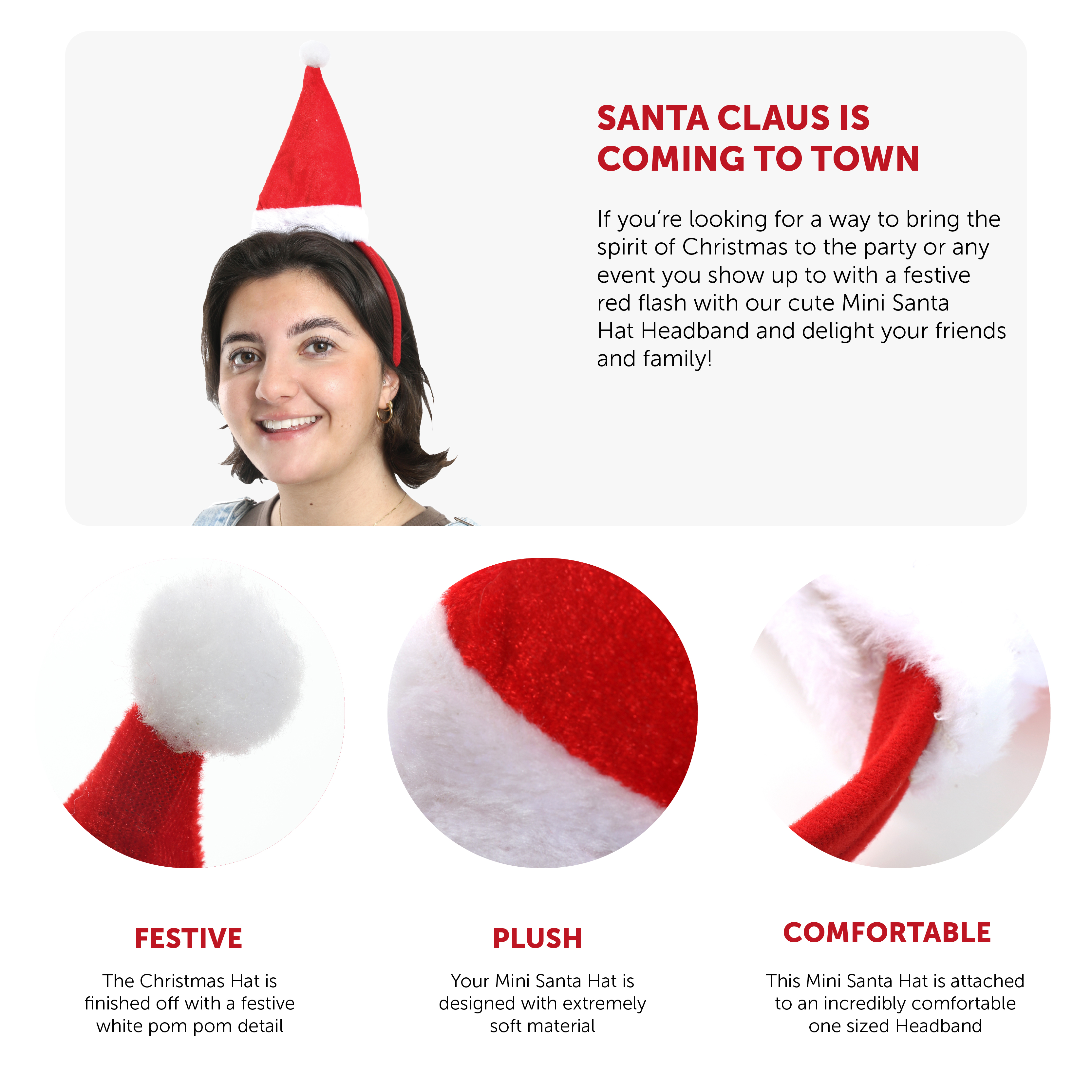 MINI SANTA HAT DETAILS: Your Mini Santa Hat has a Red and White classic Santa design, with a fluffy base and pom-pom tip, all of this sits firmly on top of your headband!