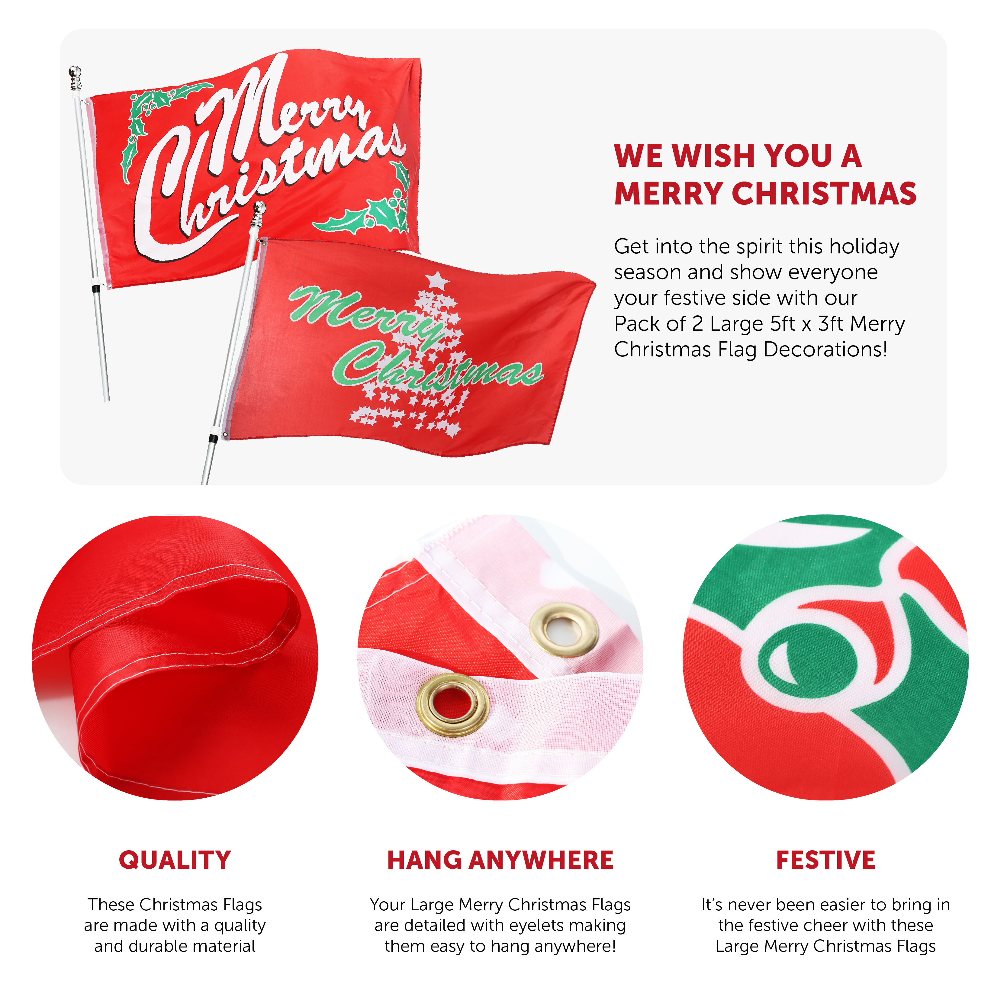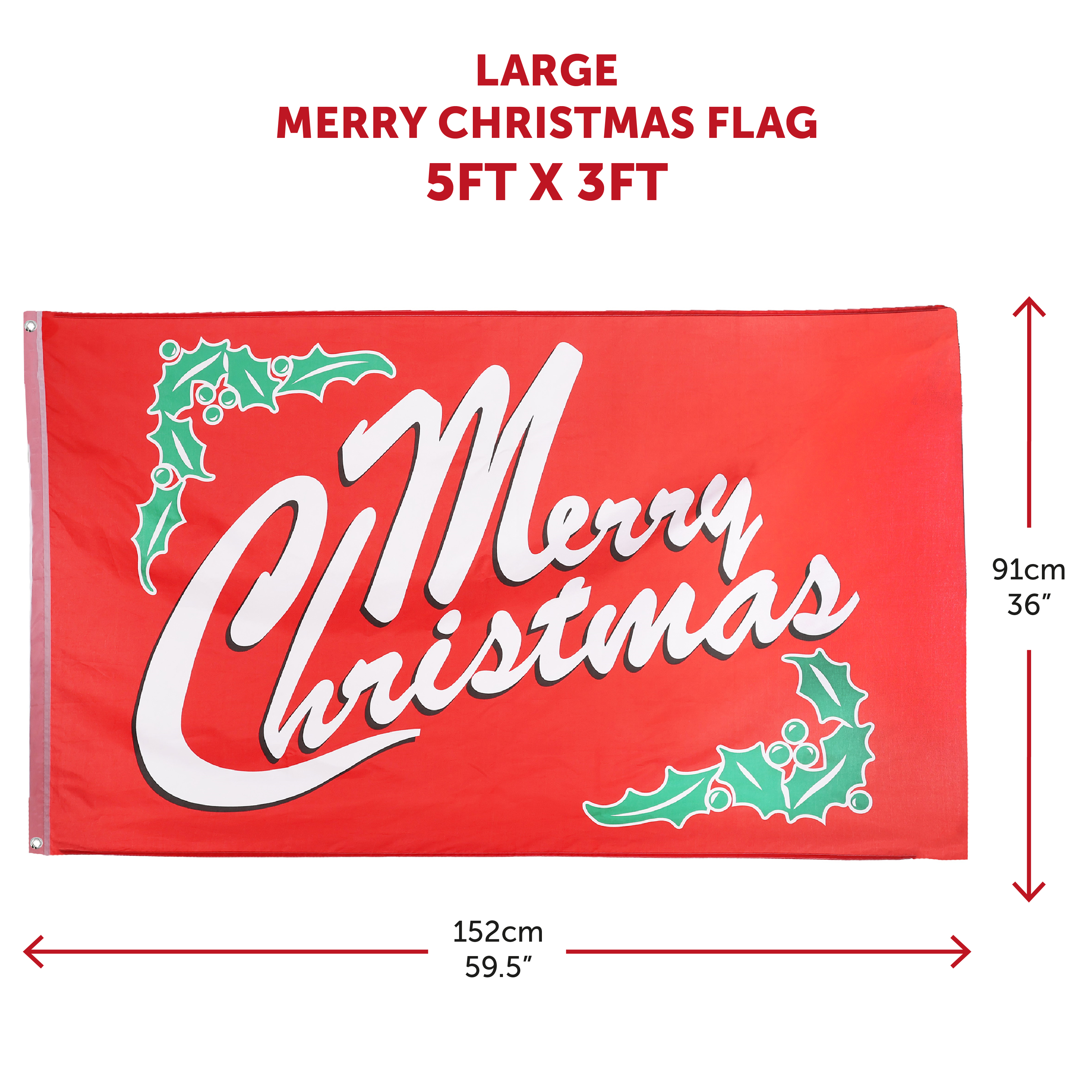 FLAG DETAILS: This Pack of 2 Christmas Flags includes 2x different designed Flags including 1x vibrant Red Flag with 'Merry Christmas' written across the front in a Green font and a Christmas Tree made from White Stars in the center, and 1x vibrant Red Flag with 'Merry Christmas' written across the front and Green Holly detail in the corners! Both of the Flags measure 5ft (60") in Width and 3ft (36") in Height, you'll have the perfect flags to fly high for the holiday season!