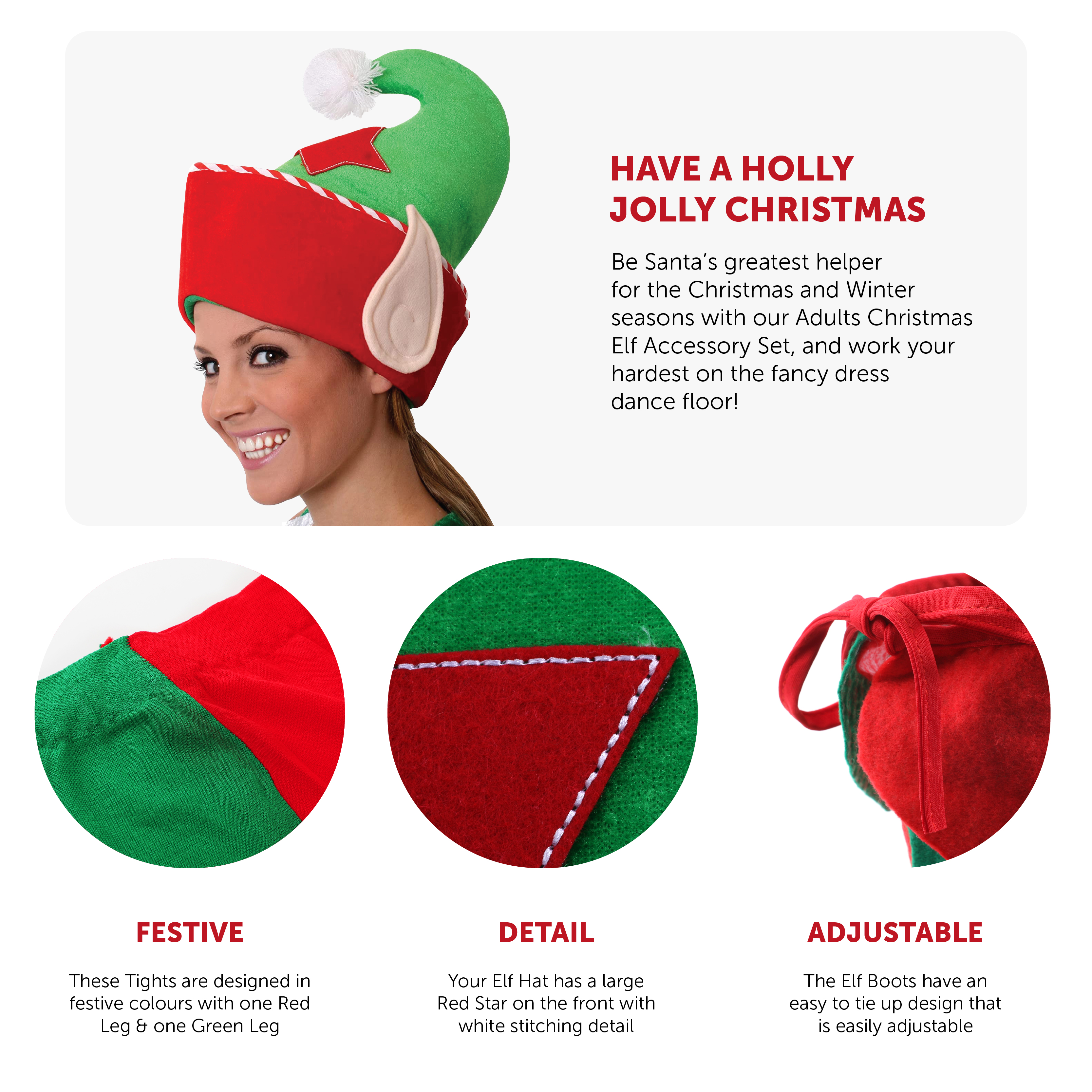 ADULTS CHRISTMAS ELF ACCESSORY SET: Be Santa’s greatest helper for the Christmas and Winter seasons with our Adults Christmas Elf Accessory Set, and work your hardest on the fancy dress dance floor!