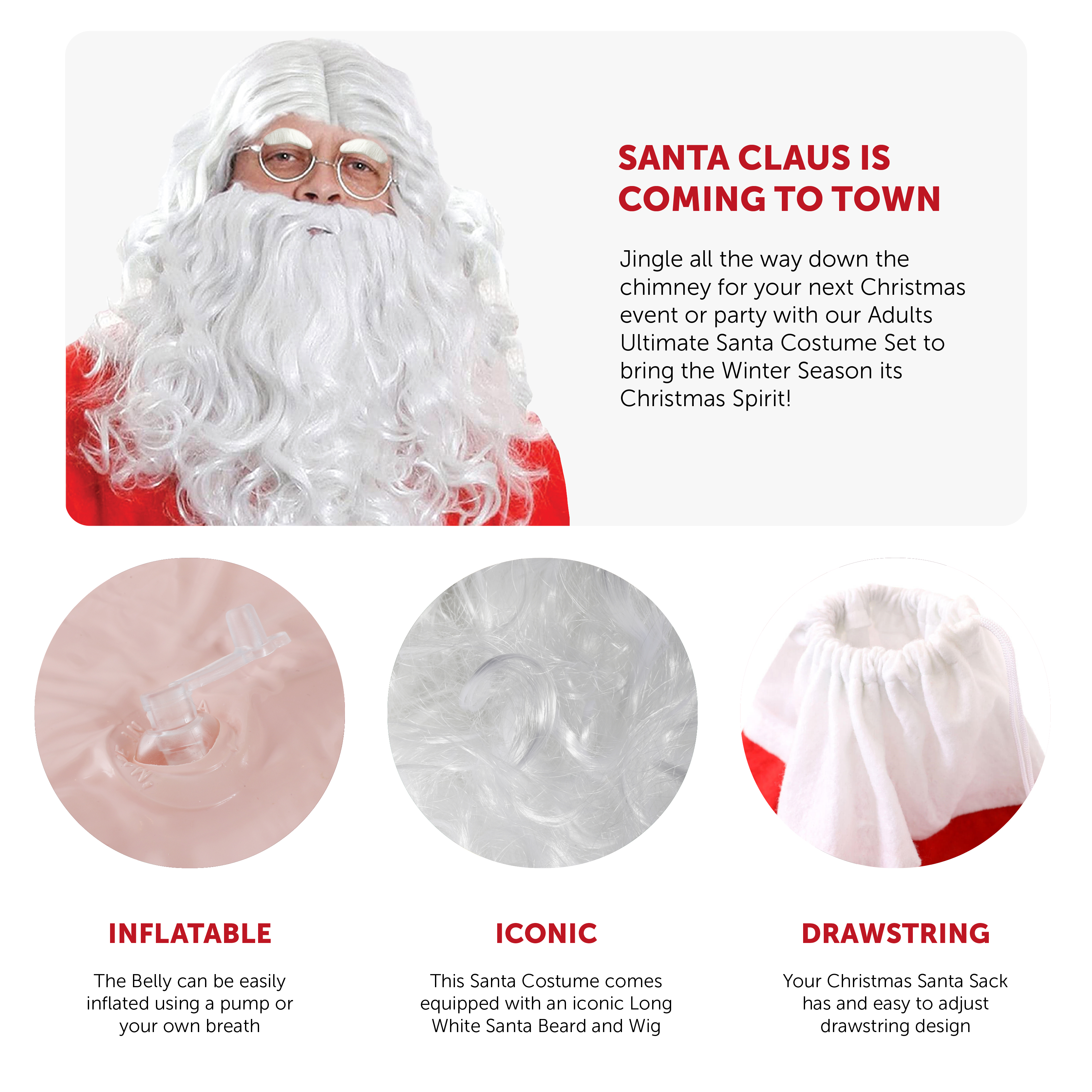 COSTUME INCLUDES: This Santa Costume Set includes a Long White Wig and Beard Set, Adhesive White Eyebrows, Gold Frame Crescent Glasses, White Gloves, Adjustable Red Braces with Metal Clips, Large Santa Sack with a Festive Design, Gold Bell with a Brown Handle, and an Inflatable Belly, the perfect Winter look this year!