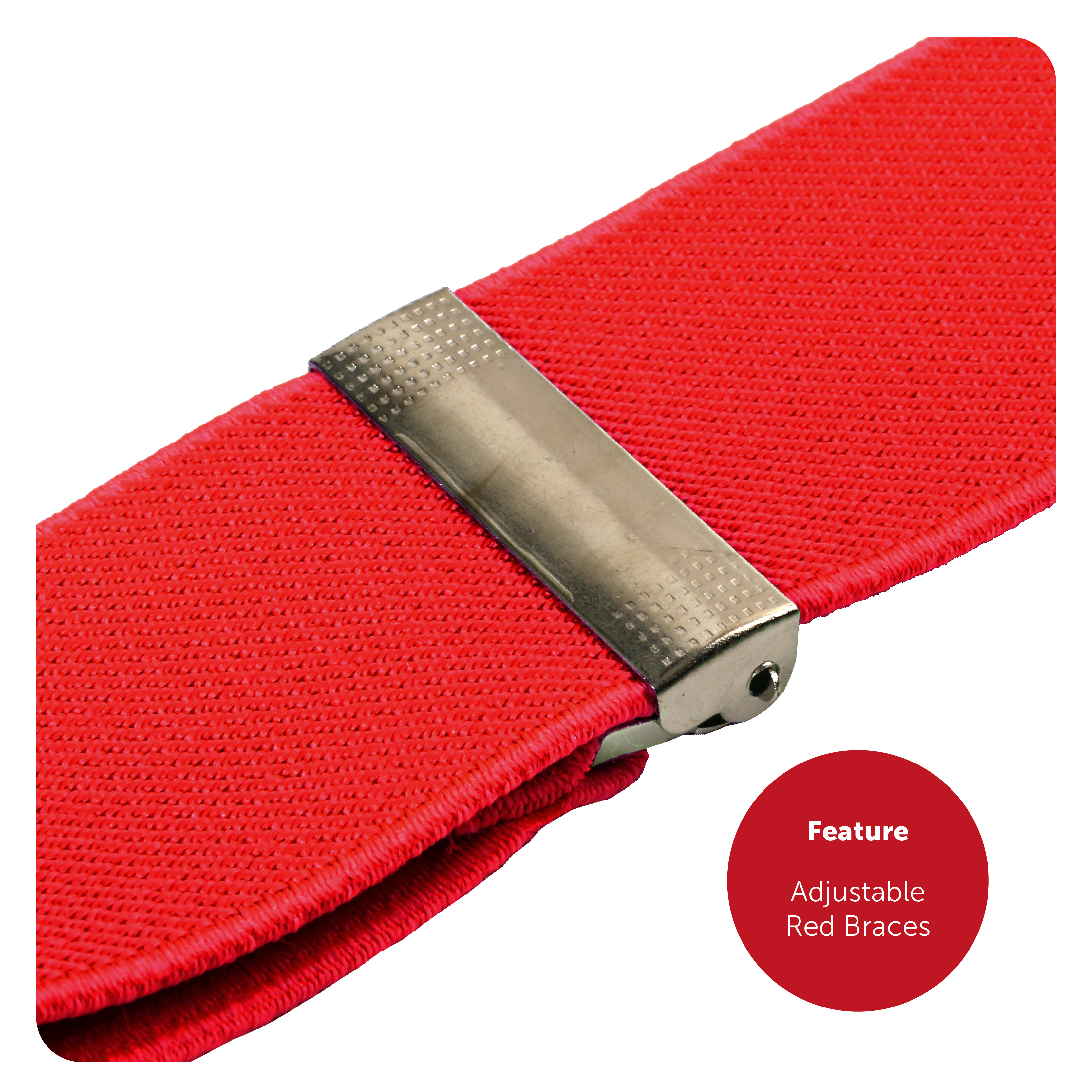 COSTUME INCLUDES: This Santa Costume Set includes a Long White Wig and Beard Set, Adhesive White Eyebrows, Gold Frame Crescent Glasses, White Gloves, Adjustable Red Braces with Metal Clips, Large Santa Sack with a Festive Design, a Black Belt with Gold Buckle, and an Inflatable Belly, the perfect Winter look this year!