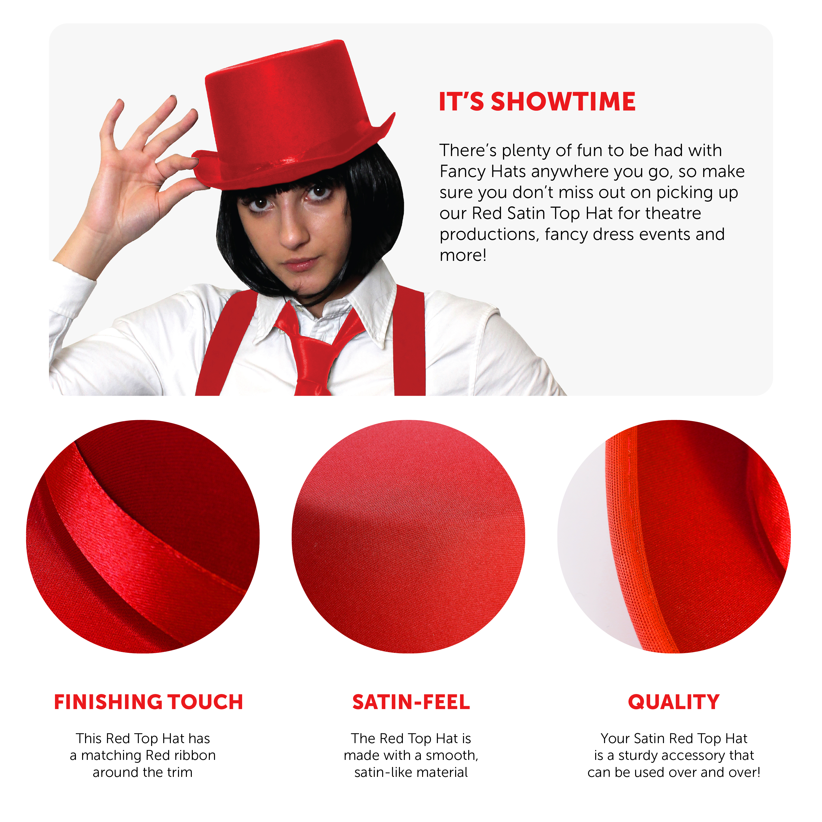 RED SATIN TOP HAT: There’s plenty of fun to be had with Fancy Hats anywhere you go, so make sure you don’t miss out on picking up our Red Satin Top Hat for theatre productions, fancy dress events and more!