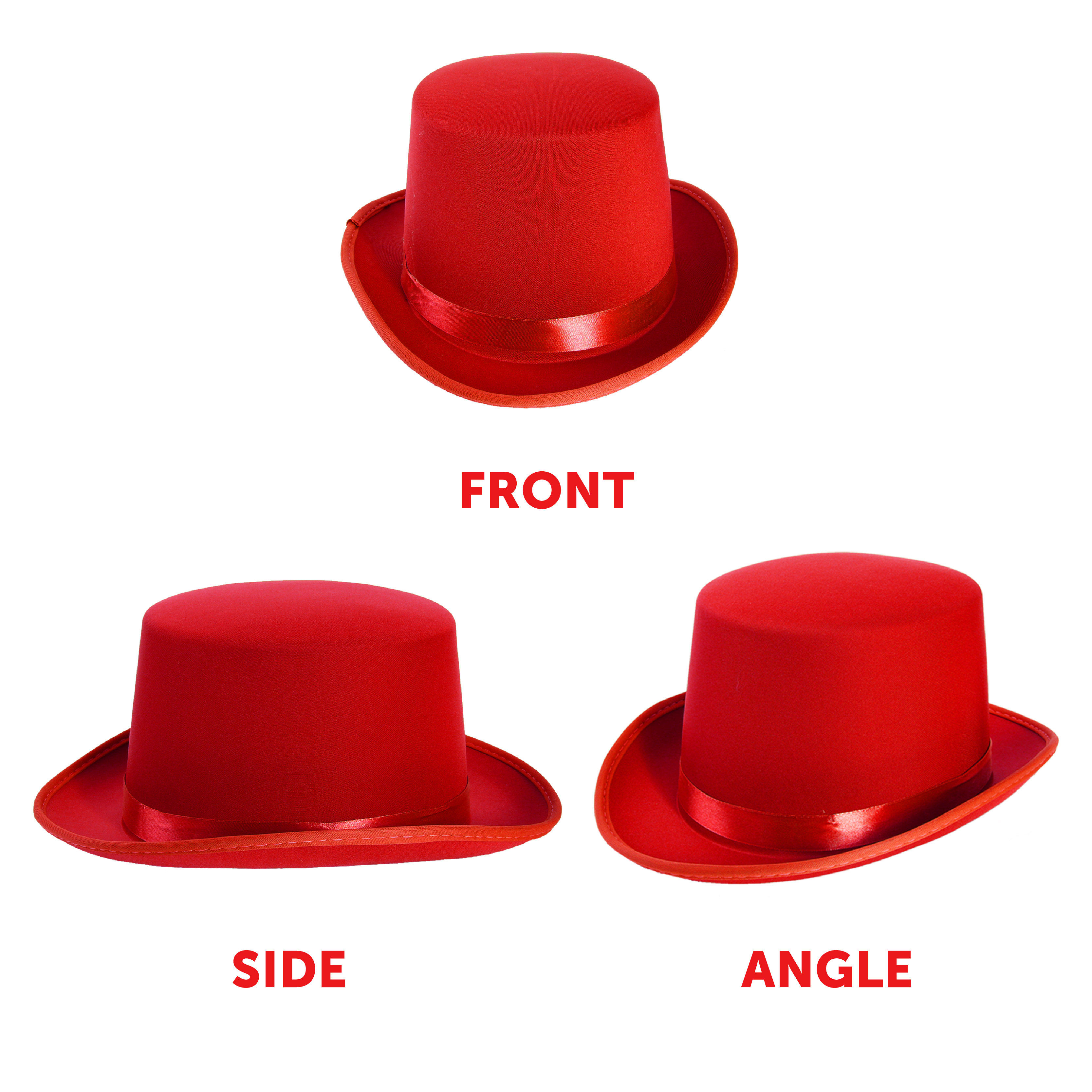TOP HAT DETAILS: This Top Hat is a vibrant Red Hat covered in a smooth satin material, with a matching Red Ribbon band, the perfect way to finish off your fancy dress outfit!