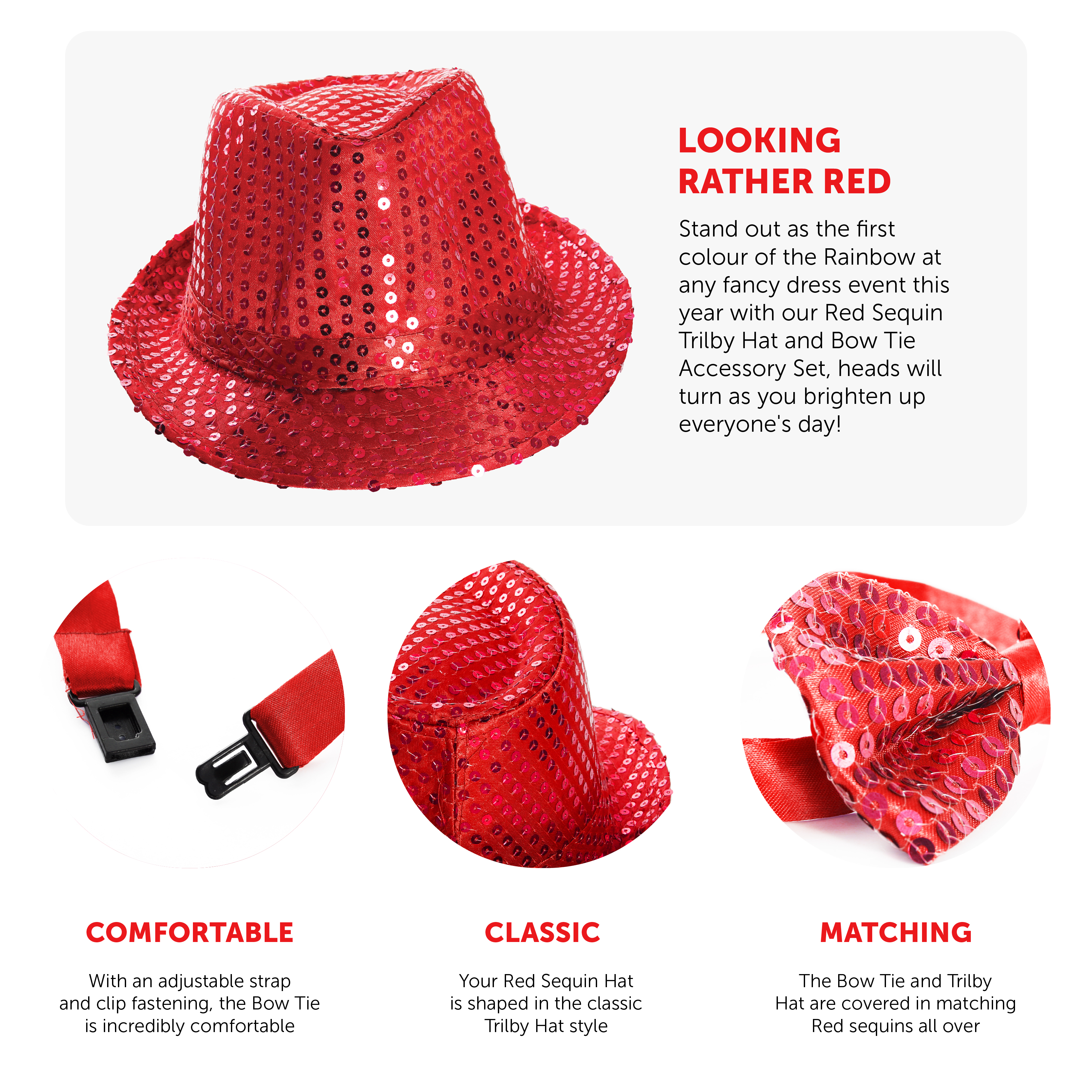 RED SEQUIN TRILBY HAT & BOW TIE ACCESSORY SET: Stand out as the first colour of the Rainbow at any fancy dress event this year with our Red Sequin Trilby Hat and Bow Tie Accessory Set, heads will turn as you brighten up everyone's day!