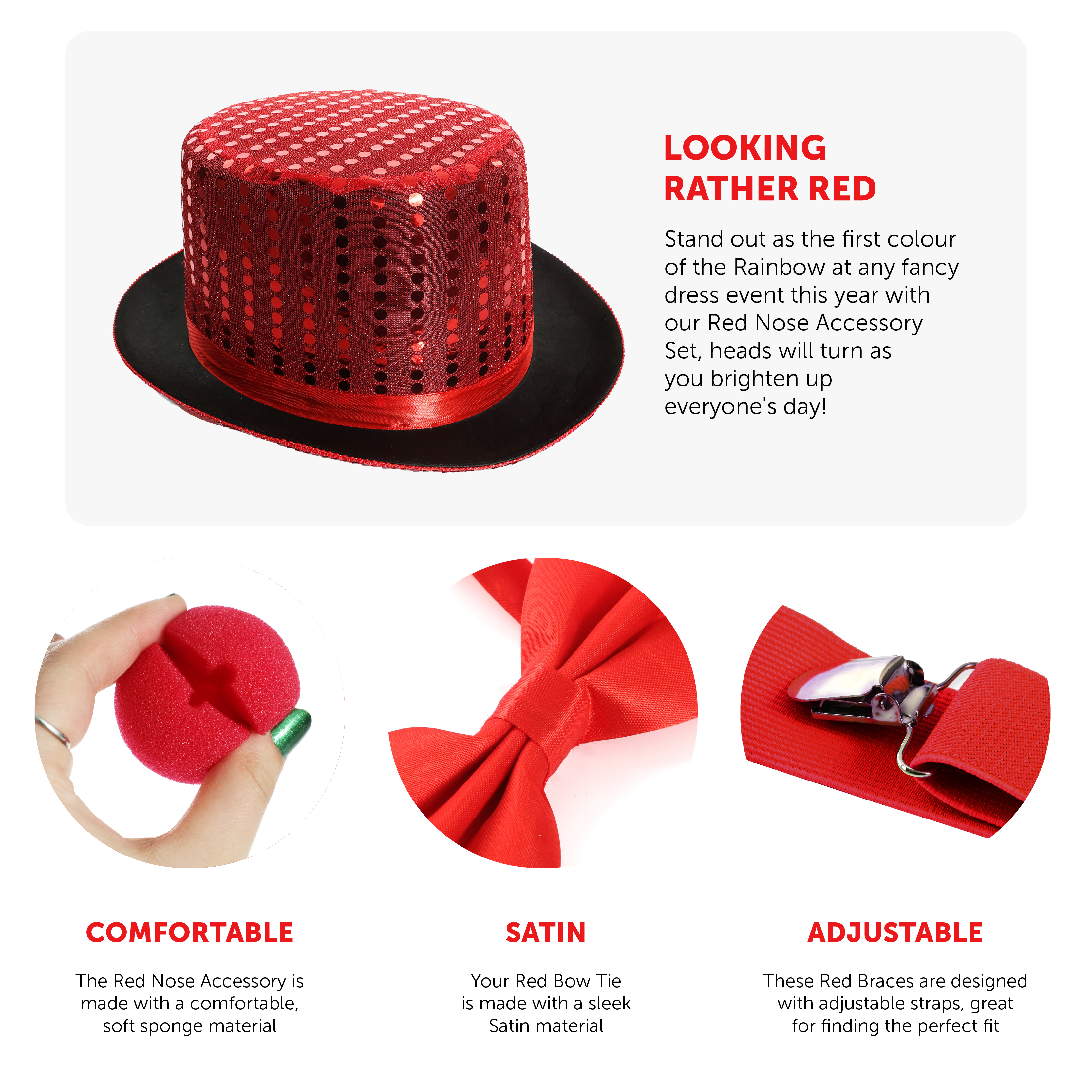SET INCLUDES: Your Red Nose Accessory Set includes a Red Sponge Nose, a Red Top Hat covered in Sequins, adjustable Red Braces and an adjustable Red Satin Bow Tie, to complete your look!