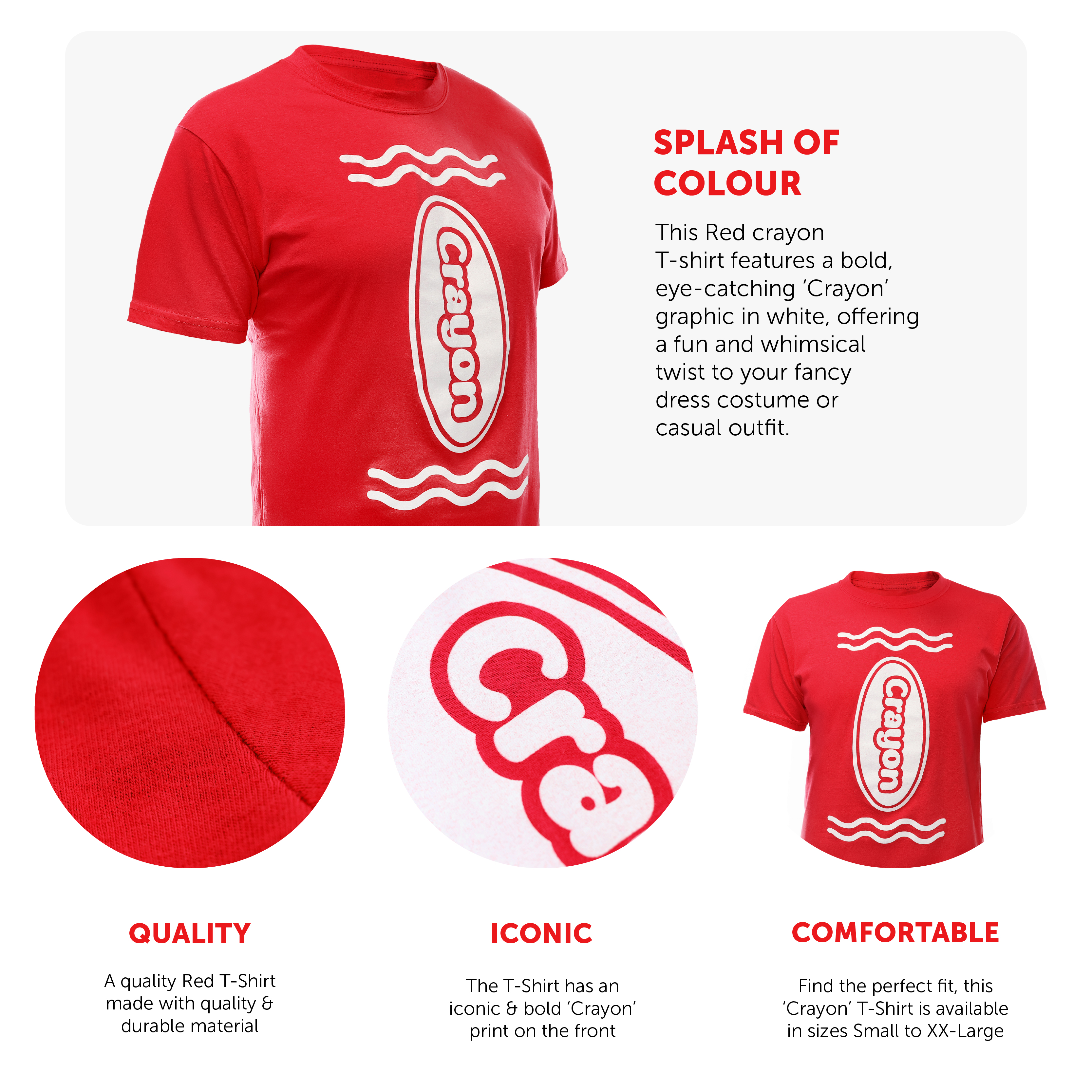 FUN AND CREATIVE DESIGN: This Red crayon T-shirt features a bold, eye-catching "Crayon" graphic in white, offering a fun and whimsical twist to your fancy dress costume or casual outfit.
