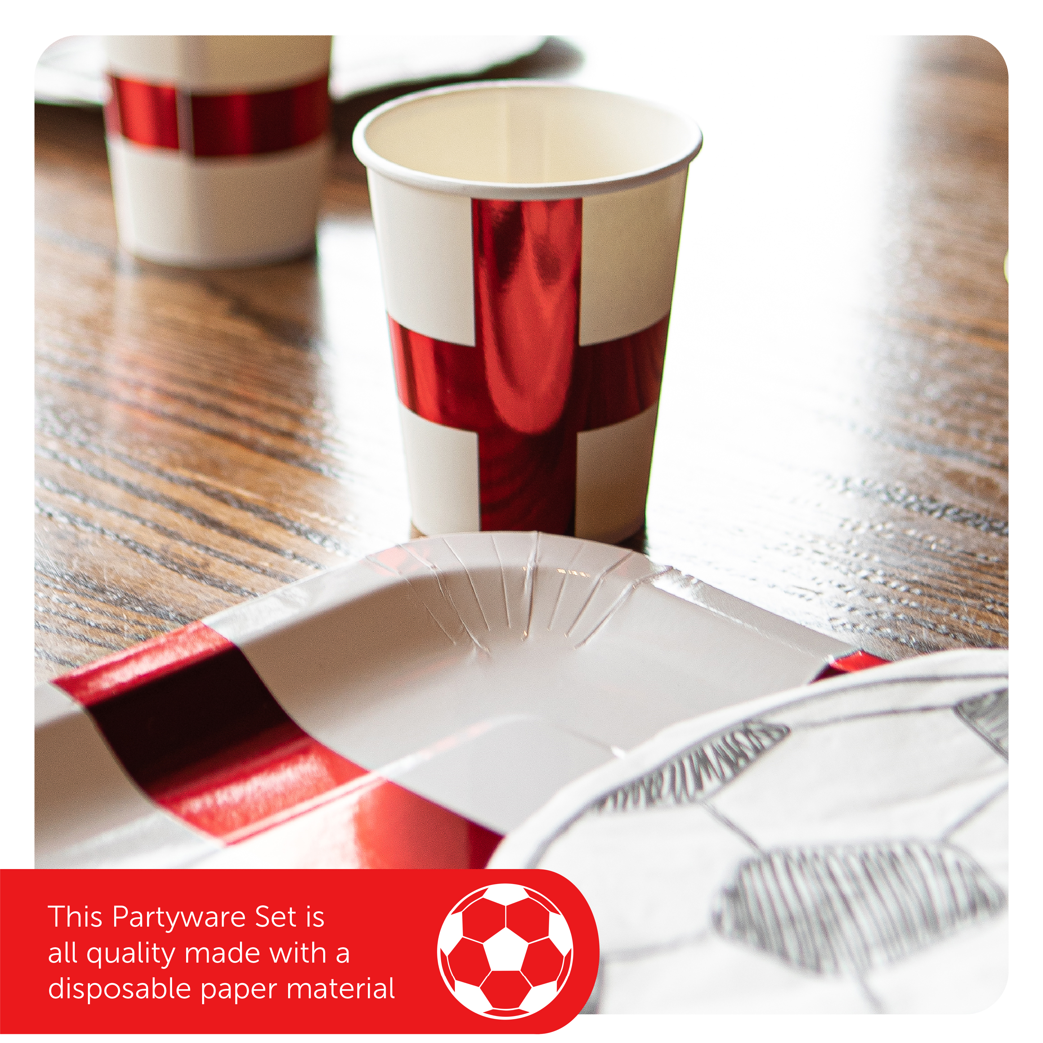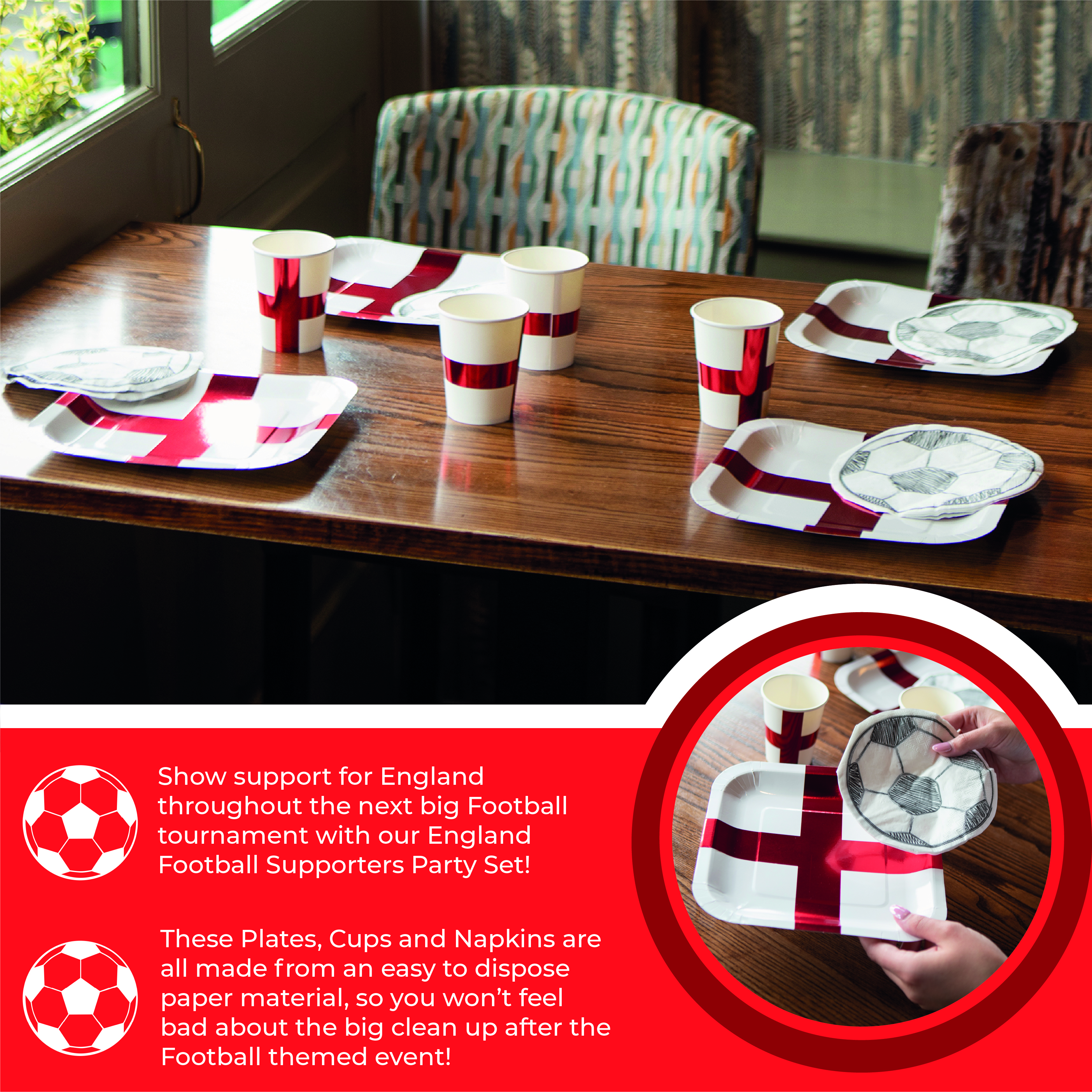 SET INCLUDES: This England Football Supporters Party Set includes 10x Square Paper Plates with a Red Foil St George's Cross, 10x matching Paper Cups with a St George's Cross design, and 20x Football Shaped Napkins, the perfect set to support your Country at any English event!