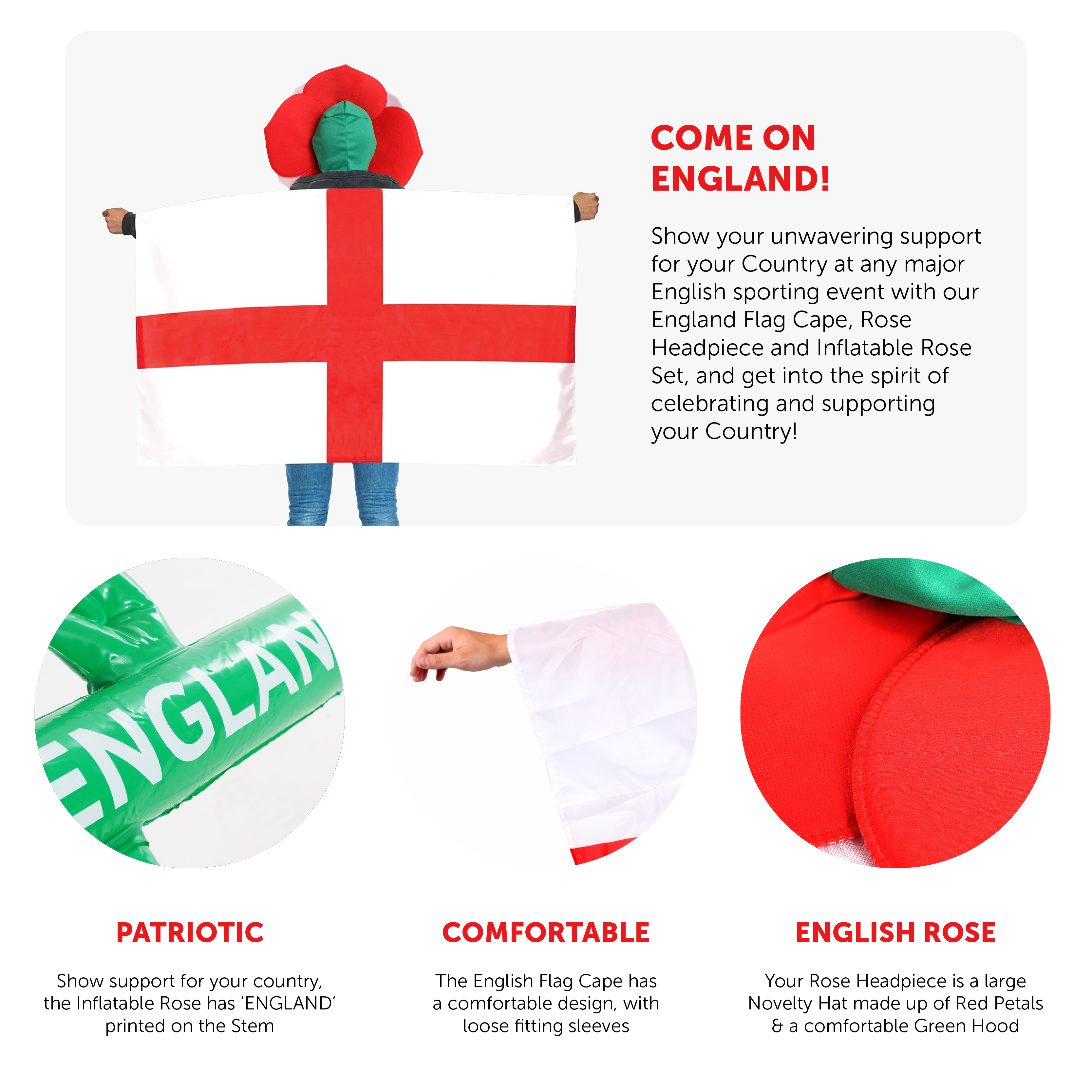 ENGLAND FLAG CAPE, ROSE HEADPIECE & INFLATABLE ROSE: Show your unwavering support for your Country at any major English sporting event with our England Flag Cape, Rose Headpiece and Inflatable Rose Set, and get into the spirit of celebrating and supporting your Country!
