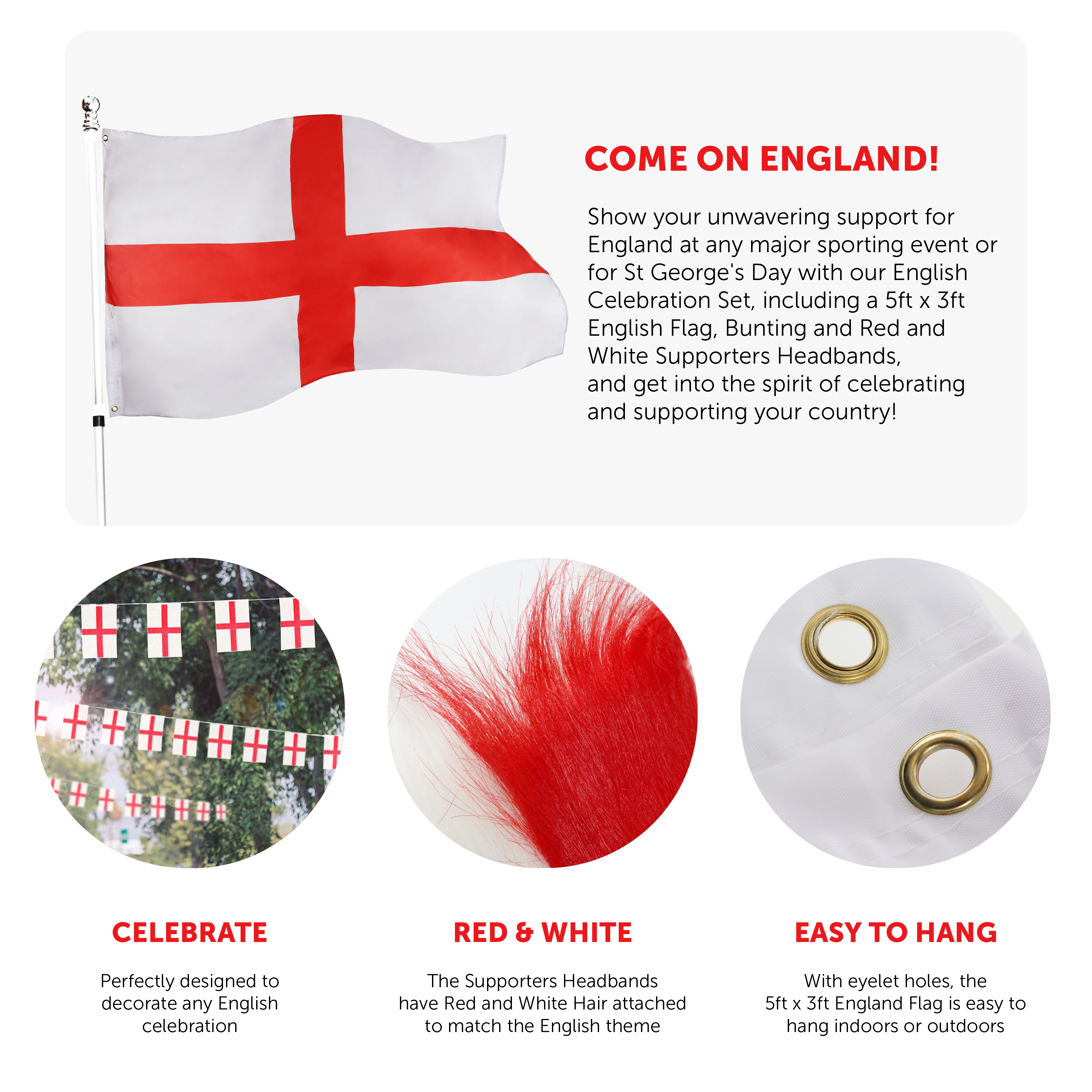 PERFECT FOR ANY ENGLISH CELEBRATIONS: Whether it be for Football, St George's Day, Rugby, or any other English event you need to attend, then make sure you’re not missing out on picking up our 5ft x 3ft English Flag, Bunting and Red and White Supporters Headbands!